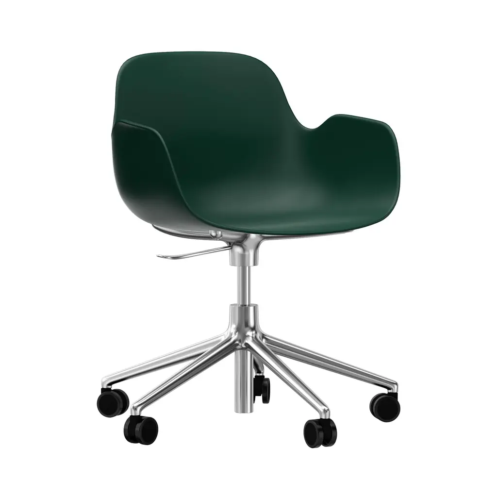 With this swivel-based version, designer Simon Legald pivots the role of his signature Form Chair for Normann Copenhagen with a comforting turn at the dining or work table in mind. Four slim arms grip the chair shell. Those same "arms" meet in a rotating centerpiece and then become legs, branching out to the ground. The aluminum base is available polished or lacquered in black or white. Swivel is only one of the many bases of the Form seating series, which also comes as an armchair and in bar and counter heights, as well as upholstery. The result is some 40,0000 possible combinations.
