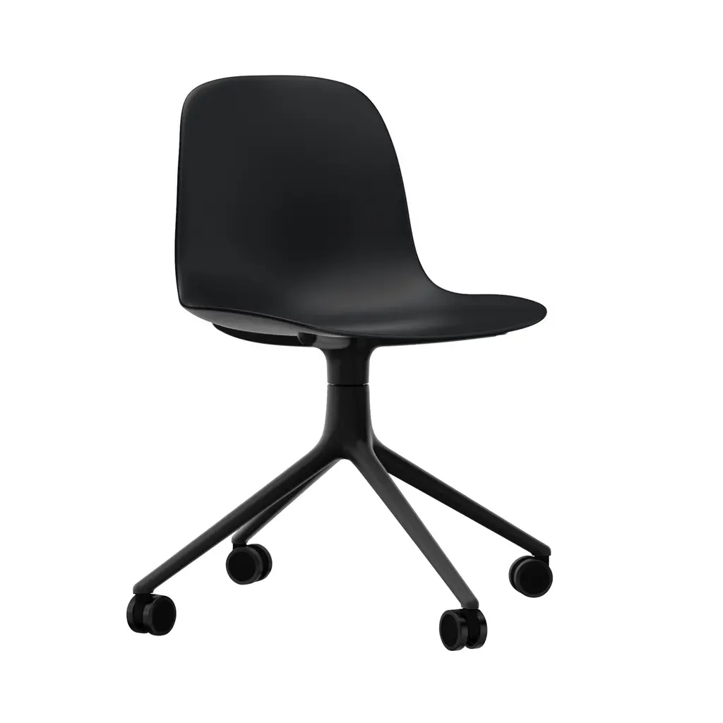 With this swivel-based version, designer Simon Legald pivots the role of his signature Form Chair for Normann Copenhagen with a comforting turn at the dining or work table in mind. Four slim arms grip the chair shell. Those same "arms" meet in a rotating centerpiece and then become legs, branching out to the ground. The aluminum base is available polished or lacquered in black or white. Swivel is only one of the many bases of the Form seating series, which also comes as an armchair and in bar and counter heights, as well as upholstery. The result is some 40,0000 possible combinations.