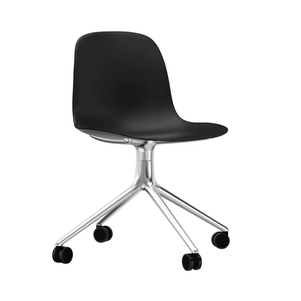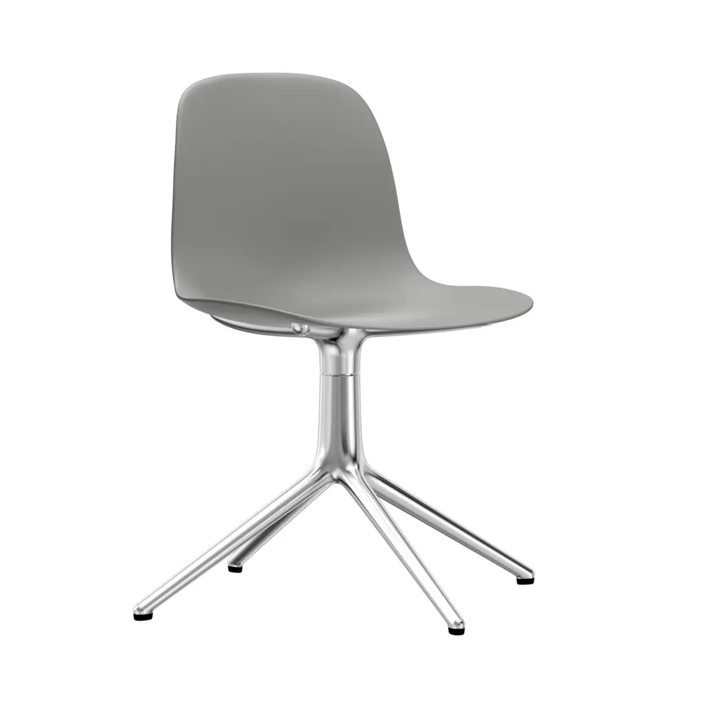 With this swivel-based version, designer Simon Legald pivots the role of his signature Form Chair for Normann Copenhagen with a comforting turn at the dining or work table in mind. Four slim arms grip the chair shell. Those same "arms" meet in a rotating centerpiece and then become legs, branching out to the ground. The aluminum base is available polished or lacquered in black or white. Swivel is only one of the many bases of the Form seating series, which also comes as an armchair and in bar and counter heights, as well as upholstery. The result is some 40,0000 possible combinations.