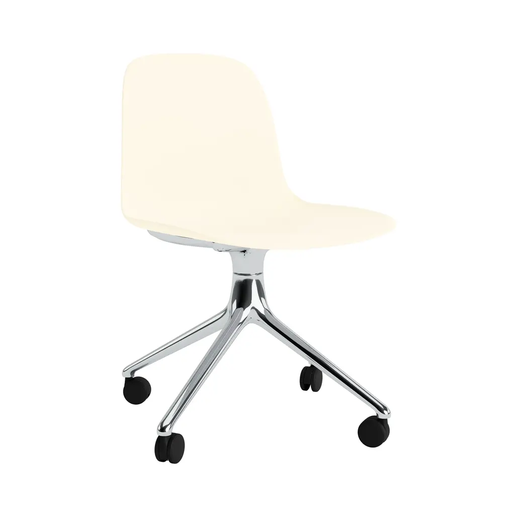 With this swivel-based version, designer Simon Legald pivots the role of his signature Form Chair for Normann Copenhagen with a comforting turn at the dining or work table in mind. Four slim arms grip the chair shell. Those same "arms" meet in a rotating centerpiece and then become legs, branching out to the ground. The aluminum base is available polished or lacquered in black or white. Swivel is only one of the many bases of the Form seating series, which also comes as an armchair and in bar and counter heights, as well as upholstery. The result is some 40,0000 possible combinations.
