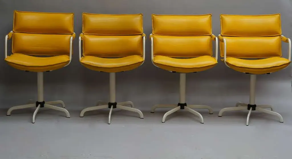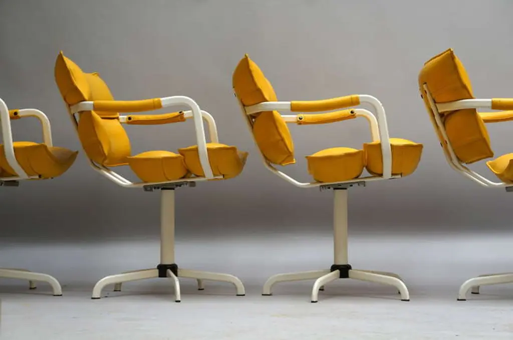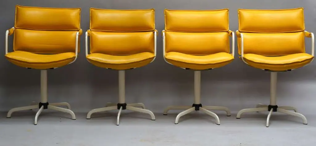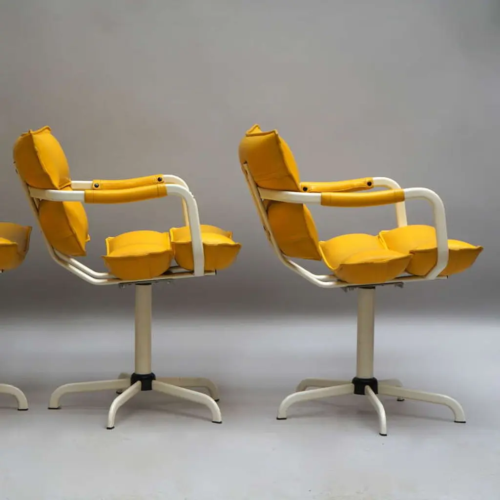 Four swivel chairs in yellow leather and white base.This original condition, set off four, easy swivel arm chairs in yellow leather upholstery.These are from the 1970s.Measures: Height 85 cm.Seat height 54 cm.