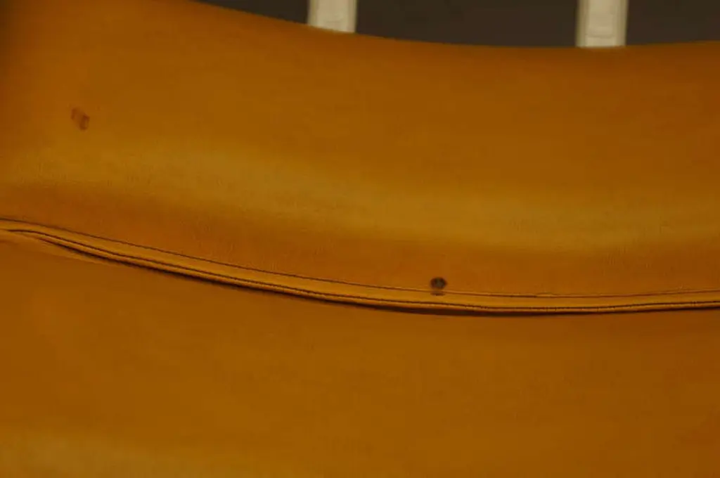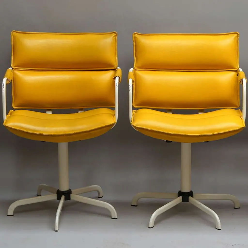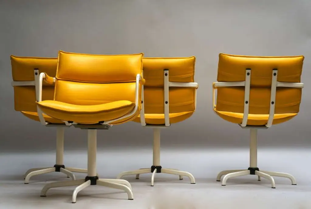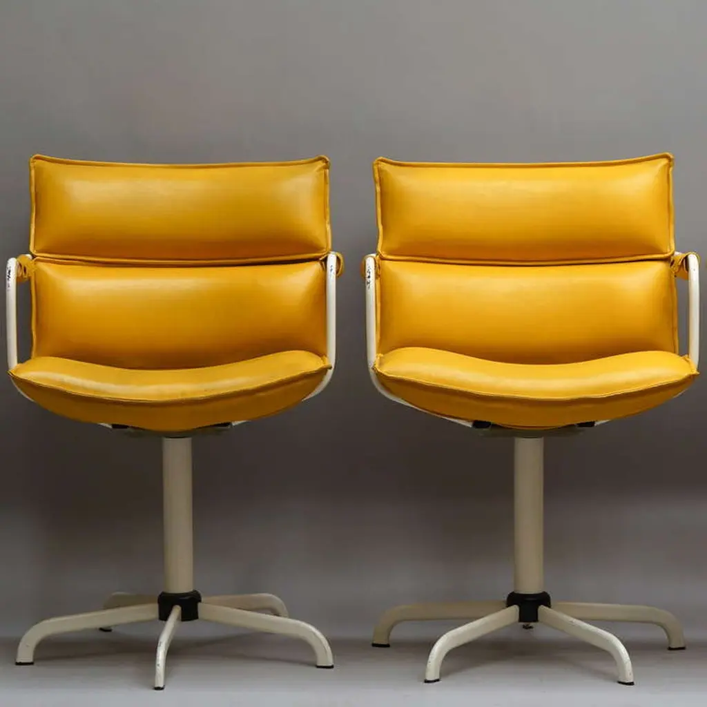 Four swivel chairs in yellow leather and white base.This original condition, set off four, easy swivel arm chairs in yellow leather upholstery.These are from the 1970s.Measures: Height 85 cm.Seat height 54 cm.
