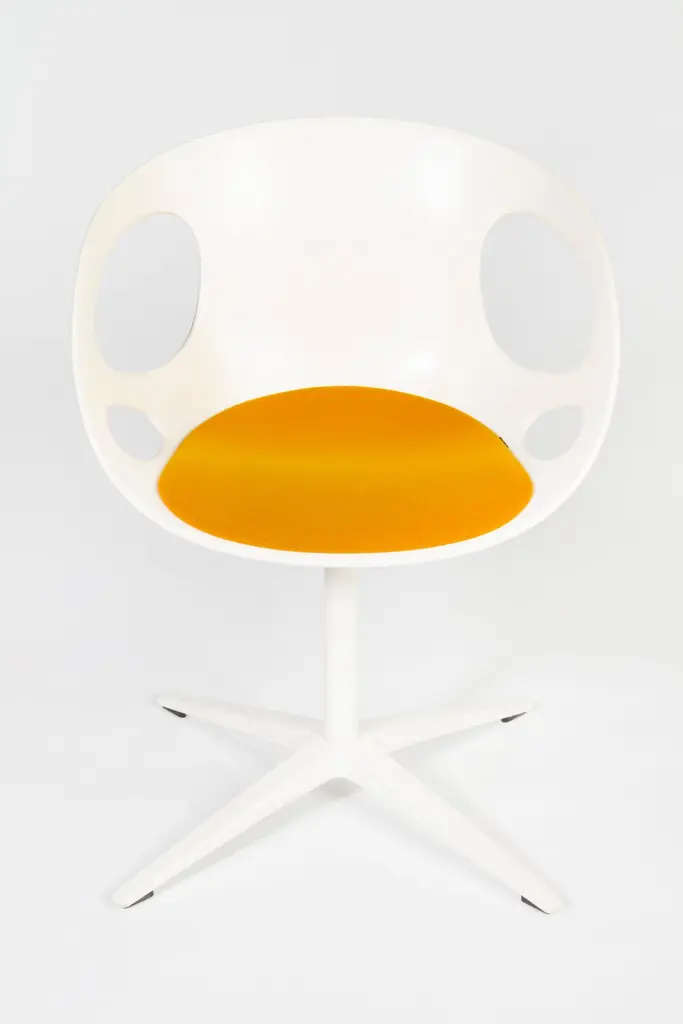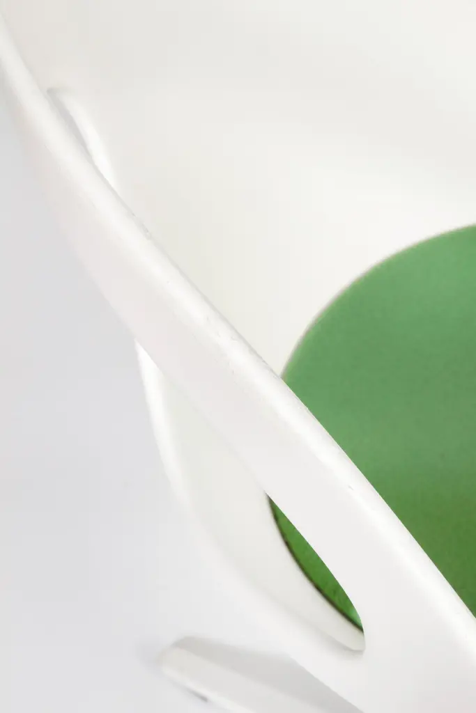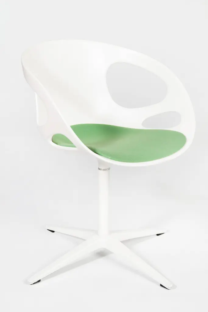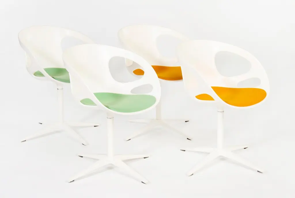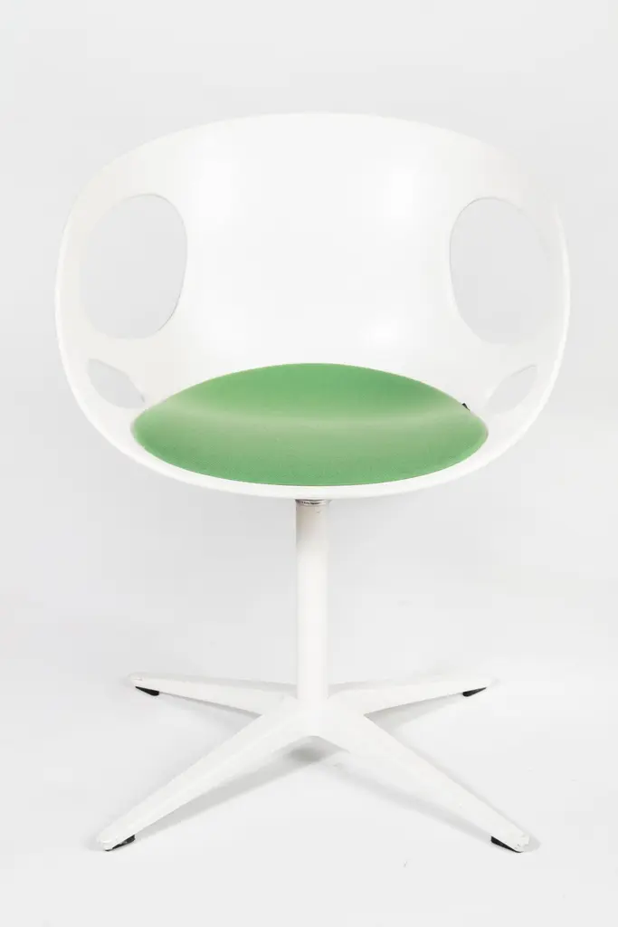 Rin dining swivel chair sets of 2 manufactured by Danish Fritz Hansen, in collaboration with Japanese designer Hiromichi Konno.The design is inspired by natural ideal forms of birds' nests.With their elegant silhouettes, the pieces can serve various purposes in dining, living and office spaces.The chairs are equiped with high-quality swivels, that allow 360 degree rotation.The white plastic moulds show traces of usage, the green and yellow upholstery has maintained its original flair.The fusion of Danish and Japanese design renders any interieur a contemporary and modern elegance.
