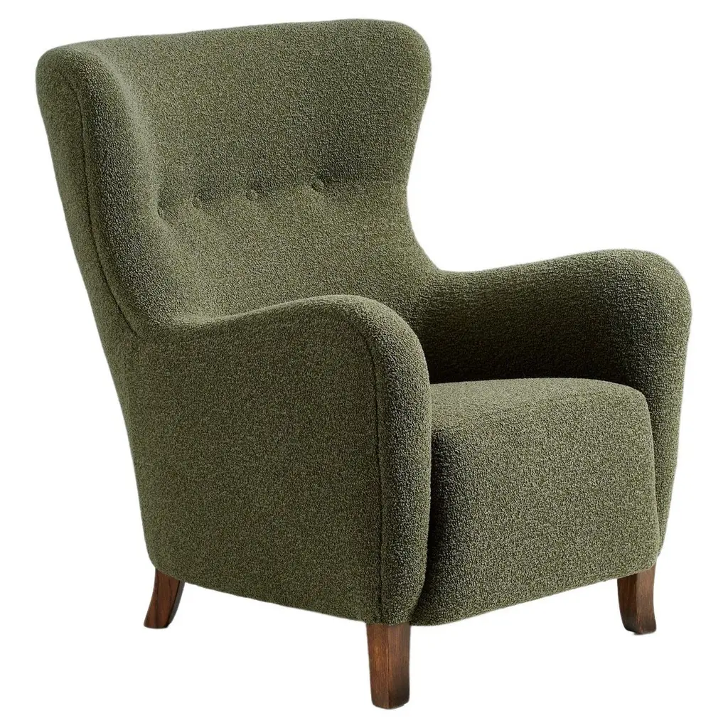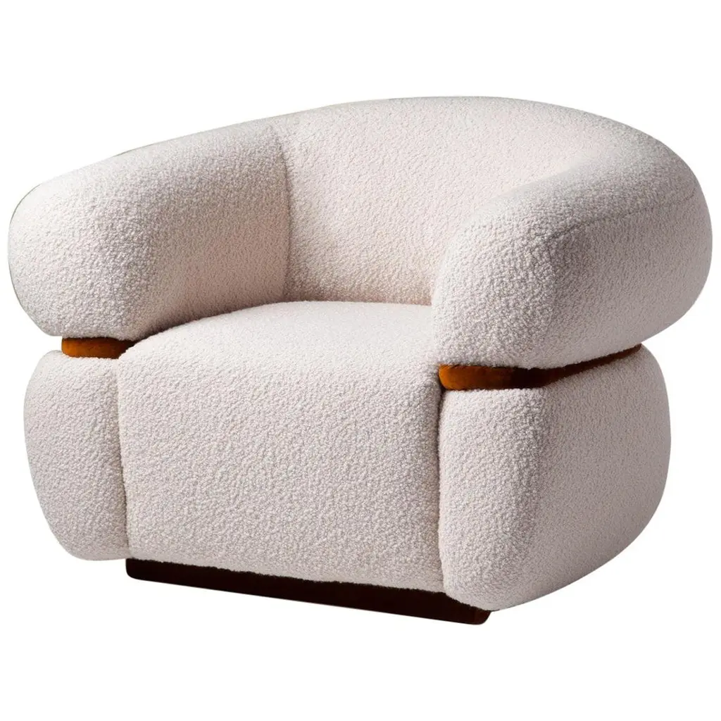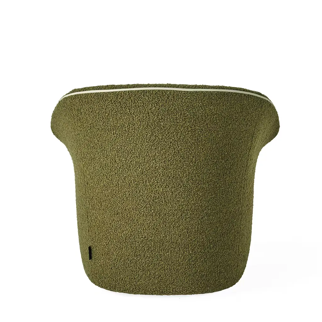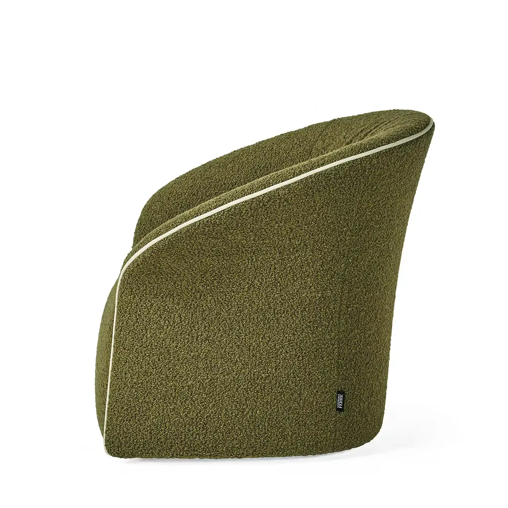 The Fulham swivel armchair blends organic, rounded shapes with harmonious proportions. Inspired by contemporary style with 70s vintage flair, it features a birch plywood structure and high-density polyurethane foam for comfort. Upholstered in soft green bouclé fabric, it is accented with piping in leather Young Nabuk. The swivel base enhances its functionality, making it a stylish addition to any room.