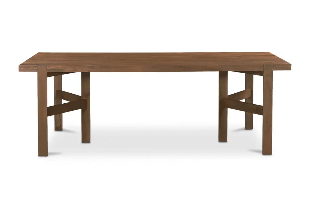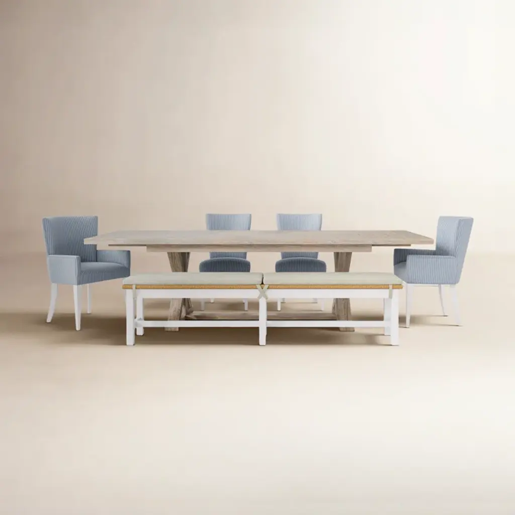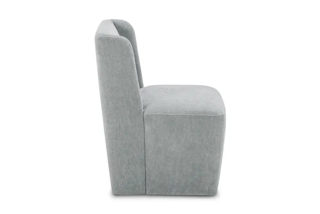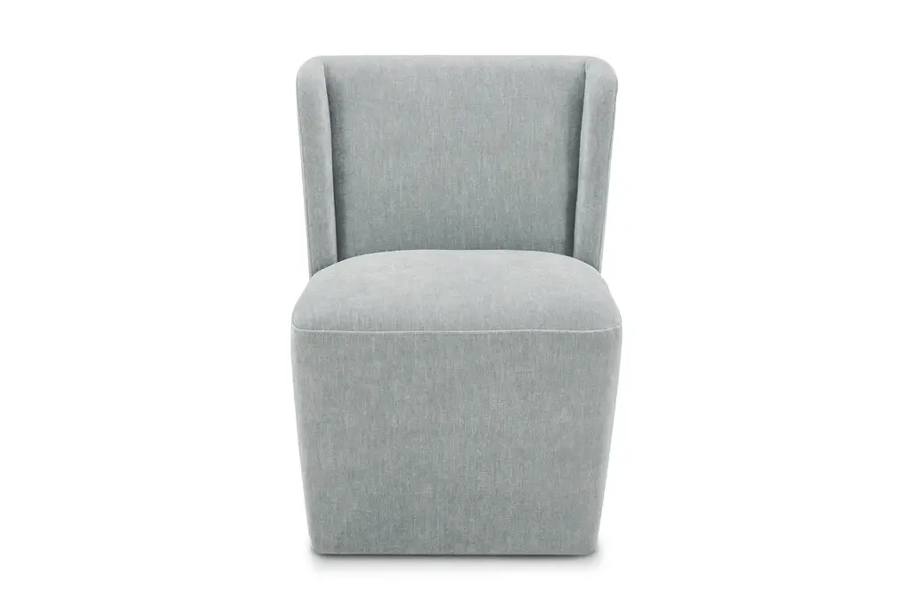 The Gallagher/Darla Dining Bundle pairs one Gallagher Dining Table with four slate green Darla Rolling Dining Chairs. Invite a touch of natural charm into your dining room with the Gallagher Dining Table. It features eco-friendly mango wood construction, sandblasted with a warm brown finish that showcases the wood's natural grain variations. The silhouette is unique and contemporary, balancing a sleek rectangular surface atop angular, geometrically configured legs. Its generous size comfortably seats up to six people. Prominent joinery adds visual interest to the table and showcases its high-quality craftsmanship. Experience cloud-like comfort with the luxurious Darla Rolling Dining Chair. Sink into its generously padded high-density foam seat cushion and backrest, wrapped in soft, durable polyester fabric. Metal casters and a 360-degree swivel mechanism provide convenient mobility. Darla Chair effortlessly enhances any space, making dining a delight.
