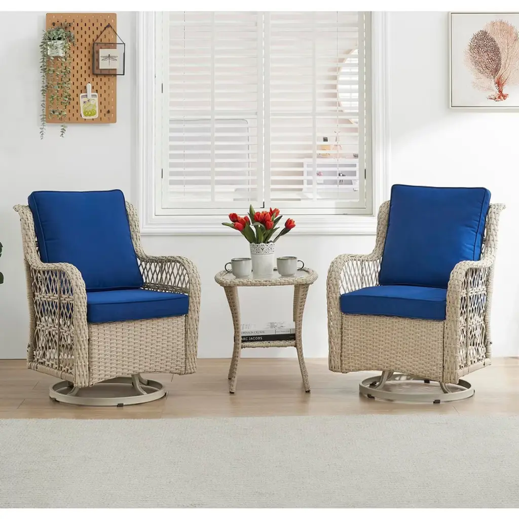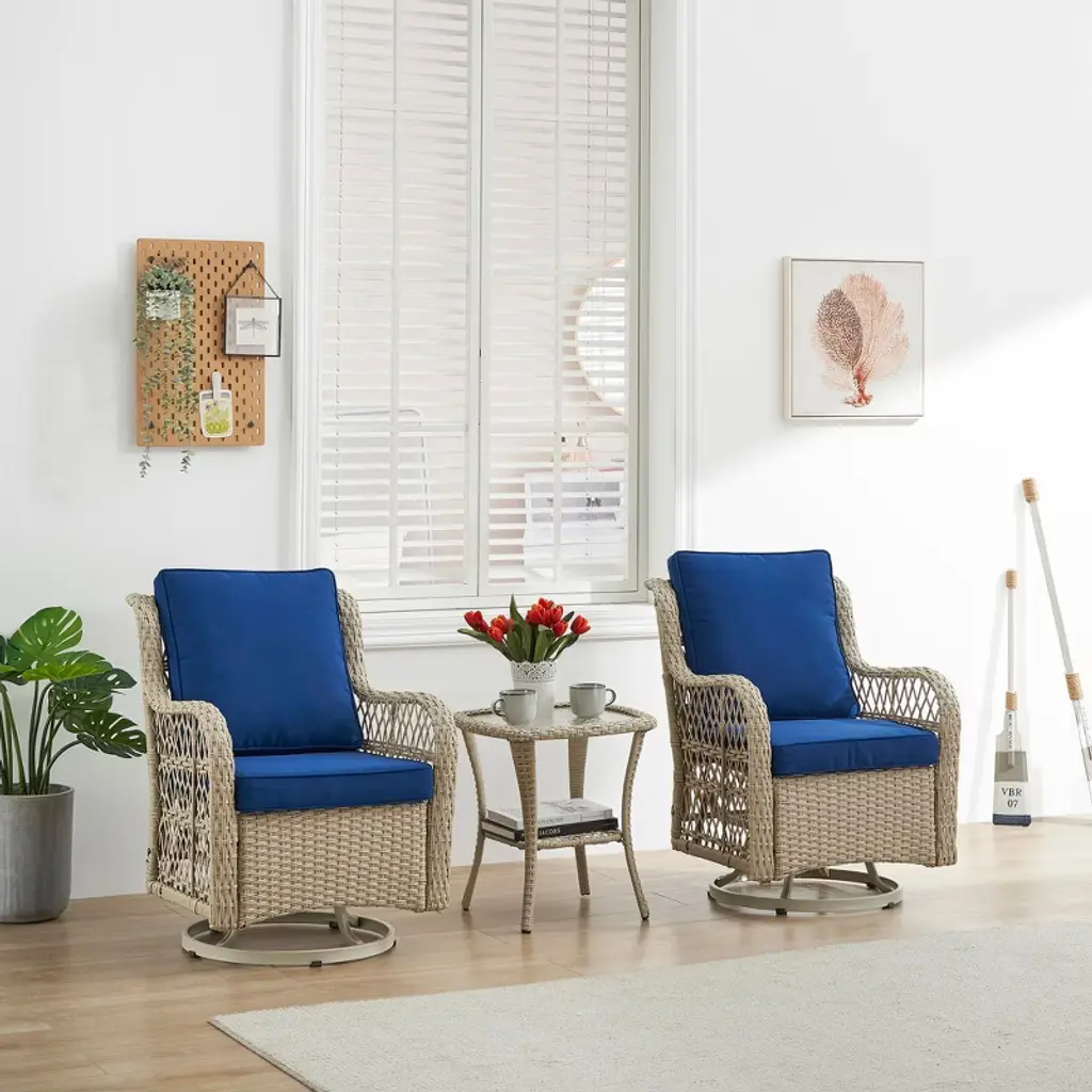 Garvee 3 Pieces Outdoor Swivel Rocker Set, 2 Chairs And Side Table, 360¡ã Rotation, Patio, Porch, Pool (Wood Color/blue Cushion)