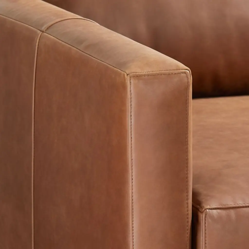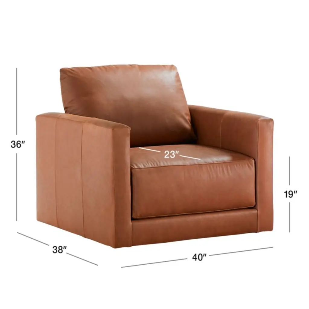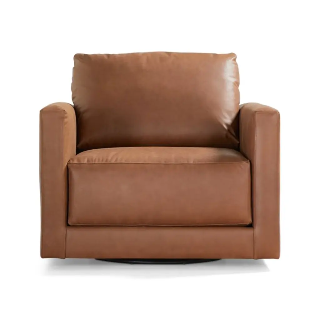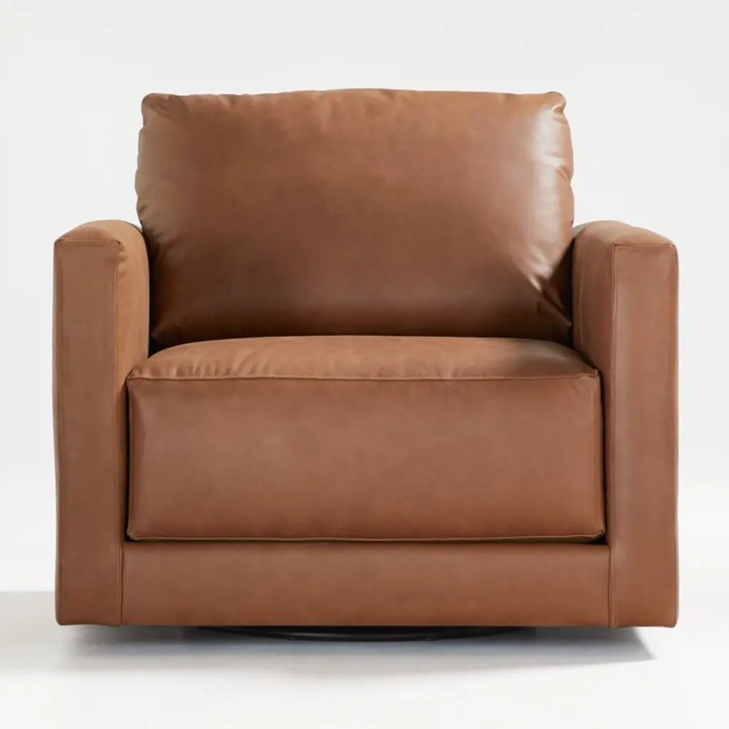 Striking the perfect balance between maximum comfort and modern style, Gather is clean-lined and current. Sized for smaller spaces, the swivel chair is upholstered in exquisite leather upholstery for a luxurious look and buttery soft hand. A boxy, extra-plush seat cushion made with inner-coil construction offers maximum comfort and durability, while the fiber-filled back cushion settles you in for the ultimate lounge.