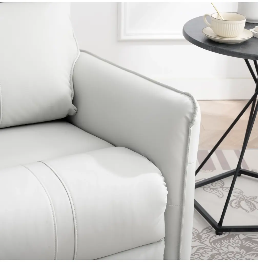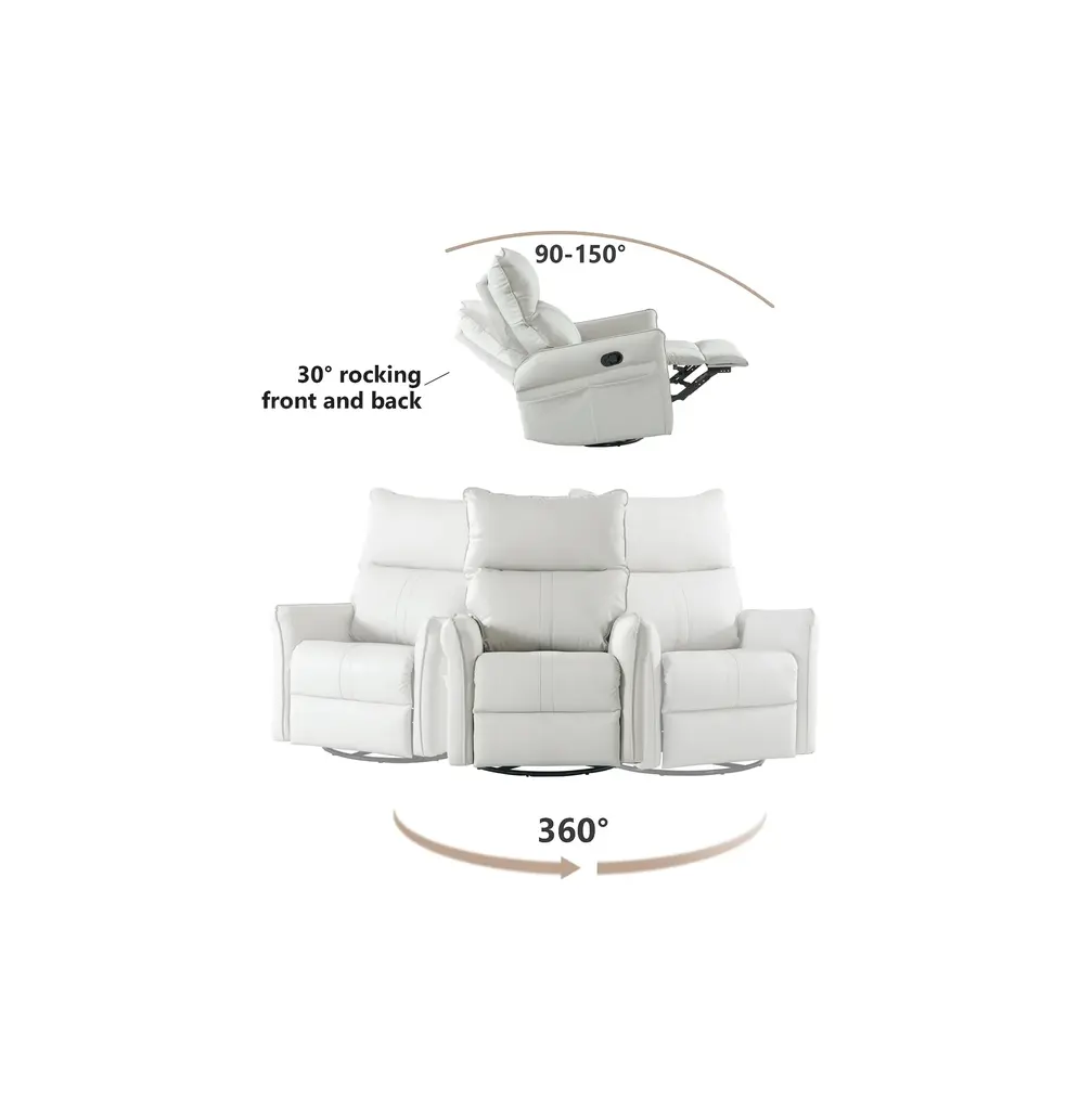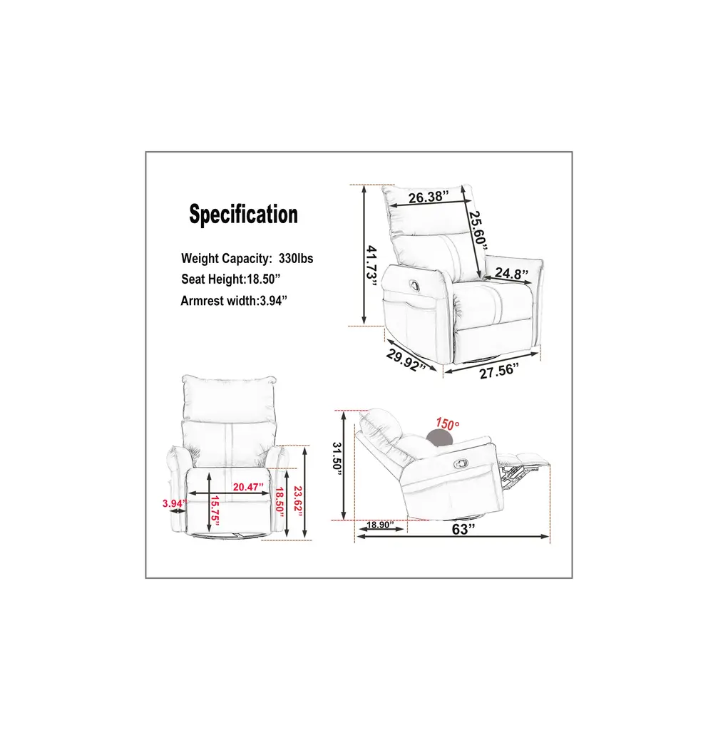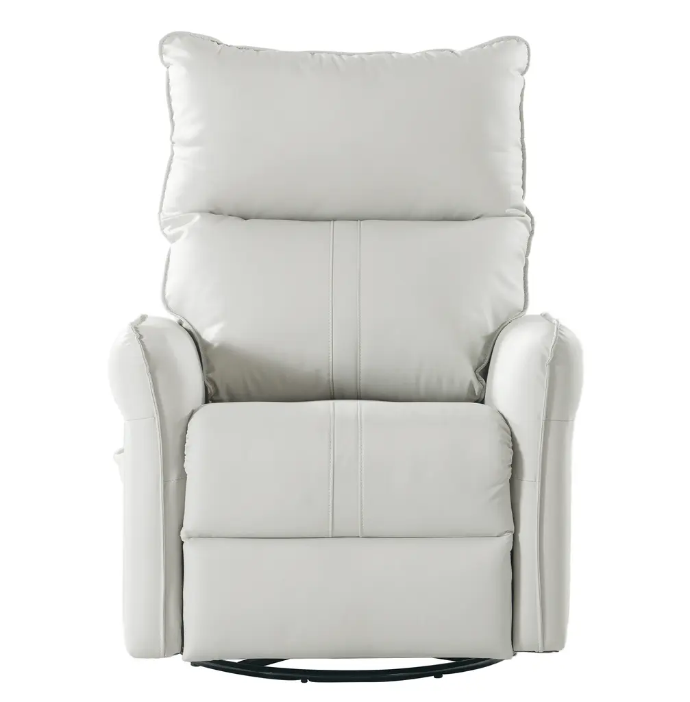Ultimate Relaxation Experience: Discover the perfect blend of comfort and functionality with our 360 swivel rocking recliner chair. Effortlessly glide back and forth while enjoying your favorite movie or chatting with friends. With a simple pull of the side buckle, you can recline and stretch out, enhancing your lounging experience to the fullest.Plush and Inviting Design: This recliner chair features a soft PU leather surface with a chic finish that elevates any living space. The generously padded seat is designed for long hours of comfort, making it an excellent addition to family rooms or nurseries. Plus, the two side pockets ensure that your essentials, like remotes and books, are always within arm's reach.Premium Quality Construction and Materials: Built with a strong metal and wood frame, this rocking recliner is designed to support up to 330 lbs. The high-density sponge cushioning provides exceptional comfort and durability, ensuring that the chair maintains its shape and support over time. Enjoy peace of mind with a chair that combines style and sturdiness.Perfect for Nurseries and Beyond: This chair is ideal for soothing babies with its gentle rocking motion and comfortable padded seat and backrest. The sturdy construction provides reliable support, while its compact size makes it perfect for smaller spaces. It's a versatile piece for any room.Quick and Easy Assembly: Setting up your new recliner is hassle-free with our straightforward assembly instructions. The compact design allows it to fit effortlessly into smaller spaces without sacrificing comfort. Whether you're using it as a nursery chair, a cozy reading nook, or a stylish addition to your home theater, this recliner is sure to enhance your relaxation experience.Include: One (1) ReclinerMaterial: Rubberwood + Metal + Foam + PUColor: Multiple OptionsAssembly RequiredDimensions: 27.56 inches wide x 29.92 inches deep x 41.73 inches high