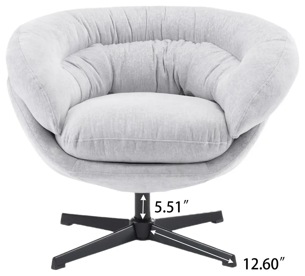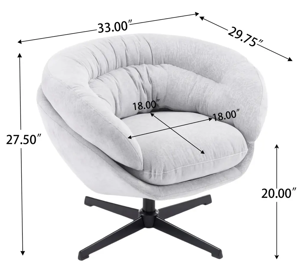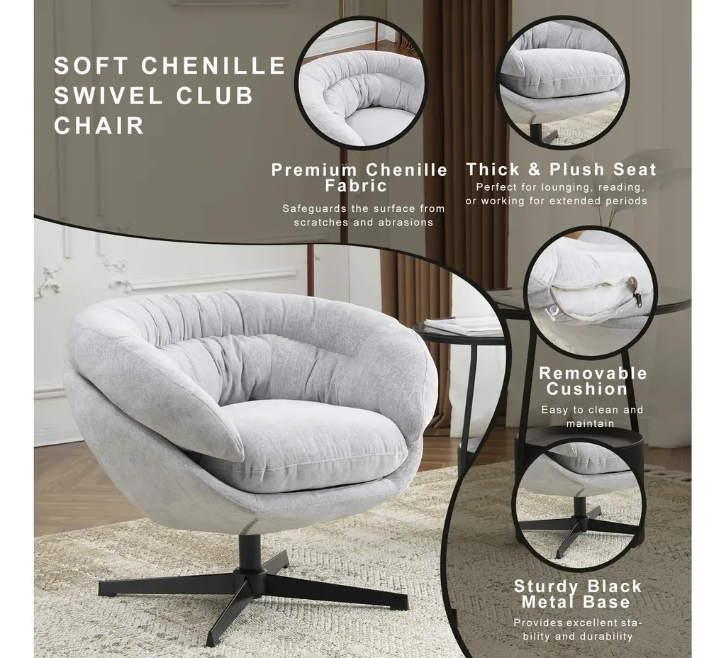 Unmatched Comfort & Ergonomic Design: Experience the ultimate in relaxation with our expertly crafted swivel chair. Its ergonomic contours provide superior support for your back and neck, promoting healthy posture and minimizing fatigue during long hours of sitting—perfect for reading, working, or lounging.Versatile & Chic Design: With its elegant chenille upholstery, this accent chair seamlessly blends with any interior style—from contemporary to classic. Its neutral tones create a warm and inviting atmosphere, making it a perfect fit for your home office, reading nook, or stylish living room.Smooth 360 Swivel for Effortless Mobility: Enjoy the convenience of our chair's effortless 360-degree swivel mechanism. Easily turn and reach for items or engage in discussions without getting up, enhancing your productivity and comfort whether you're at work or relaxing at home.Robust & Stylish Construction: Built for longevity, this chair features a solid black metal base that adds a modern touch to your decor while ensuring stability and durability. It's designed to withstand daily use, making it a reliable choice for your living room, bedroom, or office.Low-Maintenance Luxury: Keeping your chair fresh and inviting is a breeze thanks to its easy-to-clean upholstery. Simply wipe with a damp cloth to remove spills and dust, ensuring that your chair remains a beautiful focal point in your space for years to come.Include: One (1) Swivel Club ChairMaterial: Chenille + MetalColor: Multiple OptionsAssembly RequiredDimensions: 29.75 inches deep x 33.00 inches wide x 27.50 inches high