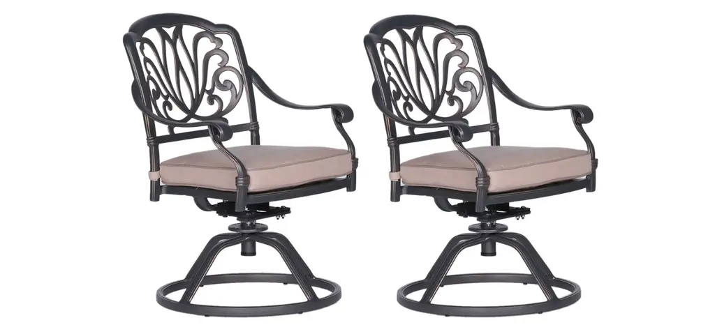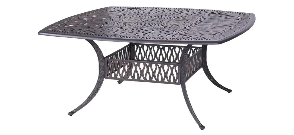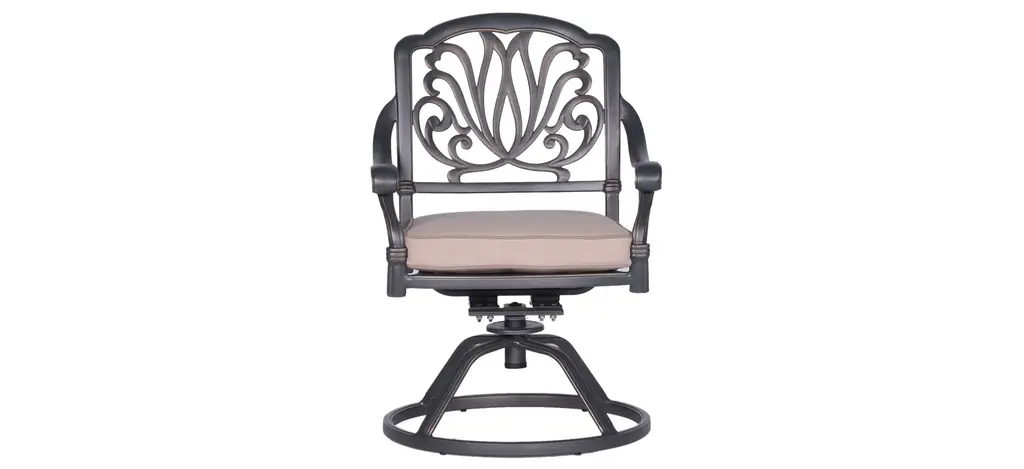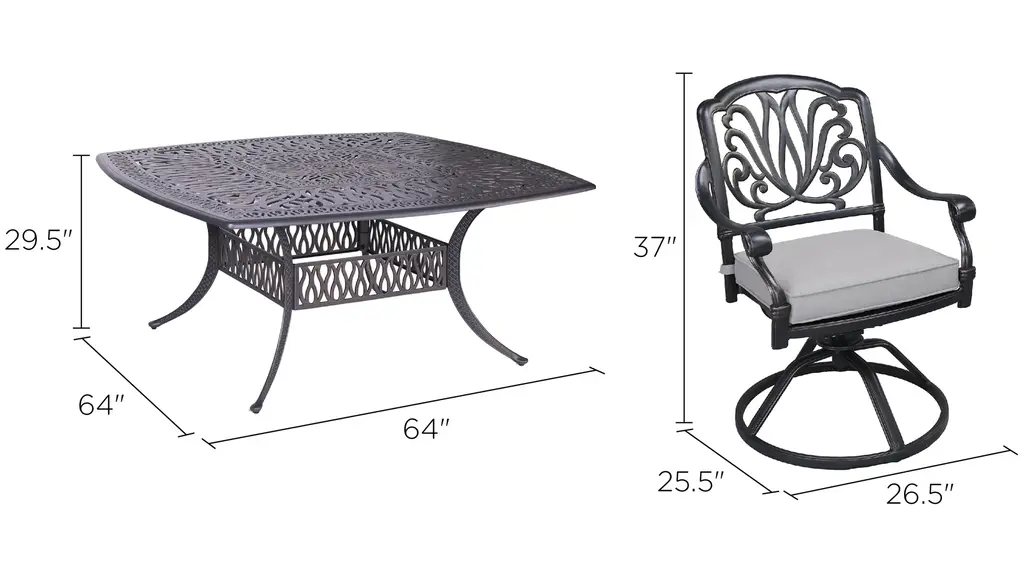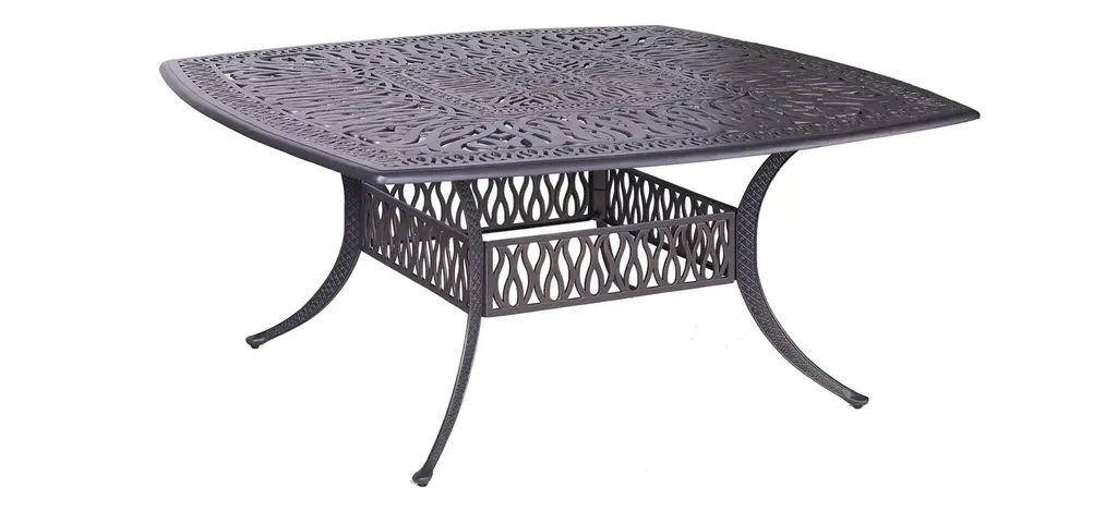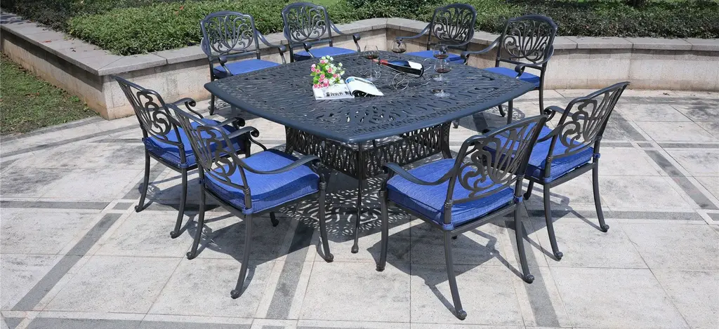 With this modern and beautiful Geneva 9-pc. outdoor swivel dining set, you'll have all the entertaining space you'll ever need in your own backyard. Eight cushioned dining swivel chairs plush one large Geneva square table equals lots of happy guests! This set's design is inspired by the elegant sensibilities of French Quarter architecture. It features a powder coated aluminum lattice with an aluminum curve frame, and it's engineered with a design to be extra-sturdy and ultra-strong.