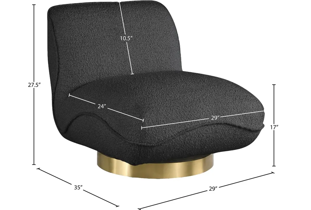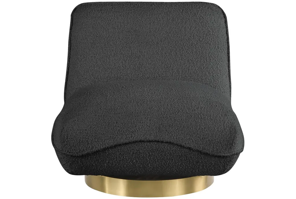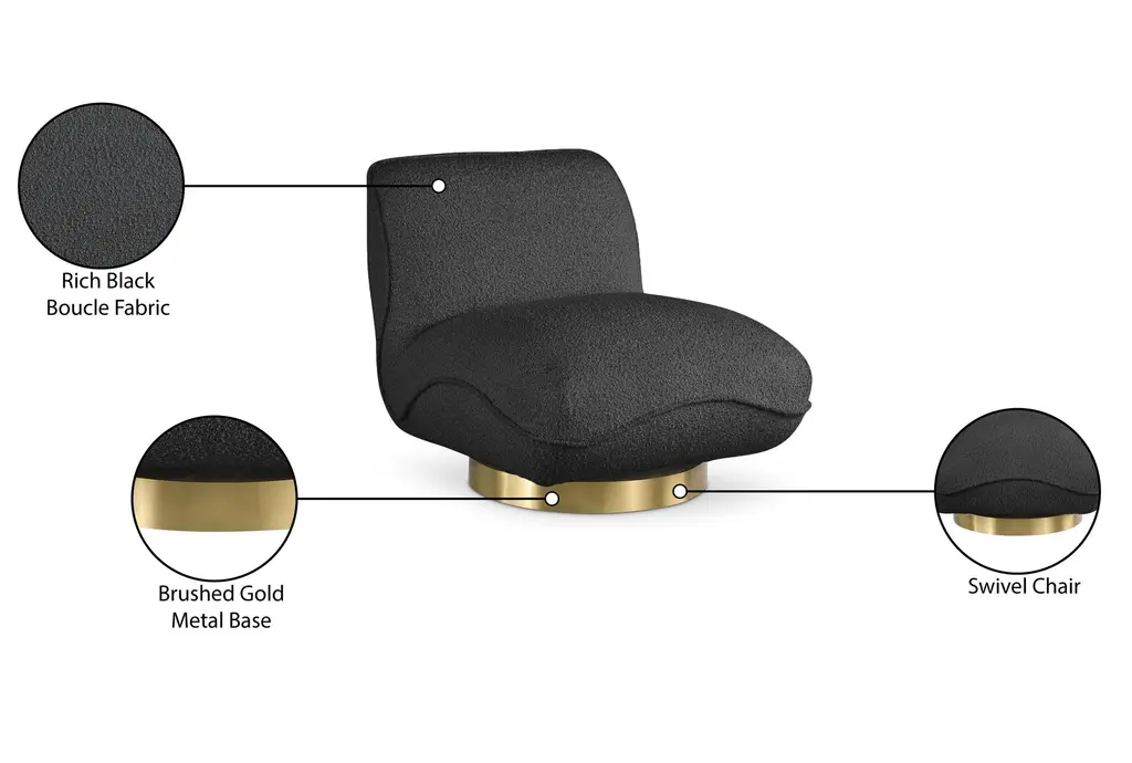 The Geneva Black Boucle Fabric Swivel Accent Chair is a stunning addition to any modern or contemporary space. Its rich black boucle fabric and brushed gold metal base create a sophisticated and stylish look. The chair's solid wood frame ensures durability and stability, making it a perfect choice for both comfort and elegance.