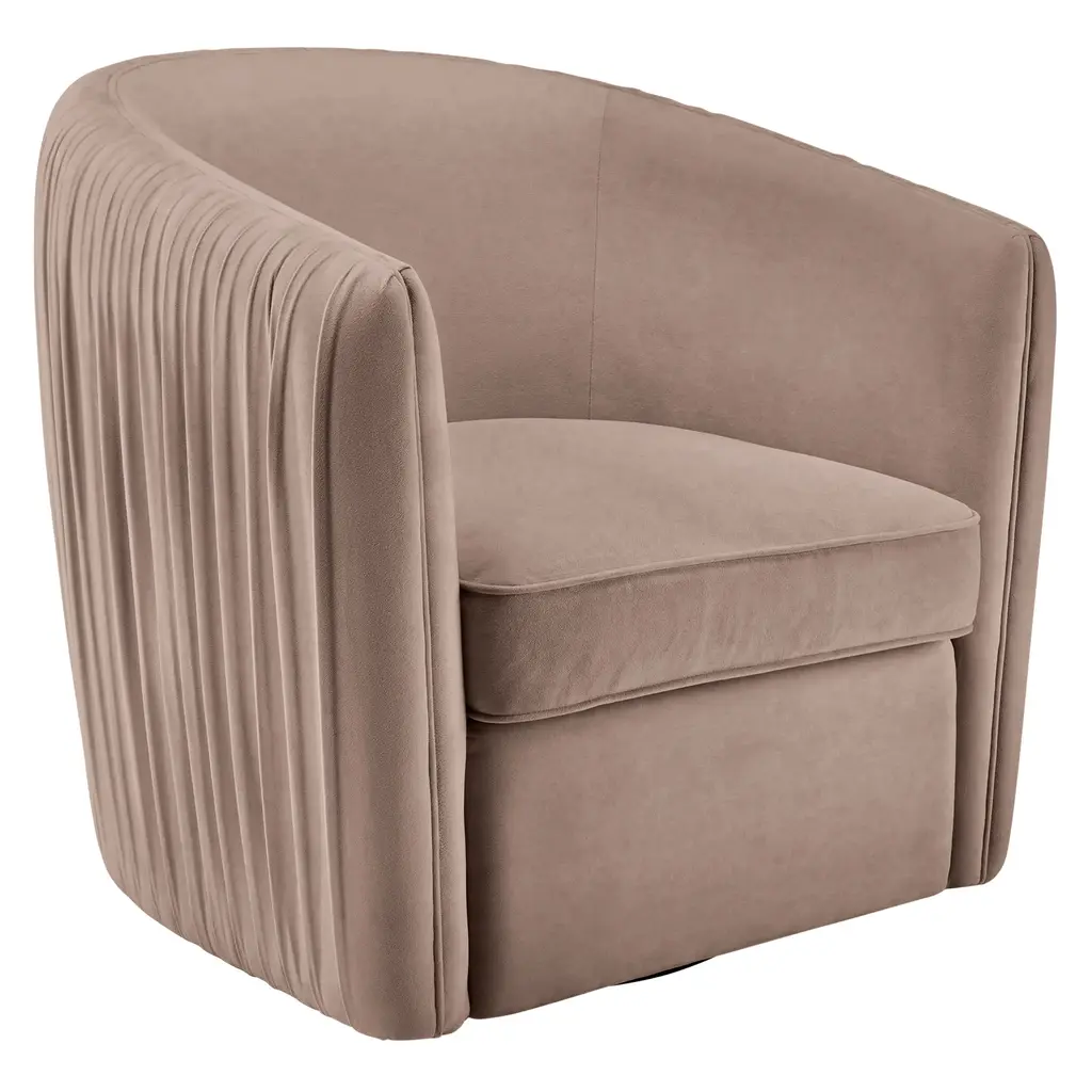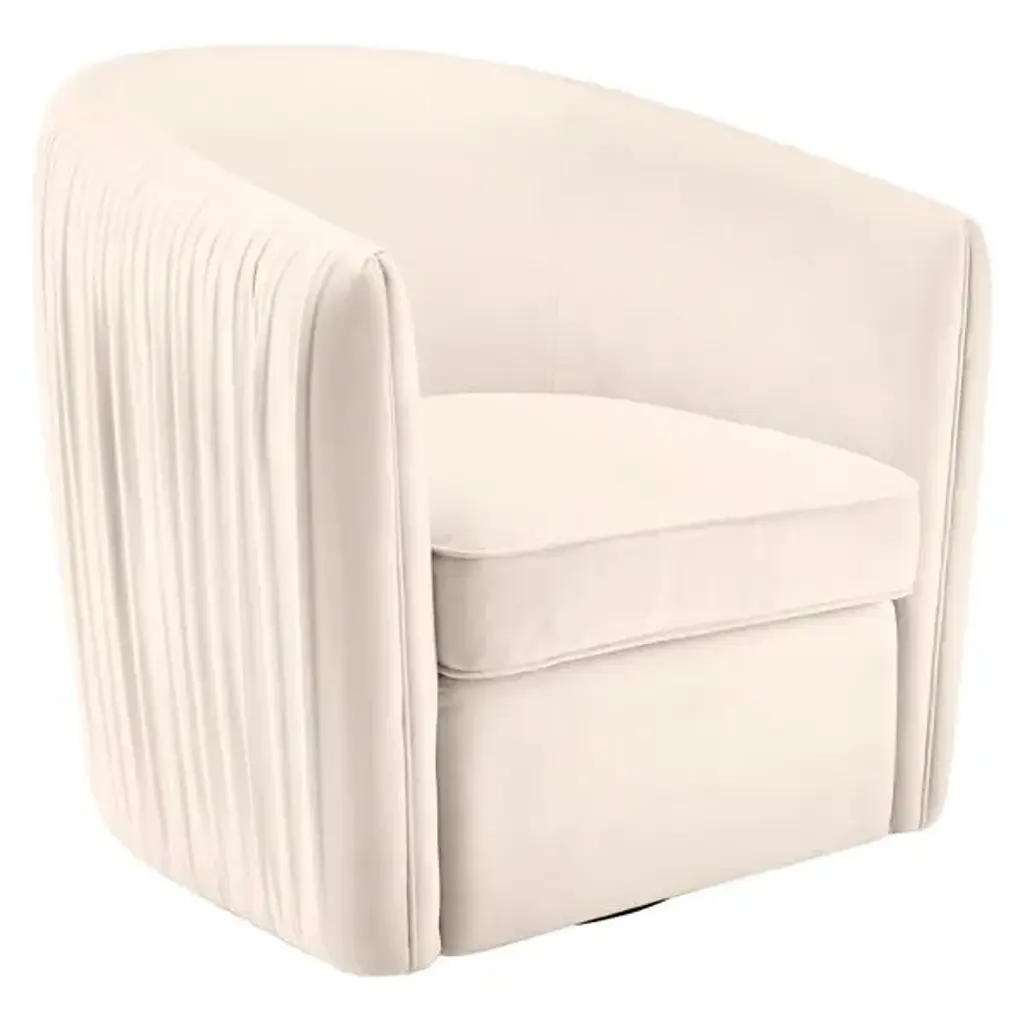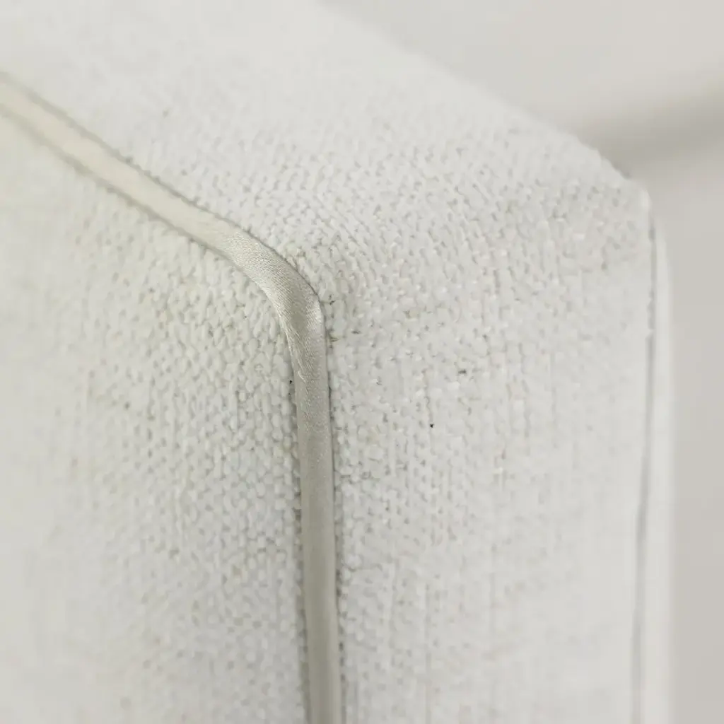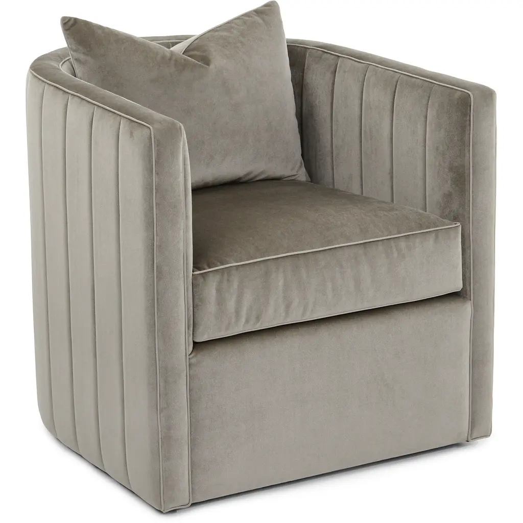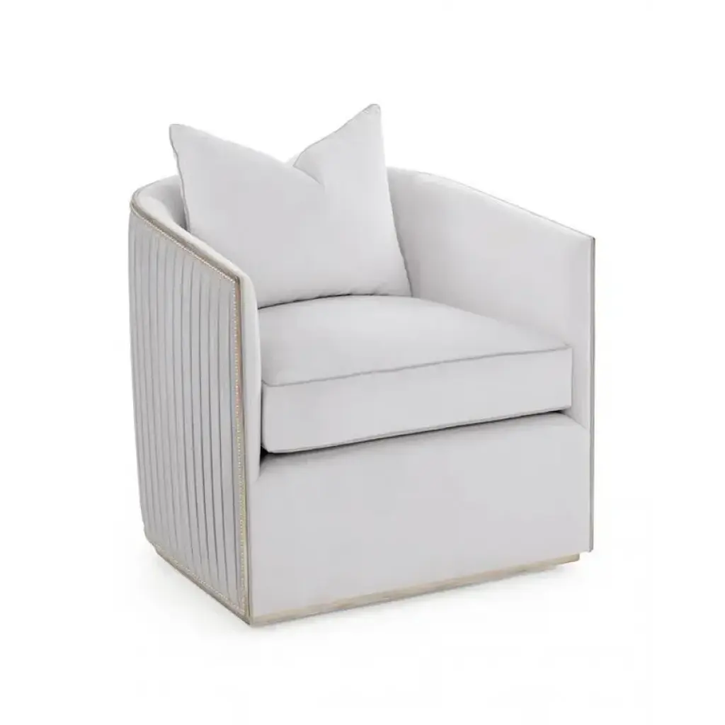 The Giacosa Swivel Chair is a stunning piece that features a memory swivel and a curved beech wood frame. The piece is upholstered in Nomad Snow 1109 fabric, for a crisp white look. Channel quilting spans the interior and exterior, accented by small welt trim in Gimlet String 1120. A lovely accent pillow is included as a backrest, completing the look.