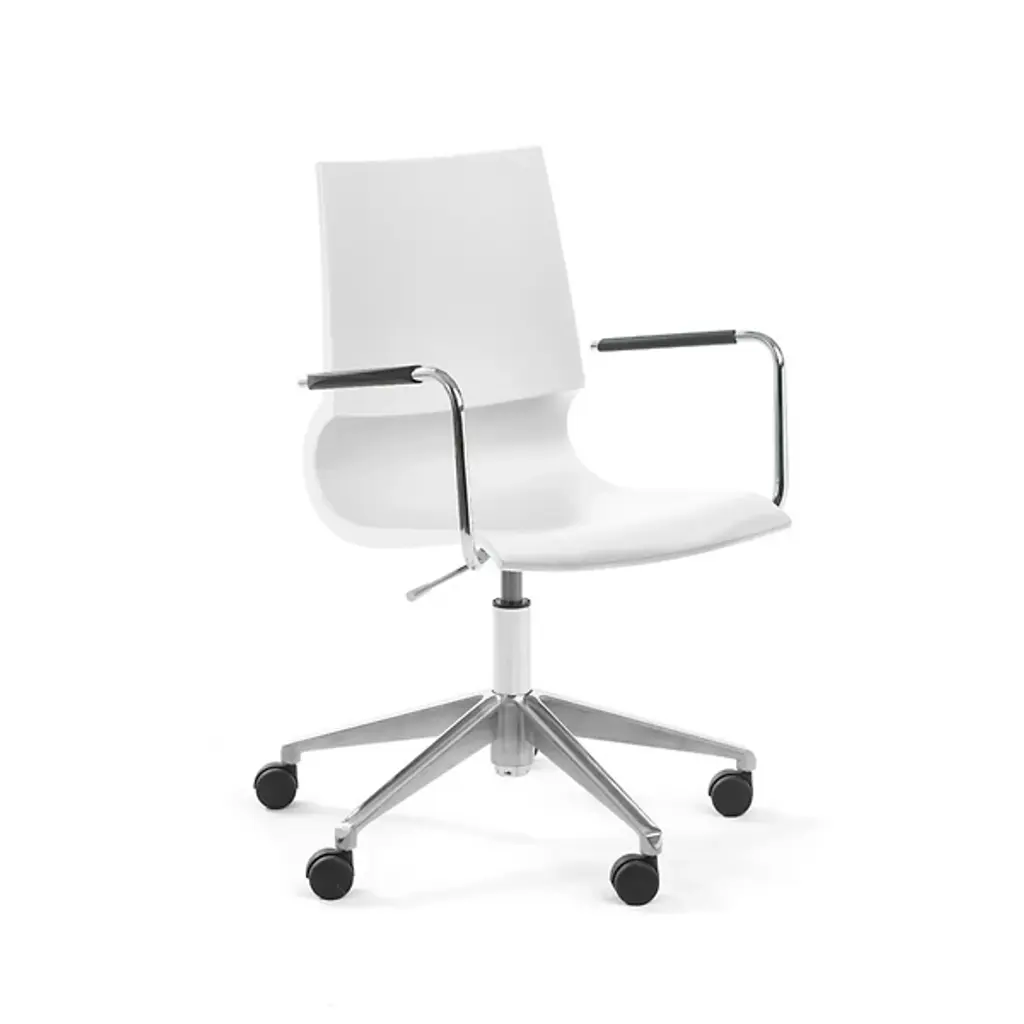 The versatile, comfortable Gigi Chair is offered in this swivel version, ideal for workspaces and meeting areas. The sturdy, flexible seat back features a colored polypropylene frame that attaches to a T-section polished aluminum base with swivel mechanism + pneumatic seat height adjustment and with hard black casters. Armchair arm pads are standard in molded black polypropylene. A wide range of bright and neutral hues are offered for the shell.