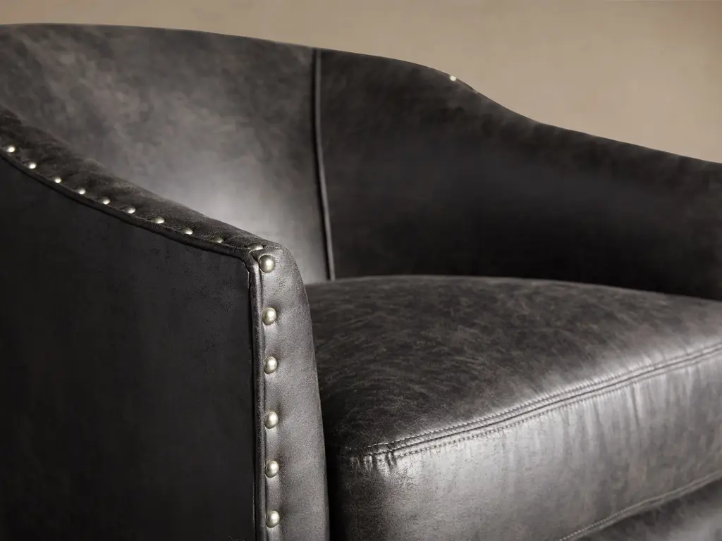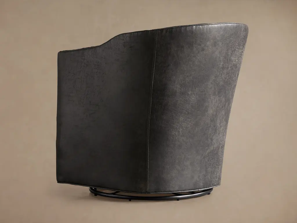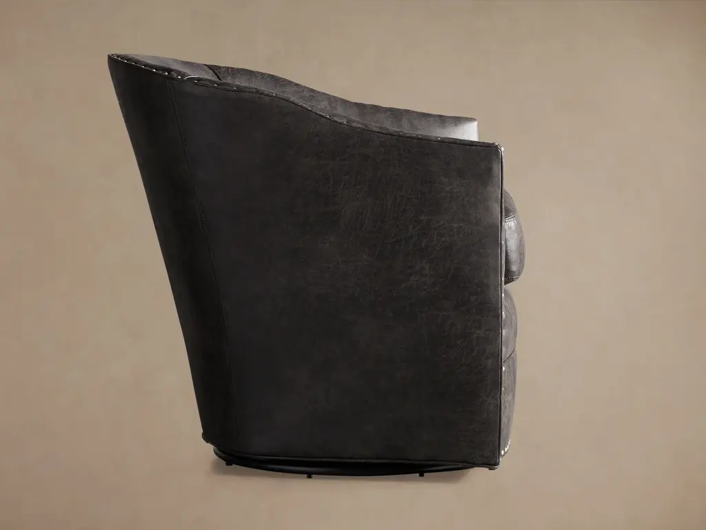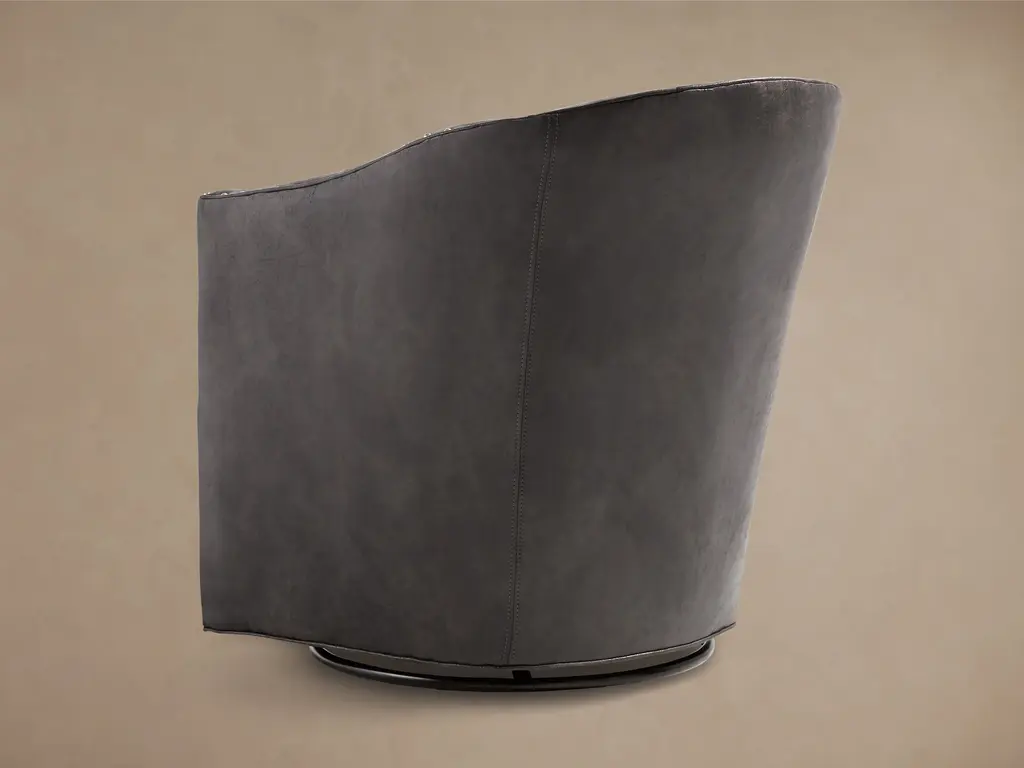 Handcrafted in North Carolina, our sleek and sophisticated Giles Faux Leather Swivel Chair with Nailheads pairs curved silhouettes with clean, architectural lines. Thoughtfully tailored cushions, refined faux leather upholstery, and nailhead details offer a polished look that’s remarkably low maintenance.