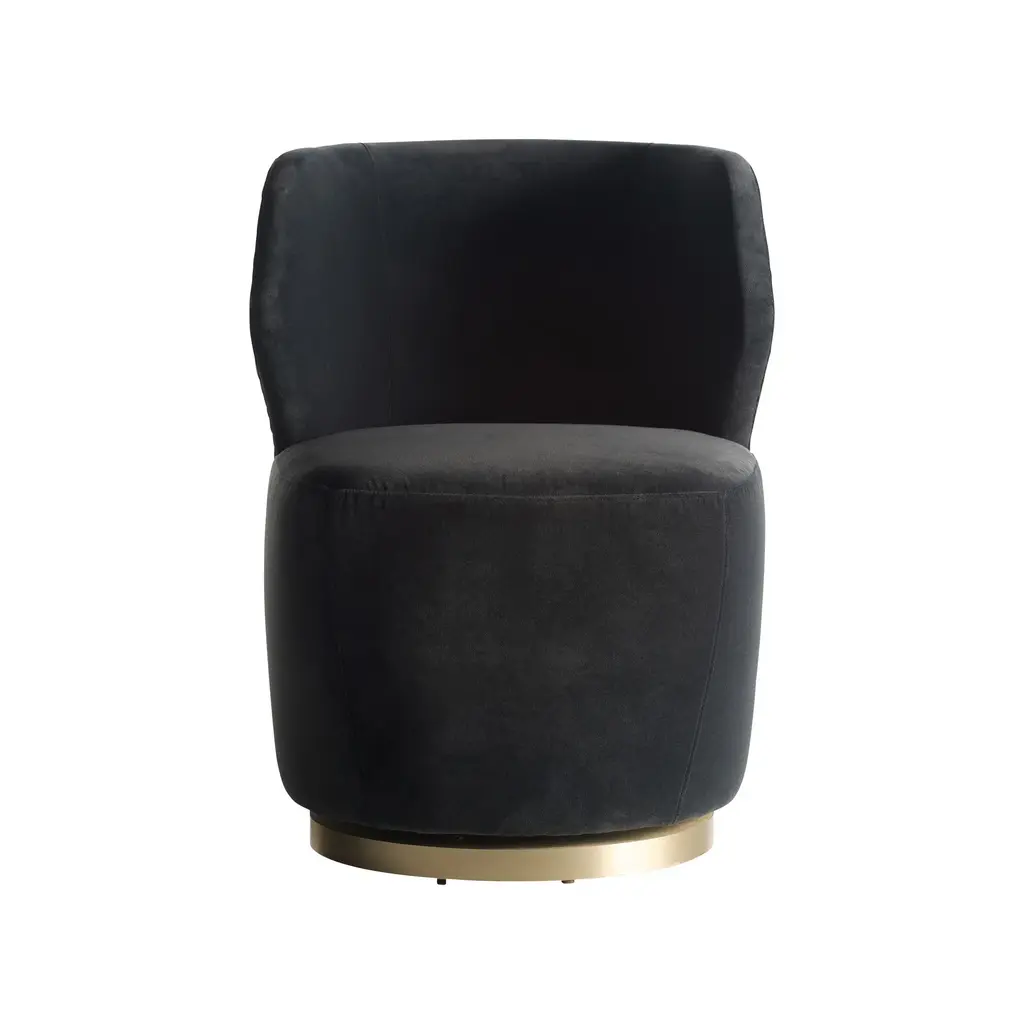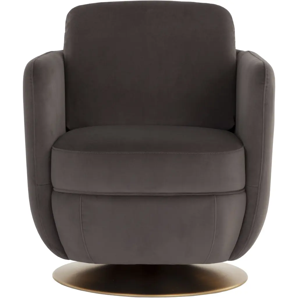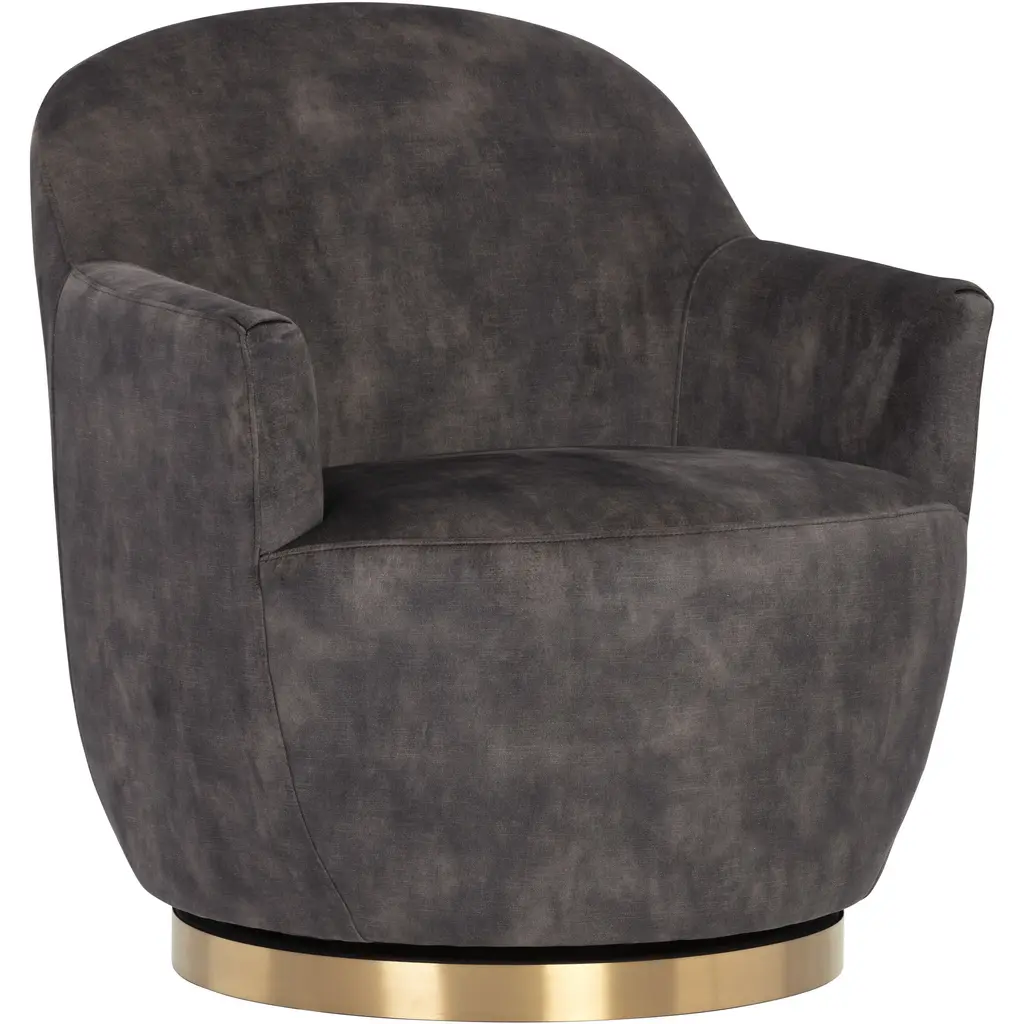 Add a compelling touch of contemporary style with this eye-catching swivel lounge chair. Stocked in meg ash fabric and completed with a round, antique gold stainless steel base. Also available in bergen navy fabric.