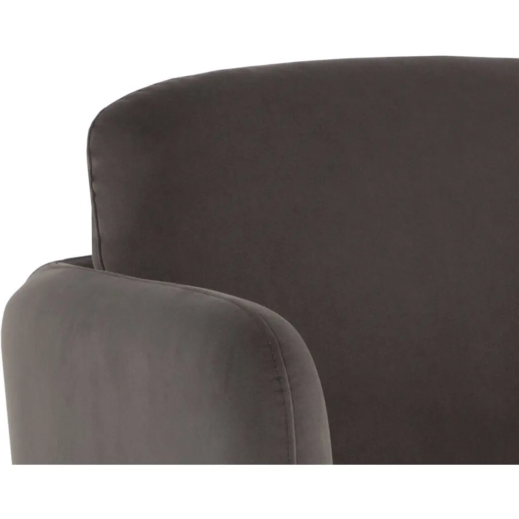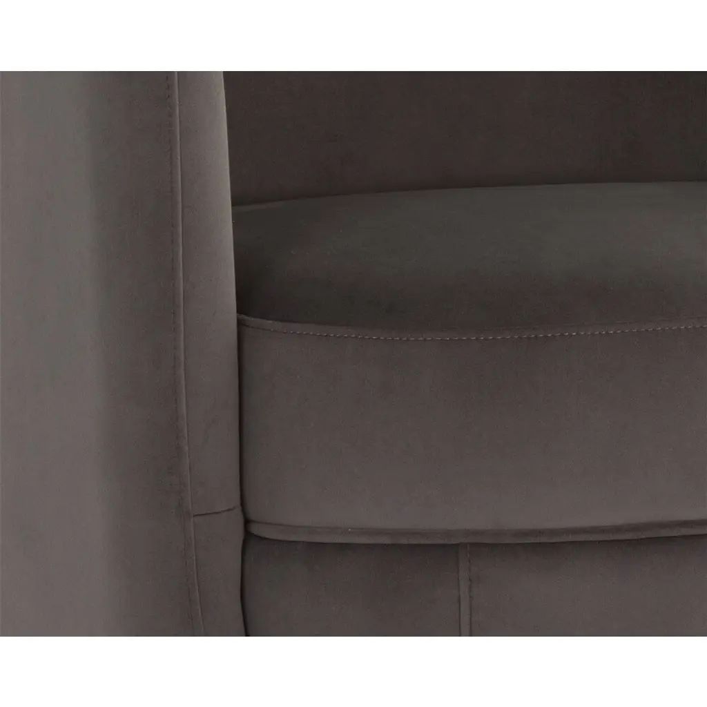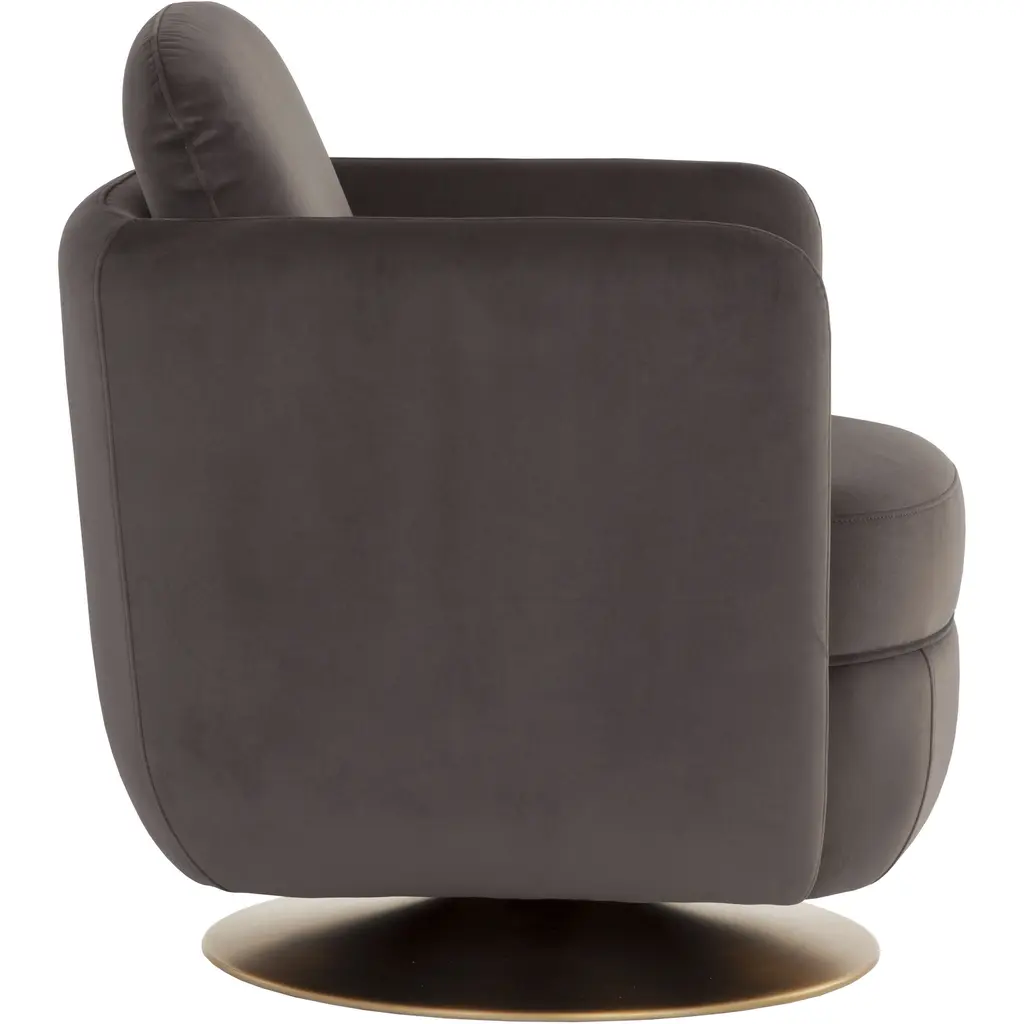 Add a compelling touch of contemporary style with this eye-catching swivel lounge chair. Stocked in meg ash fabric and completed with a round, antique gold stainless steel base. Also available in bergen navy fabric.
