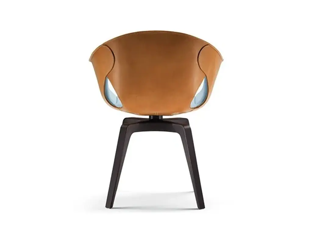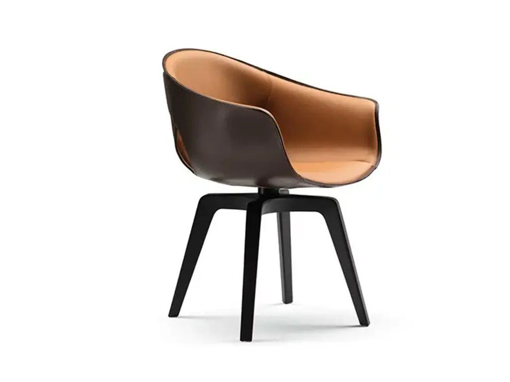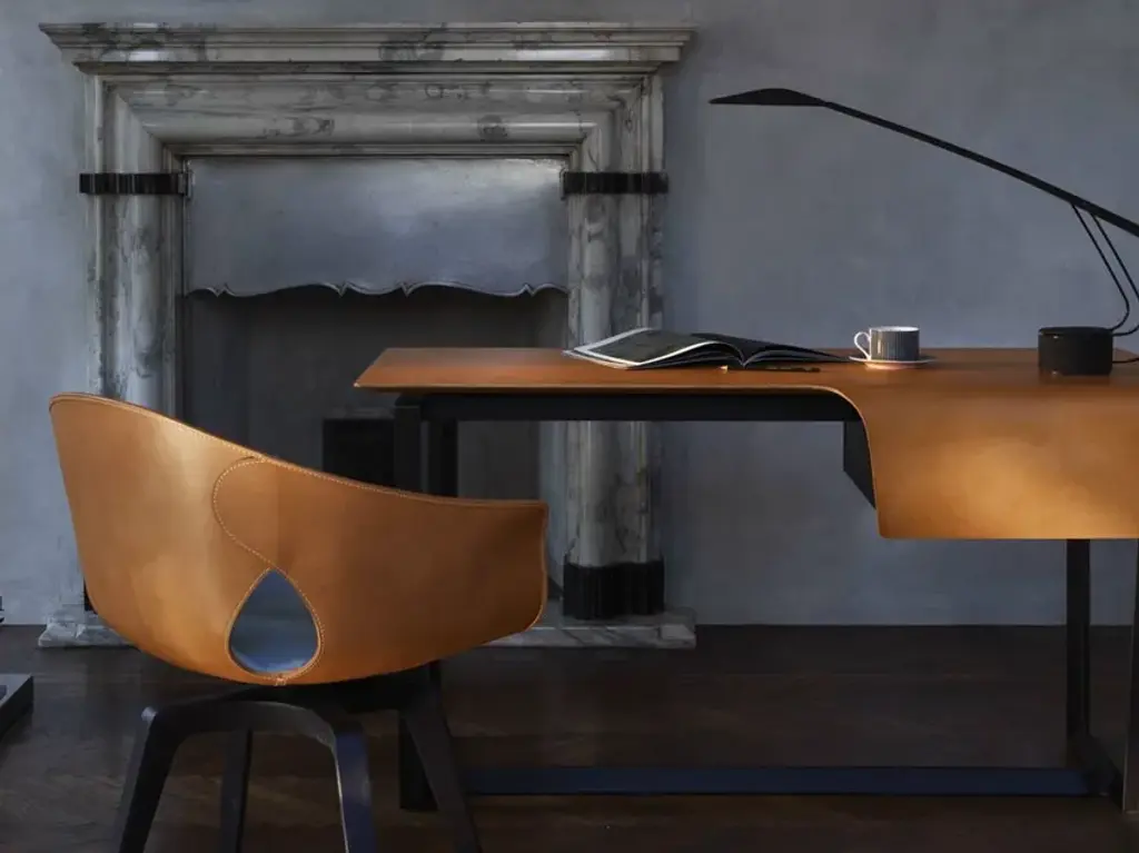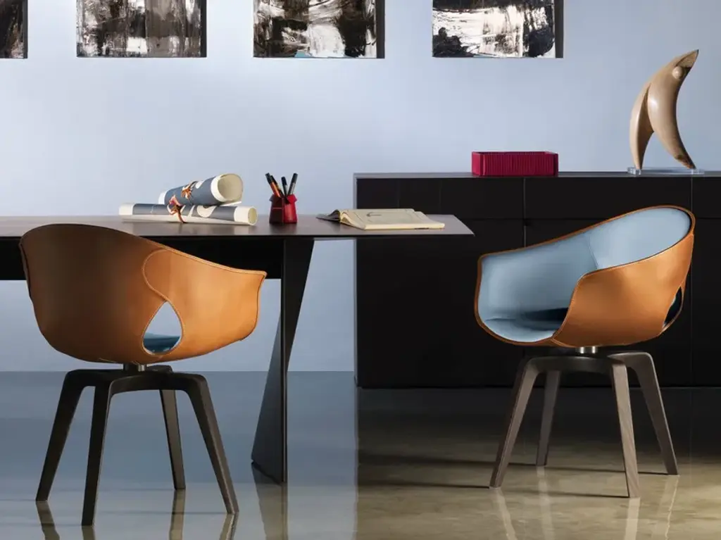 Girger is a swivel trestle-based tanned leather chair with armrests by Poltrona Frau, design by Roberto Lazzeroni.Comfortable, versatile, elegant, the Ginger Ale armchair is just at home in the workspace, as a workstation or meeting room chair, as it is in the domestic setting, in the study or dining room. To cater for all needs, Roberto Lazzeroni has produced four variants: with four-leg base, with four-spoke base, with five-spoke base and castors (fixed or adjustable height) and with column base (fixed or swivel).The external shell is made from moulded thermoplastic composite polymer and available in the colours “anthracite” and “cement”. The padding is in polyurethane foam and the inside surface of the seat is upholstered in Pelle Frau® leather. There are two variants of the Ginger Ale base: with “anthracite” or “cement” lacquered finishes that match the shell. The 4-leg model has a metal base formed of four conical feet, available with plastic caps or adjustable plastic caps with felt pad. The 4-spoke base is in steel with black plastic adjustable caps equipped with felt pads. The 5-spoke base with castors is made of steel and available in both the 360° swivel version with fixed height and the version with gas spring to adjust the seat height. The wheel support is in black plastic for the lacquered versions or chromium-plated in the chromium-plated version. The Ginger armchair with column base has a steel base with black plastic caps. It comes in the fixed and swivel versions. The latter has a shock absorbing device and automatic return to the starting position.