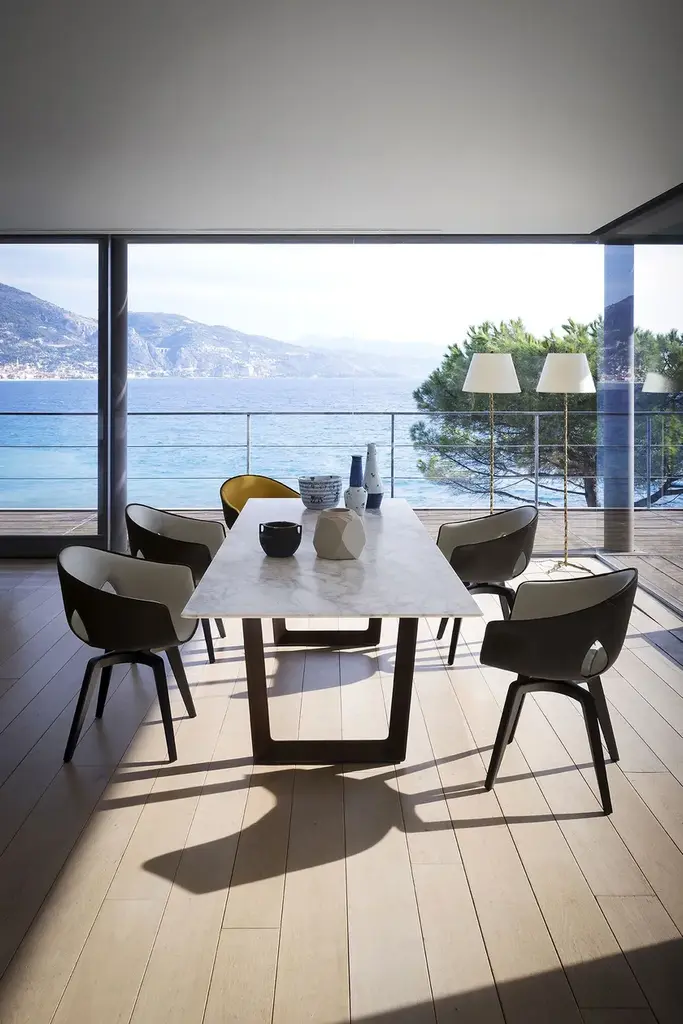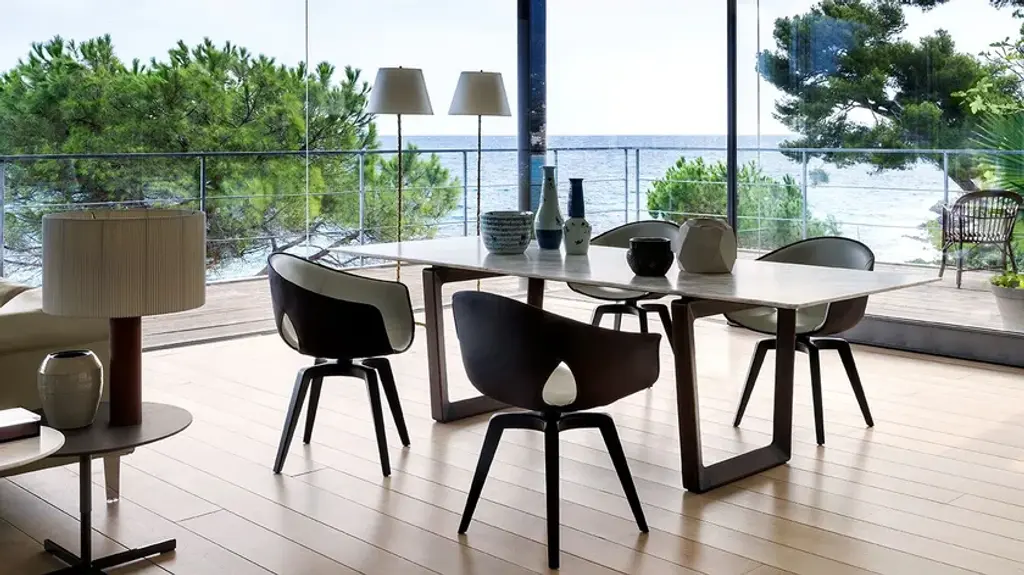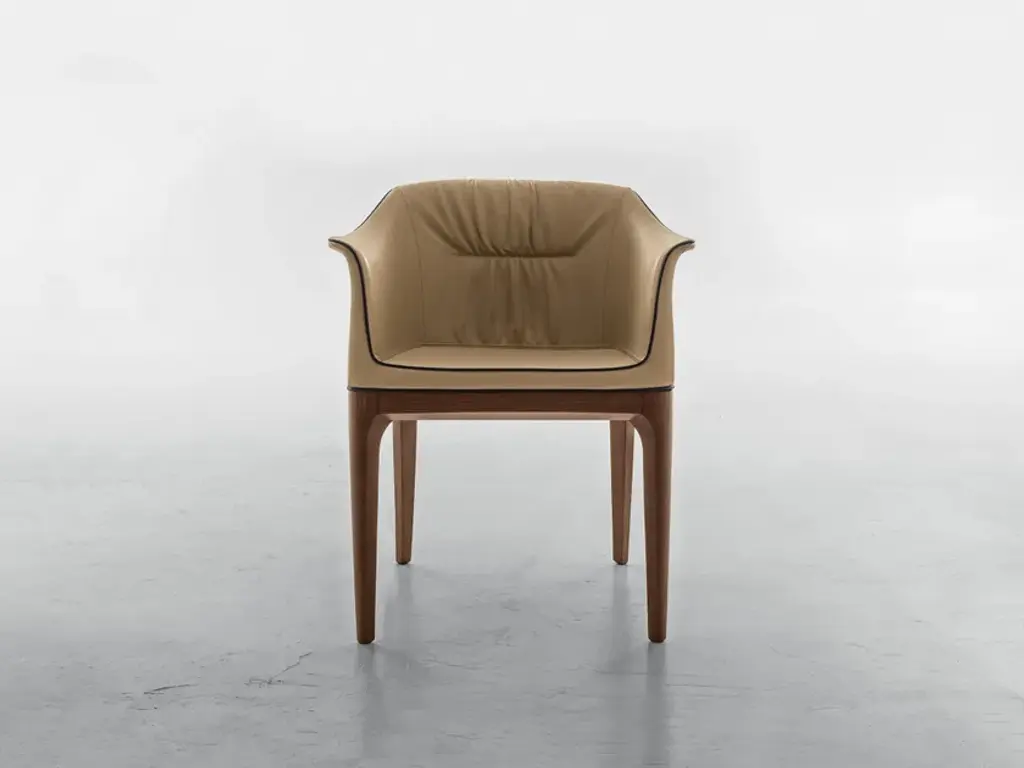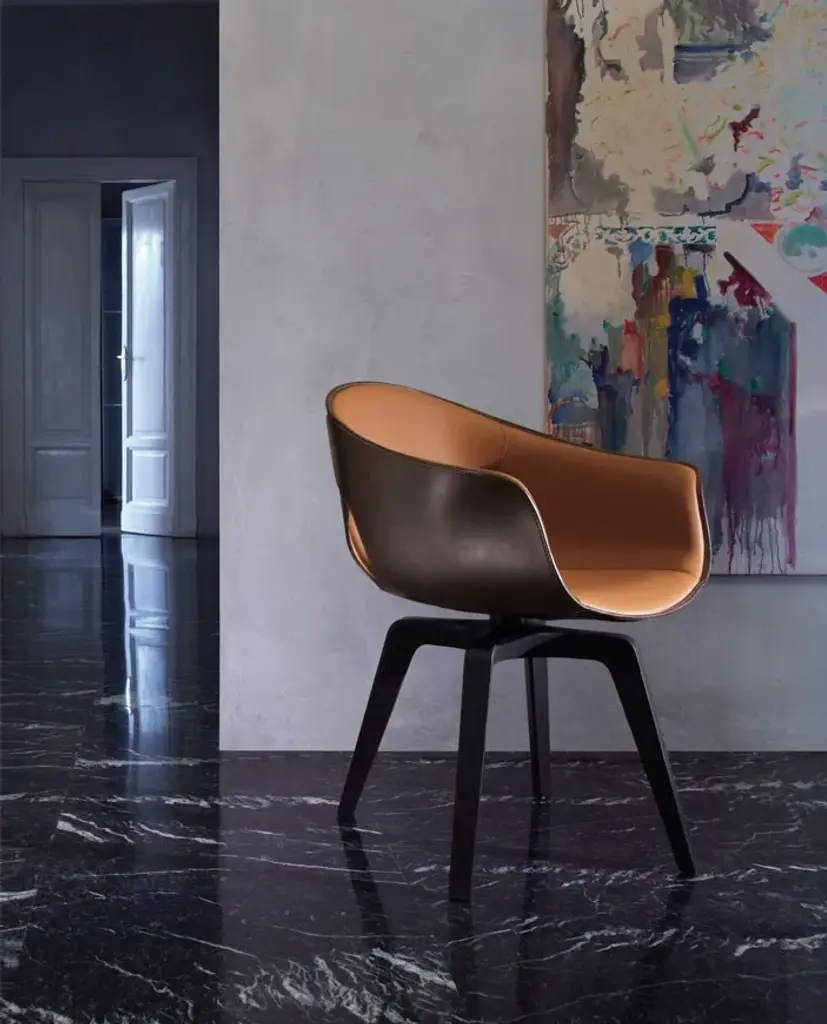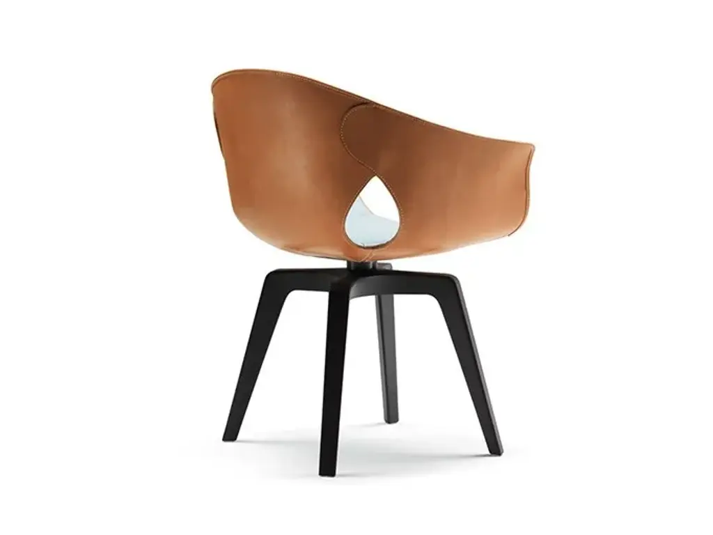 Girger is a swivel trestle-based tanned leather chair with armrests by Poltrona Frau, design by Roberto Lazzeroni.Comfortable, versatile, elegant, the Ginger Ale armchair is just at home in the workspace, as a workstation or meeting room chair, as it is in the domestic setting, in the study or dining room. To cater for all needs, Roberto Lazzeroni has produced four variants: with four-leg base, with four-spoke base, with five-spoke base and castors (fixed or adjustable height) and with column base (fixed or swivel).The external shell is made from moulded thermoplastic composite polymer and available in the colours “anthracite” and “cement”. The padding is in polyurethane foam and the inside surface of the seat is upholstered in Pelle Frau® leather. There are two variants of the Ginger Ale base: with “anthracite” or “cement” lacquered finishes that match the shell. The 4-leg model has a metal base formed of four conical feet, available with plastic caps or adjustable plastic caps with felt pad. The 4-spoke base is in steel with black plastic adjustable caps equipped with felt pads. The 5-spoke base with castors is made of steel and available in both the 360° swivel version with fixed height and the version with gas spring to adjust the seat height. The wheel support is in black plastic for the lacquered versions or chromium-plated in the chromium-plated version. The Ginger armchair with column base has a steel base with black plastic caps. It comes in the fixed and swivel versions. The latter has a shock absorbing device and automatic return to the starting position.