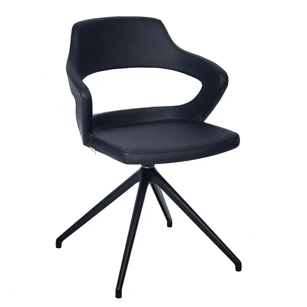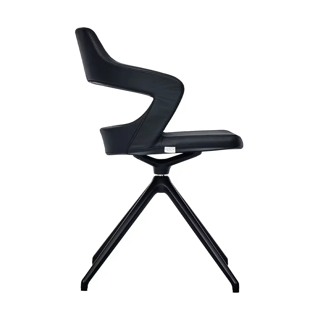 A superb armchair made for contemporary living environments. The sleek silhouette, with the sloped, sculpted back and arms, the sinuous lines of the four-legged die-cast aluminum swivel base, is an ode to the concept of disruptive Italian beauty. The sartorial quality is echoed in the choice of upholstery in top grain Real Piel® genuine black leather. Superb for a private study or office, please contact the Concierge for additional details.