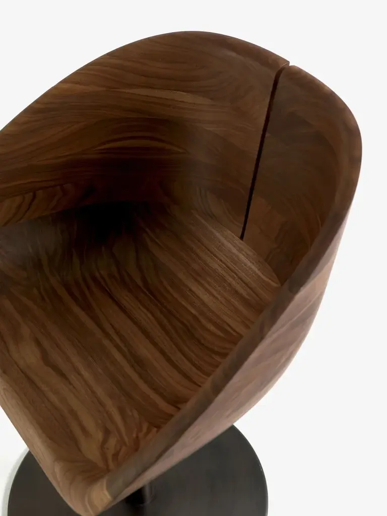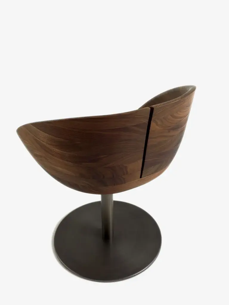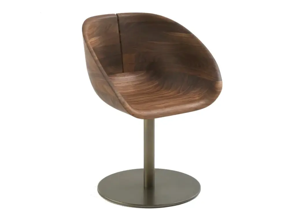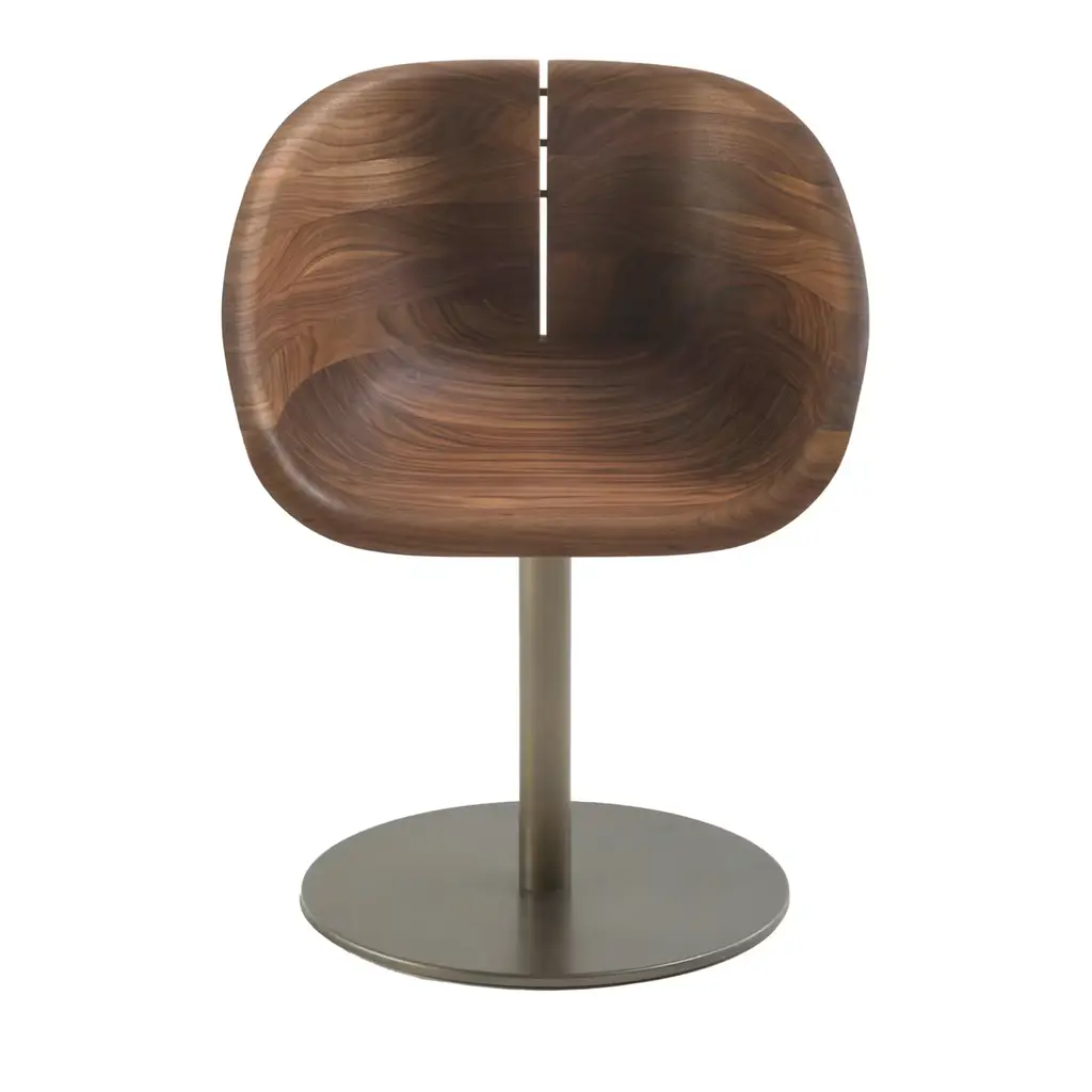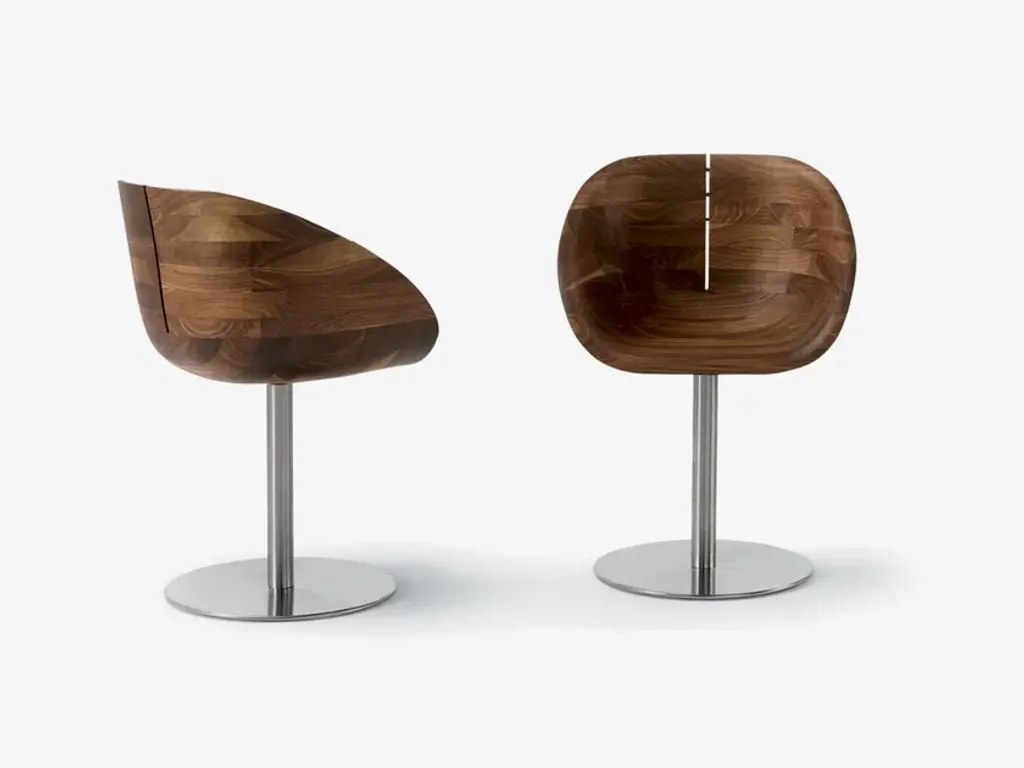 GIOCONDA is a swivel chair with backrest and seat made entirely of solid wood slats, shaped into an enveloping form. Structure with swivel leg in satin-finished steel or brushed matte lacquered iron.