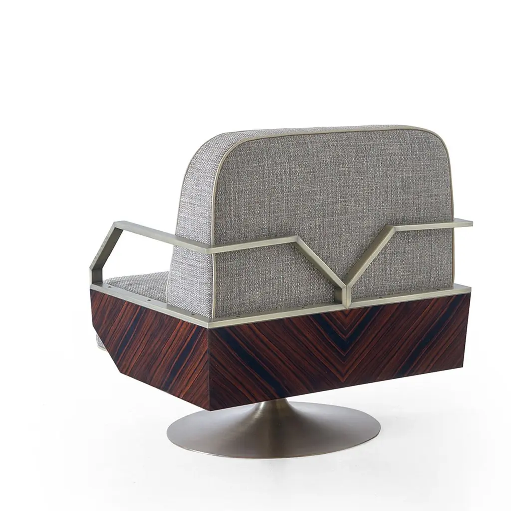 A cozy armchair with a wide seat and padded backrest, the Gladis sits on a round metal swivel base for the best of both worlds. Perfect for lounges with a mid-century modern vibe, the chair features Macassar ebony veneer with a high gloss finish, bringing out its natural beauty. The chair is completed with bronze-tone metal armrests.