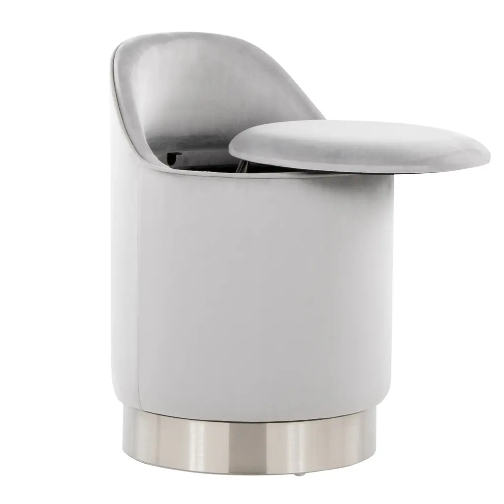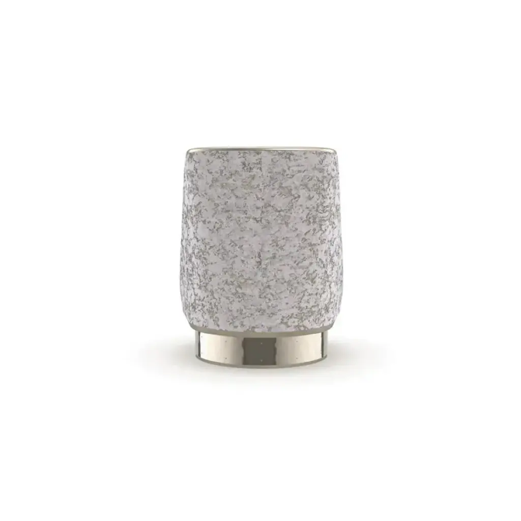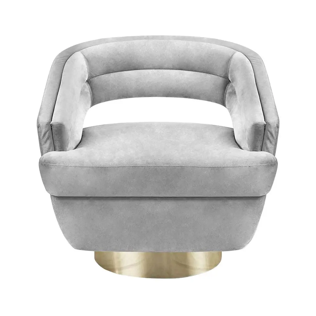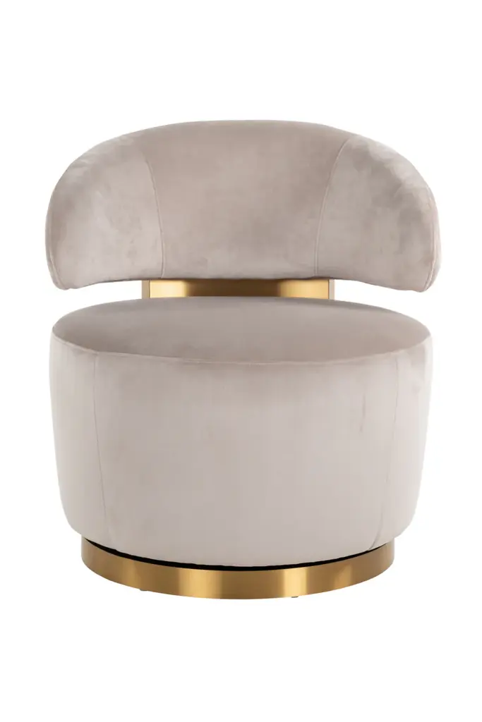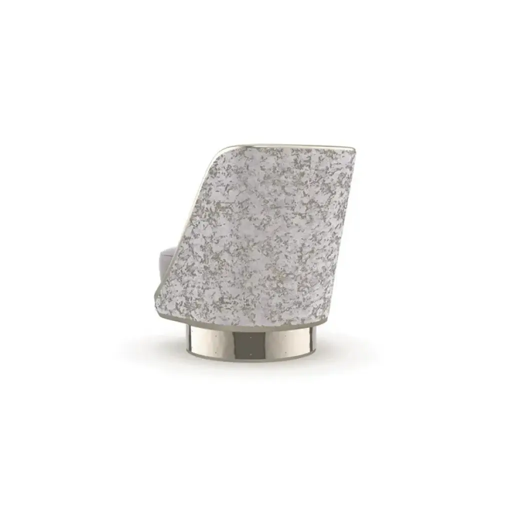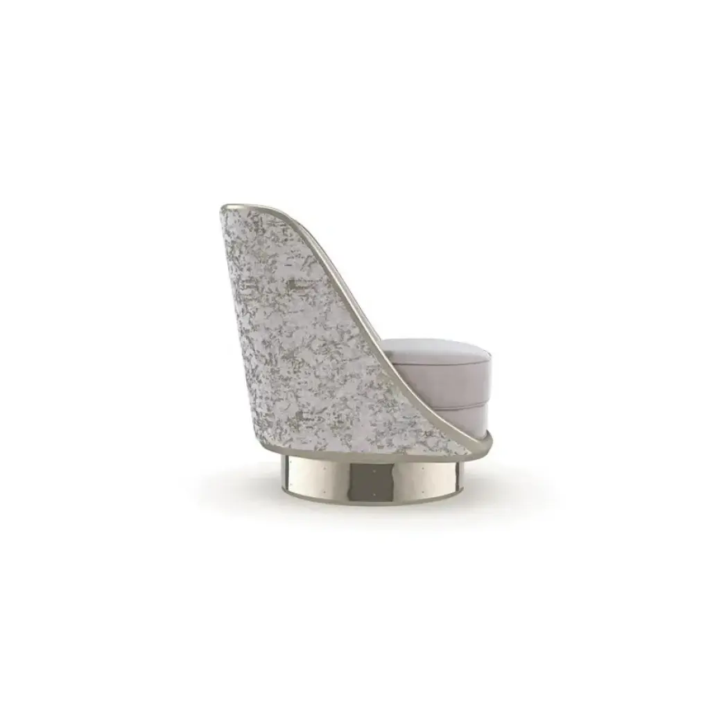 Svelte and sophisticated on a gold metal banded base, this swivel chair epitomizes the essence of Caracole glamour. Its softly contoured silhouette beckons to be admired in a luxurious mix of materials and finishes. A contrasting cut velvet wrapping the back adds a classic detail, complemented by a pale gray lavender velvet on the inside and a shimmering Silver Shadow finish. Makes an alluring statement on its own, even more dramatic in pairs.