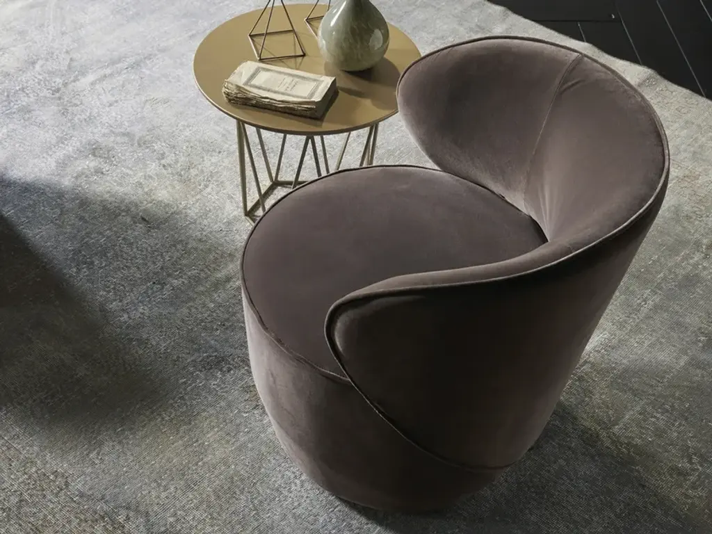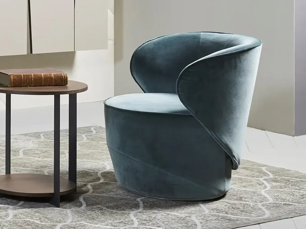 GRACE, Design Pierangelo Sciuto, is a a comfortable and refined swivel armchair matched with a practical pouf covered with velvet available in 10 colours in addition to the possibility of covering it with customer's fabric.