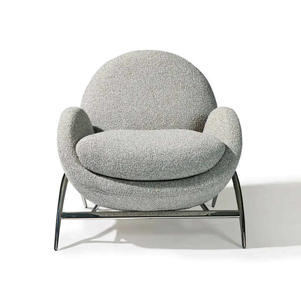 Armchair with base in brushed steel. Frame in leather. Seat and back in fabric. Backrest pillow in fabric.
