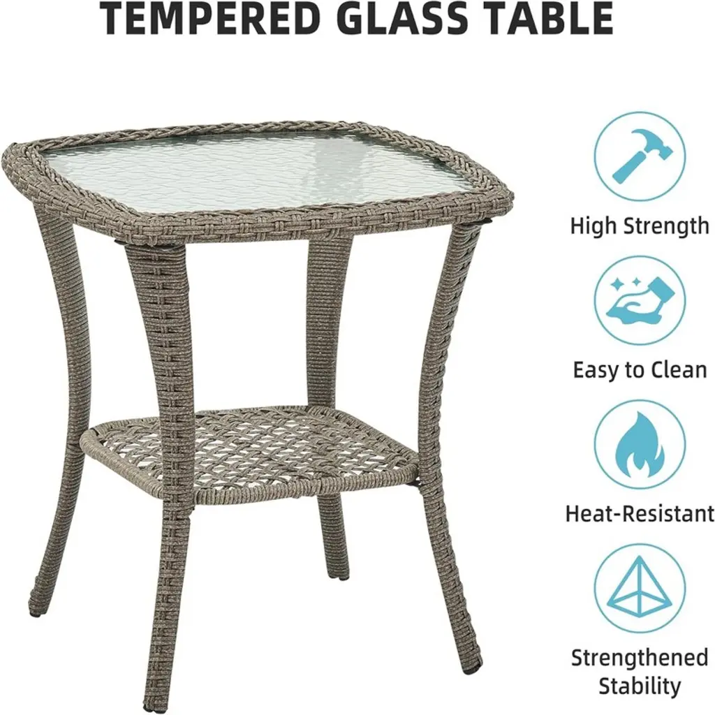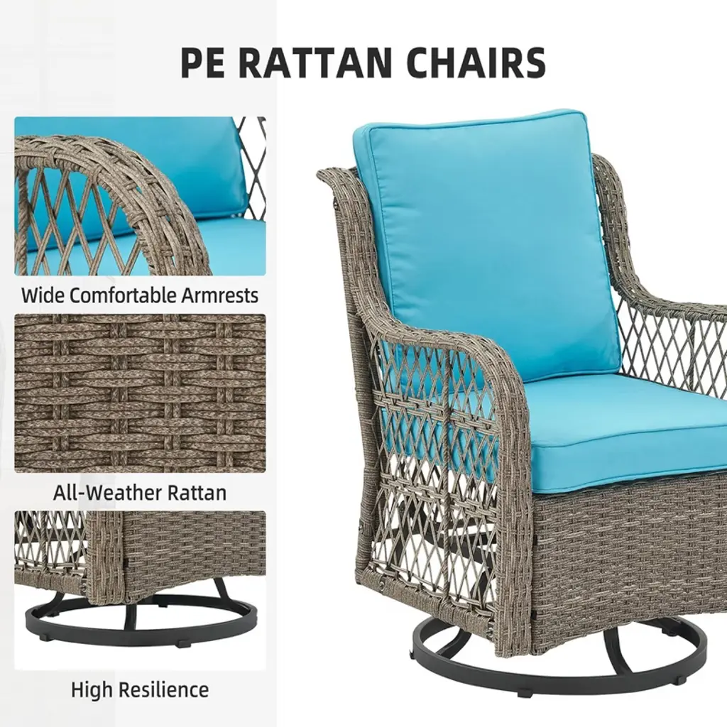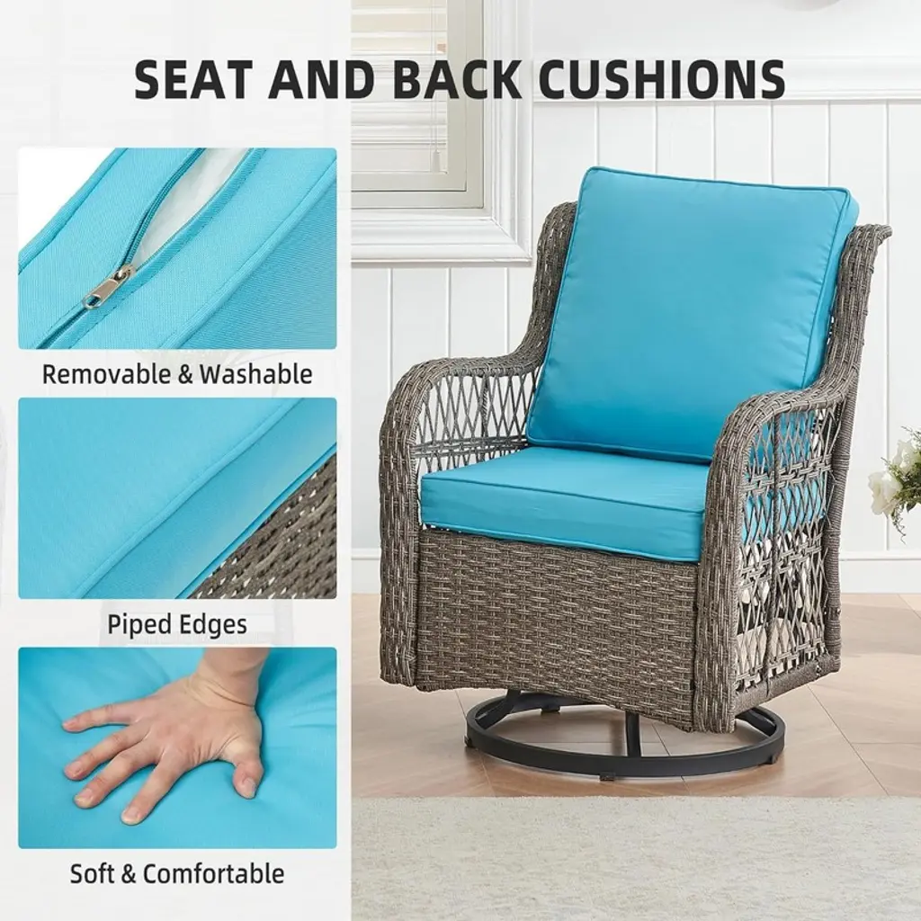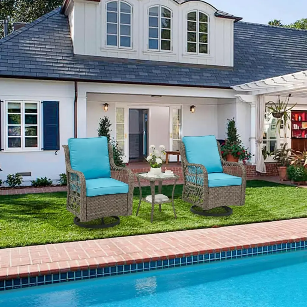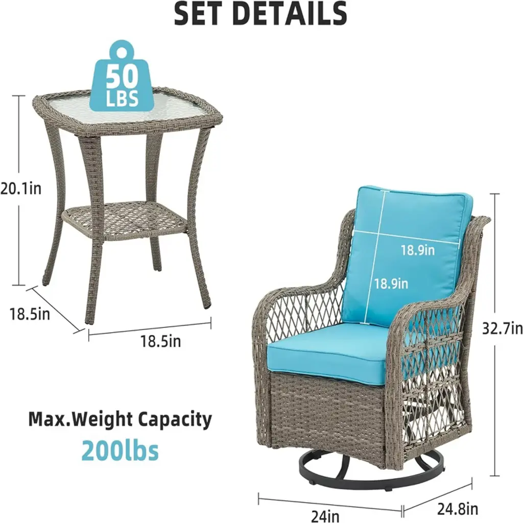 This 3-Piece Bistro Set Pairs Two 360° Swivel-And-Rock Pe-Rattan Chairs—Each With Wide Armrests, 20-Inch-Deep Removable Piped Cushions, And 200-Lb Capacity—With A 50-Lb-Rated Matching Table, All On Sturdy Iron Frames That Assemble In About 30 Minutes.