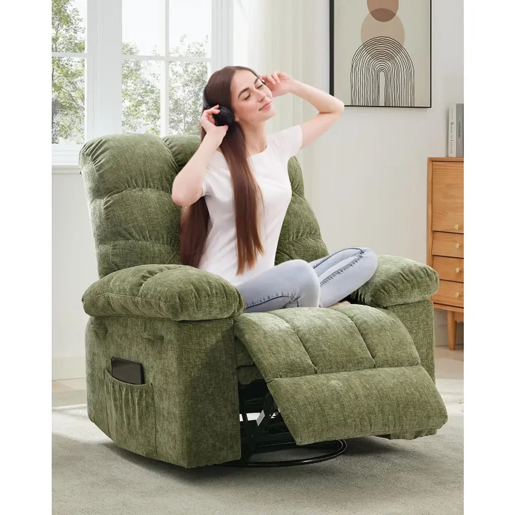 Experience ultimate comfort and versatility with this rocker recliner featuring a 360° swivel, gentle 30° rocking motion, and a 135-degree reclining tilt. Its segmented backrest offers targeted support for upper and lower back relief, while the easy-to-use footrest enhances relaxation. Upholstered in luxurious, durable chenille fabric, this chair combines breathability with a refined look. Built on a sturdy Q235 carbon steel base supporting up to 300 pounds, it ensures lasting durability and safety. Perfect for home or commercial use, it assembles quickly and tool-free in just 20 minutes, backed by responsive customer service for peace of mind.