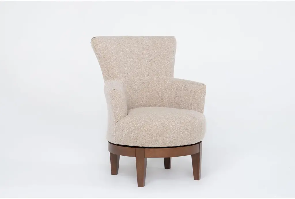 The Halle Tan Swivel Accent Chair brings relaxed style with its cozy round seat and curved profile. This stylish armchair features a dark walnut finish that adds rich contrast to the inviting tan fabric, making it a perfect home furnishing for any room. This design is the perfect bedroom chair, reading chair, club chair or accent chair for living room. You'll love the grounded color palette, which favors earth tones.