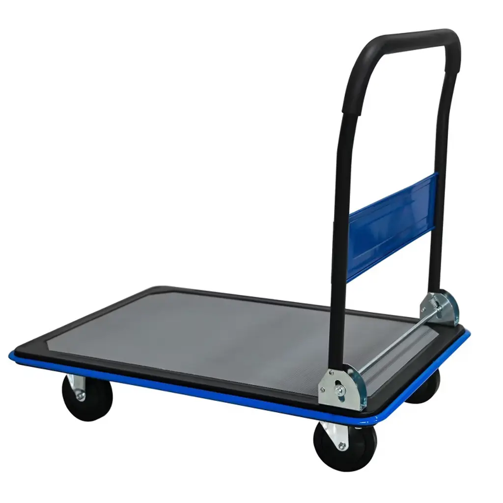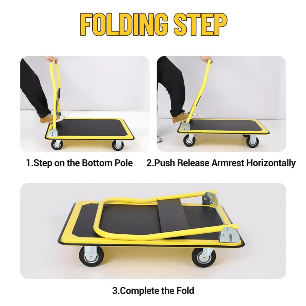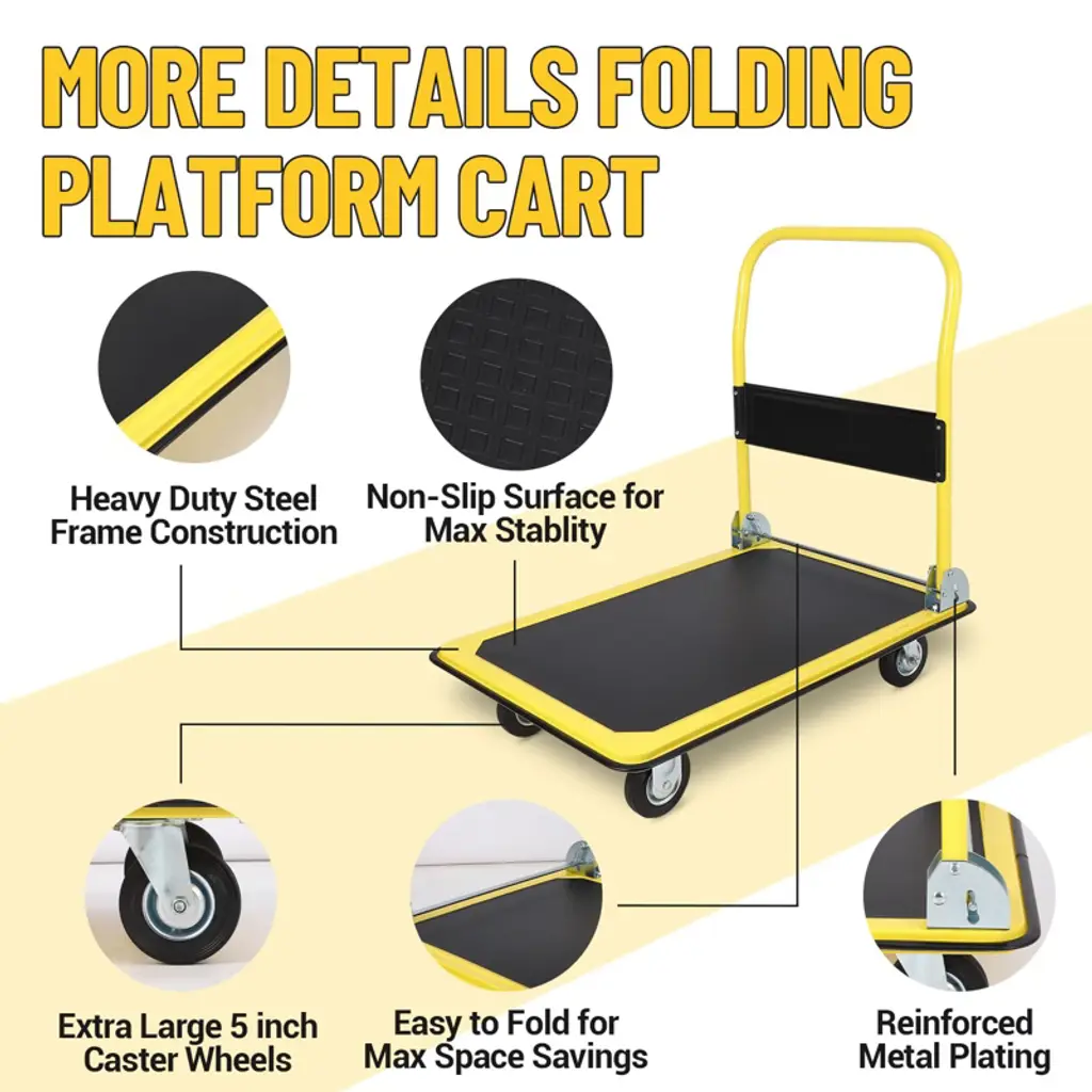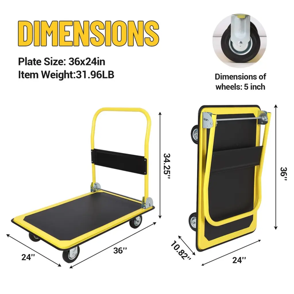 1.1100 lbs Heavy-Duty Capacity for Safe, Reliable Hauling Built to tackle heavy loads, this moving platform hand truck supports up to 1100 lbs¡ªmaking it ideal for transporting bulky, weighty items like stacked moving boxes, power tools, small furniture (chairs, side tables), garage equipment (lawnmowers, snow blowers), or warehouse inventory. Its robust construction, centered around a thick A3 steel deck, resists bending, warping, or denting even under maximum weight, ensuring stability and safety during every use. Whether you¡¯re a homeowner moving house, a warehouse worker restocking shelves, or a DIY enthusiast organizing a garage, it eliminates the risk of strain from lifting and cuts down on multiple trips. 2.36¡Á24 Inch Spacious A3 Steel Deck for Versatile LoadingThe hand truck features a large 36¡Á24 inch platform crafted from high-quality A3 steel¡ªproviding ample space to fit items of all shapes and sizes without overcrowding. The wide, flat deck easily accommodates irregularly shaped cargo (e.g., bulky storage bins, rolled-up rugs, or odd-sized boxes) and keeps them secure during transport, thanks to the steel¡¯s non-slip rigidity (no shifting or sliding mid-move). The durable steel surface also stands up to scratches, scuffs, and daily wear, making it suitable for rough-use environments like garages or warehouses where items might rub against the deck. 3.26.4 Inch Ergonomic Handle to Reduce Physical StrainDesigned with user comfort in mind, the hand truck¡¯s 26.4-inch tall handle aligns with the average adult¡¯s natural grip height¡ªeliminating the need to hunch over (which strains the lower back) or stretch upward (which tires the arms) during prolonged use. The handle¡¯s smooth, sturdy design provides a secure grip, even when pushing or pulling heavy loads, and its height ensures balanced weight distribution across your body. This ergonomic feature is a game-changer for anyone using the hand truck for hours at a time (e.g., moving day, warehouse shifts) by minimizing fatigue and reducing the risk of overexertion injuries. 4.Collapsible Design for Compact Storage & TransportDespite its heavy-duty build, the hand truck folds down to a slim, compact size when not in use¡ªsolving the problem of bulky storage. It tucks easily into closets, under beds, behind garage shelves, or in the trunk of a car, taking up minimal space. This portability is especially useful for those with limited storage (e.g., apartment dwellers) or anyone who needs to transport the hand truck between locations (e.g., moving between job sites, lending to a friend). Setting it up is just as simple: unfold the frame, lock it into place, and it¡¯s ready to use in seconds. 5.4 Caster Wheels (360¡ã Swivel Rear + Directional Front) for Smooth ManeuveringEquipped with four durable caster wheels, the hand truck delivers effortless mobility across nearly any surface¡ªconcrete, tile, hardwood, asphalt, or even slightly uneven garage floors. The rear two wheels feature 360¡ã swivel functionality, allowing you to navigate tight corners, narrow hallways, or crowded spaces (e.g., between warehouse racks, through doorways) with precision. The front two directional wheels provide stability for straight-line movement, preventing wobbling when hauling heavy loads. Together, they ensure the hand truck glides smoothly without sticking or jerking, making even large loads feel easy to control.
