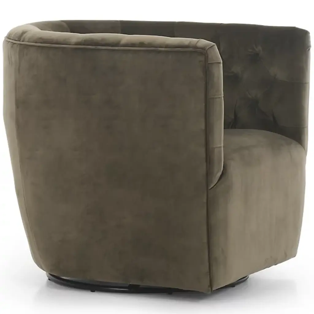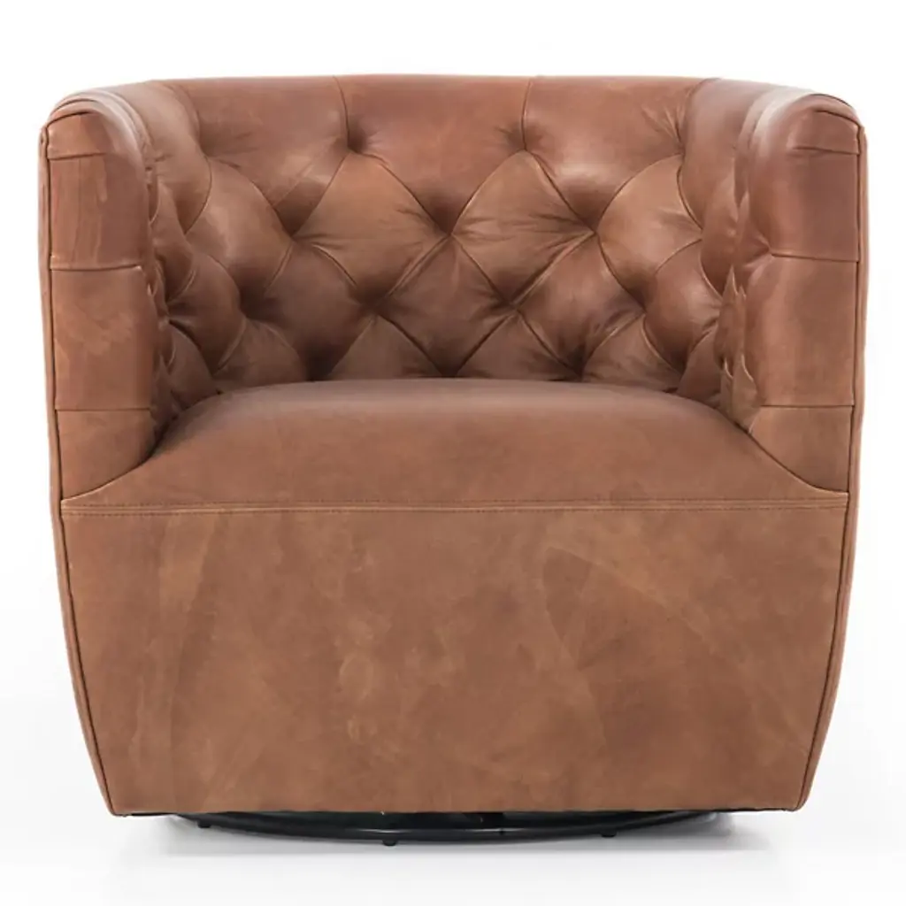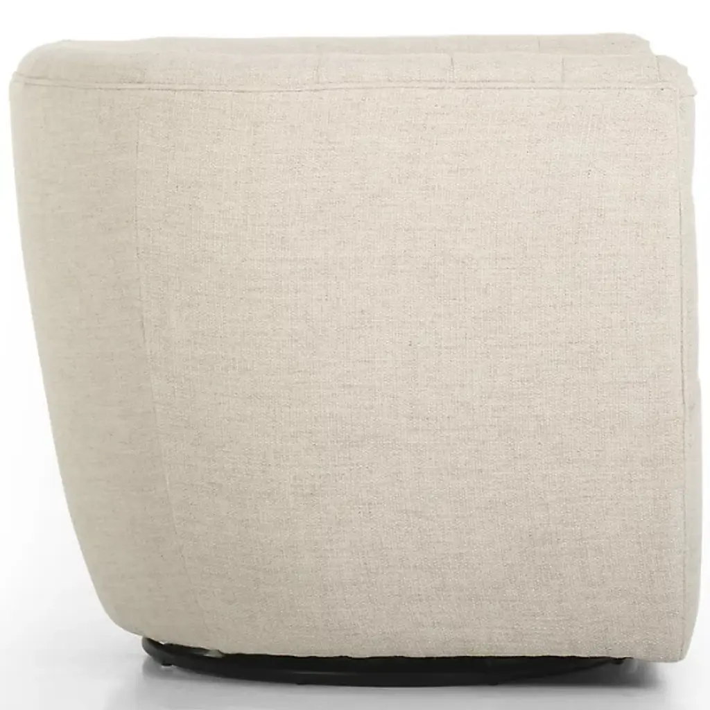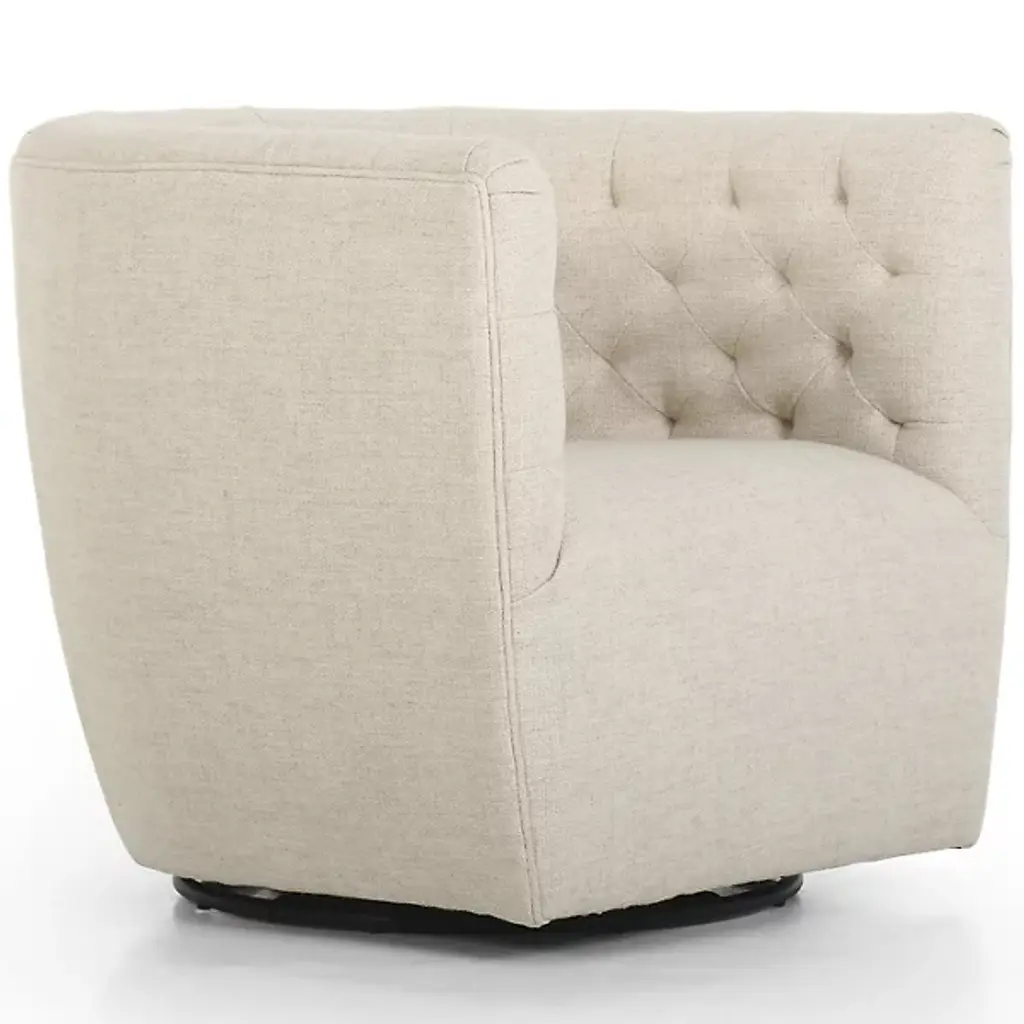 The Hanover Swivel Chair by Four Hands combines comfort and maneuverability. This chair is upholstered with a polyester and cotton blend for your comfort. The eye is drawn to the sophisticated, blind tufting element that lines the chair’s rounded seatback, giving this chair a tailored look. This chair is capable of swiveling for your convenience. Make the Hanover Swivel a decorative mainstay by placing it beside your favorite end table.