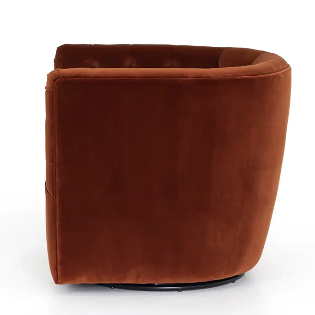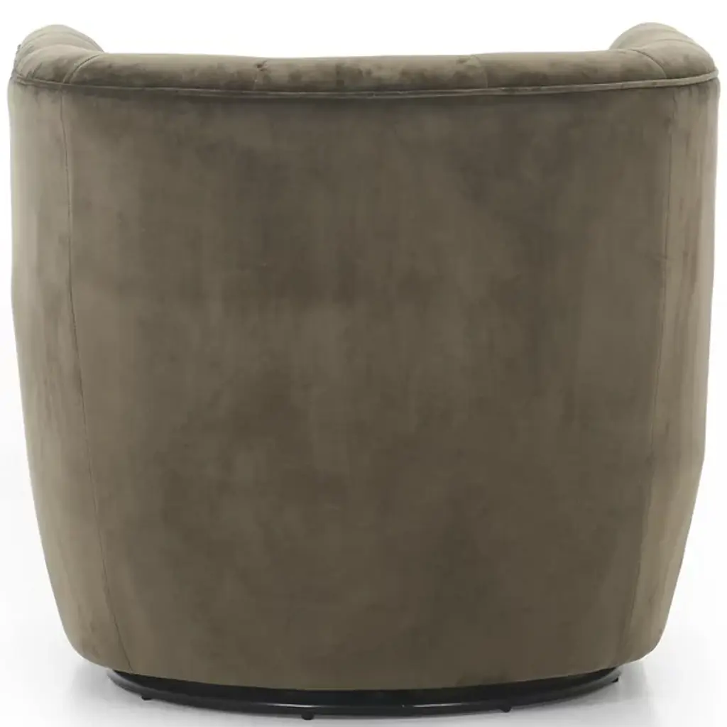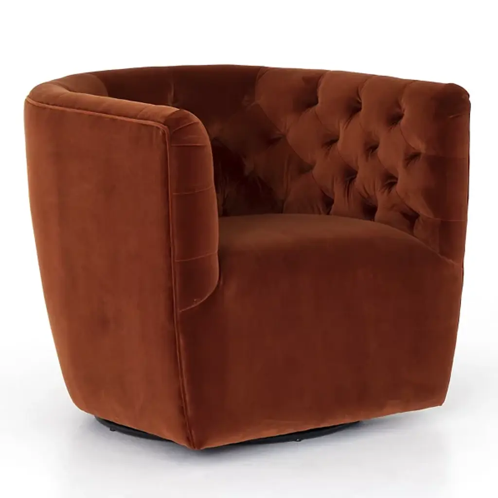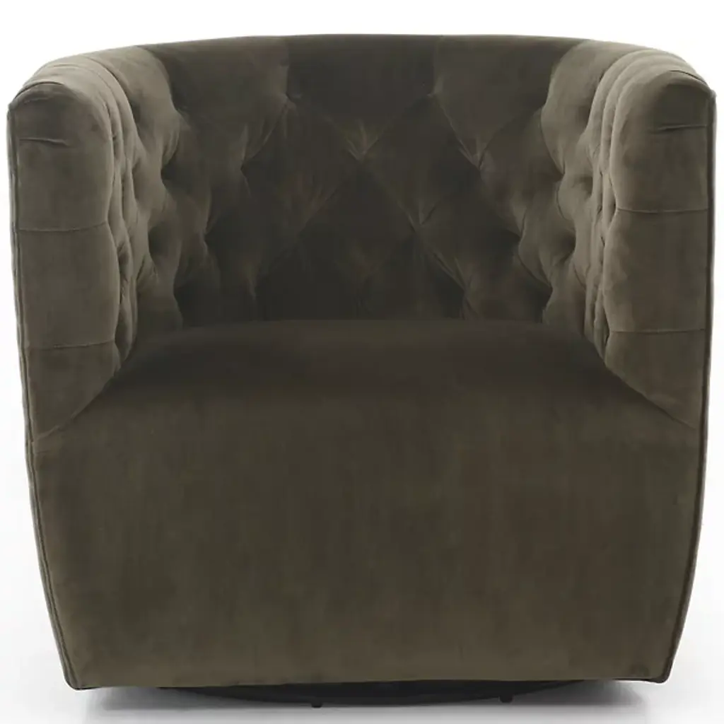 The Hanover Swivel Chair by Four Hands combines comfort and maneuverability. This chair is upholstered with a polyester and cotton blend for your comfort. The eye is drawn to the sophisticated, blind tufting element that lines the chair’s rounded seatback, giving this chair a tailored look. This chair is capable of swiveling for your convenience. Make the Hanover Swivel a decorative mainstay by placing it beside your favorite end table.