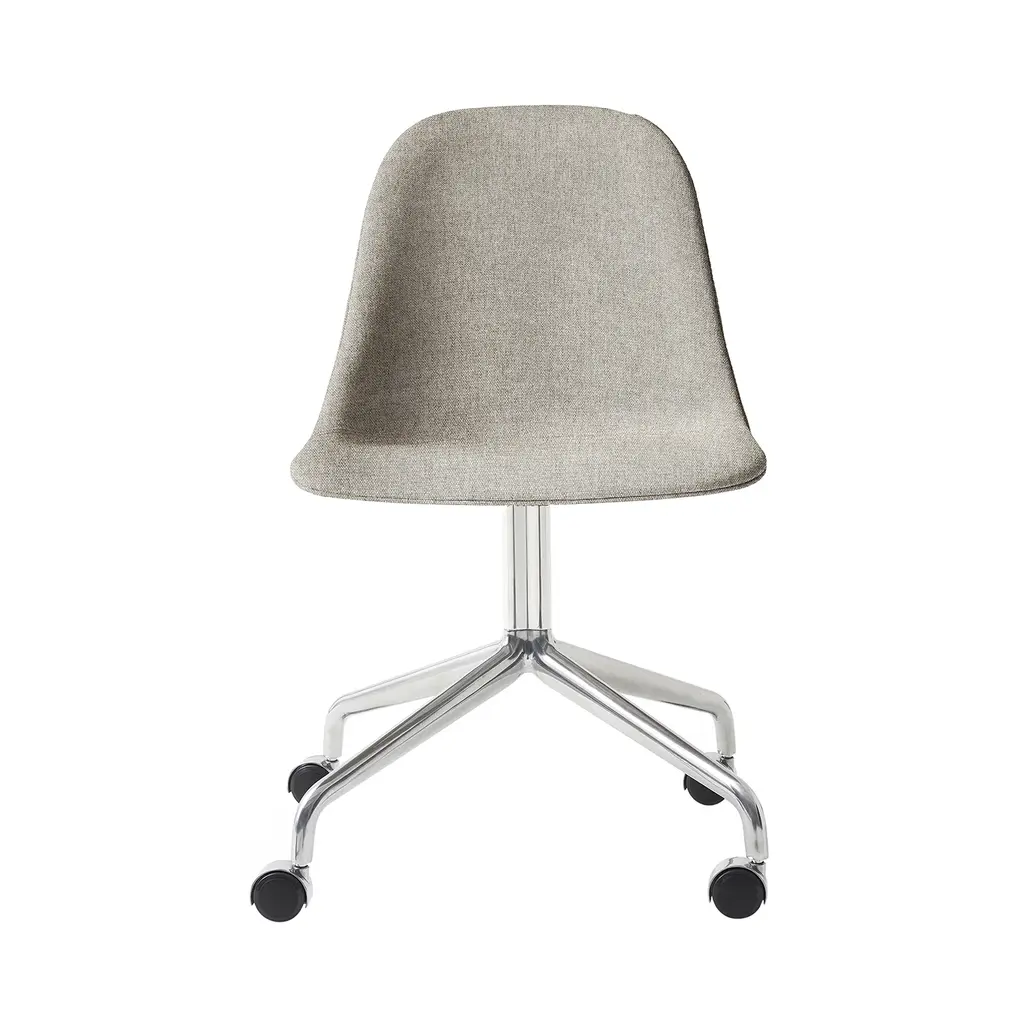 A choice of fine upholstery options elevates this version of Harbour’s side chair scaled for compact spaces and an easy fit under tables. A swivel base and casters grant free-wheeling mobility and the shell seat offers comfortable lumbar support. To complement the textile or leather upholstery, the unique clover-shaped base is available in a polished aluminum or powder-coated aluminum in either black or light grey.