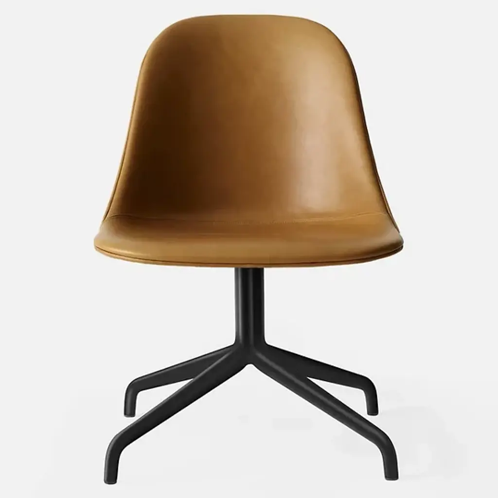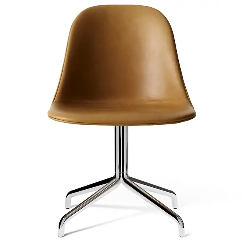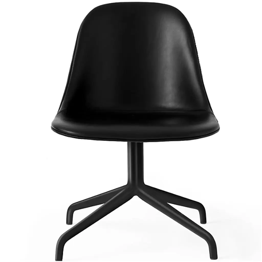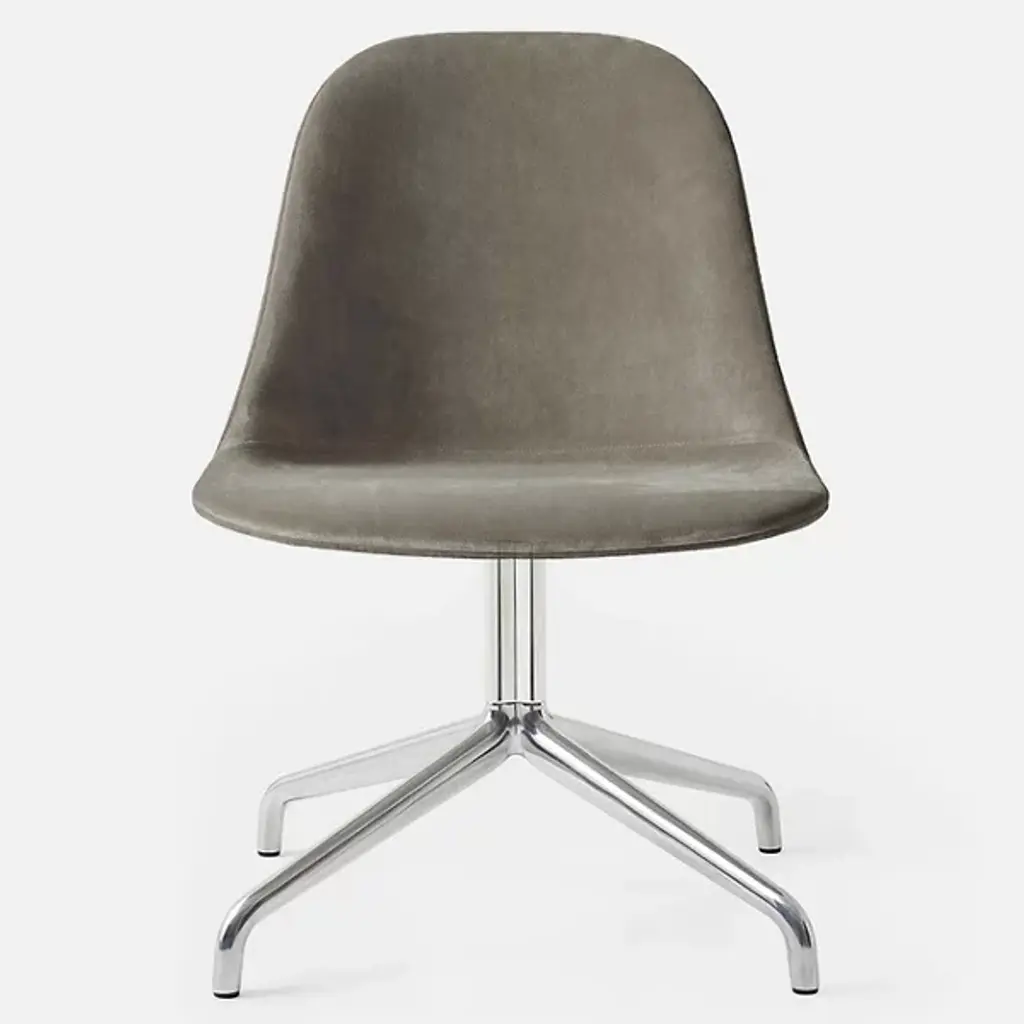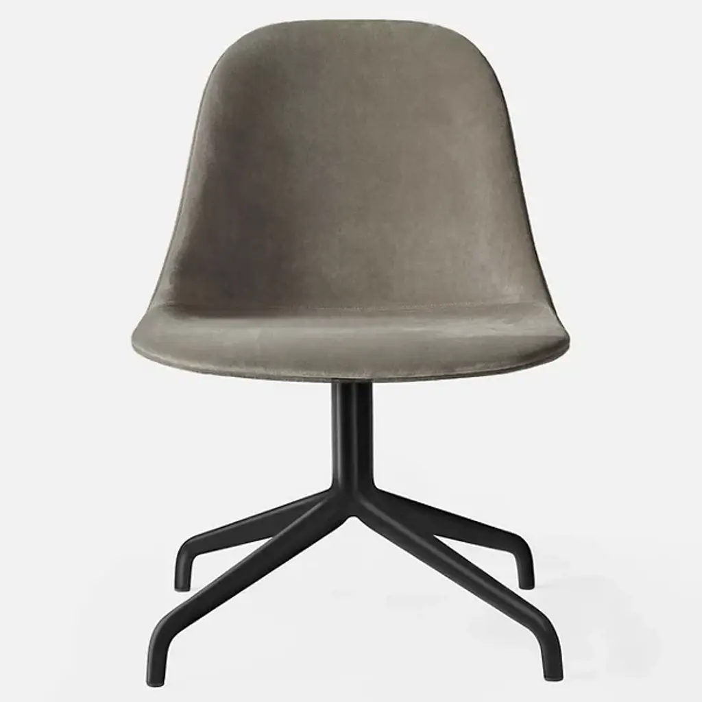 The Harbour Side Chair Swivel Base, Upholstered by Audo Copenhagen, formerly Menu, pairs minimalist style with a comfortable and versatile construction. A design from Norm Architects created for their Audo Space in the “Nordhavn,” or “Northern Harbour” zone in Copenhagen, it ascends from a sleek, clover-shaped swivel base that allows the upper seat to move and spin as needed. The seat itself is a continuous, enveloping shell with a spacious, ergonomic design, adding a modern flair that still coordinates well with a variety of décor styles. The design brings timeless simplicity to the home or office, inviting seated relaxation and stately swiveling.