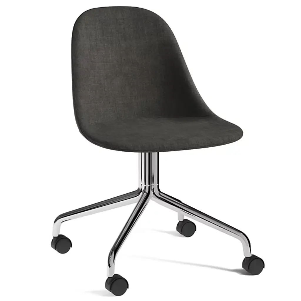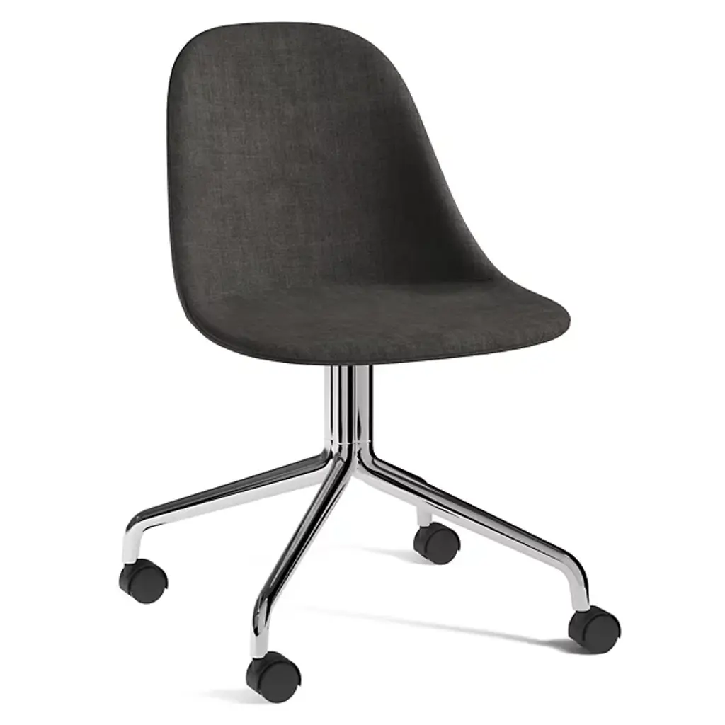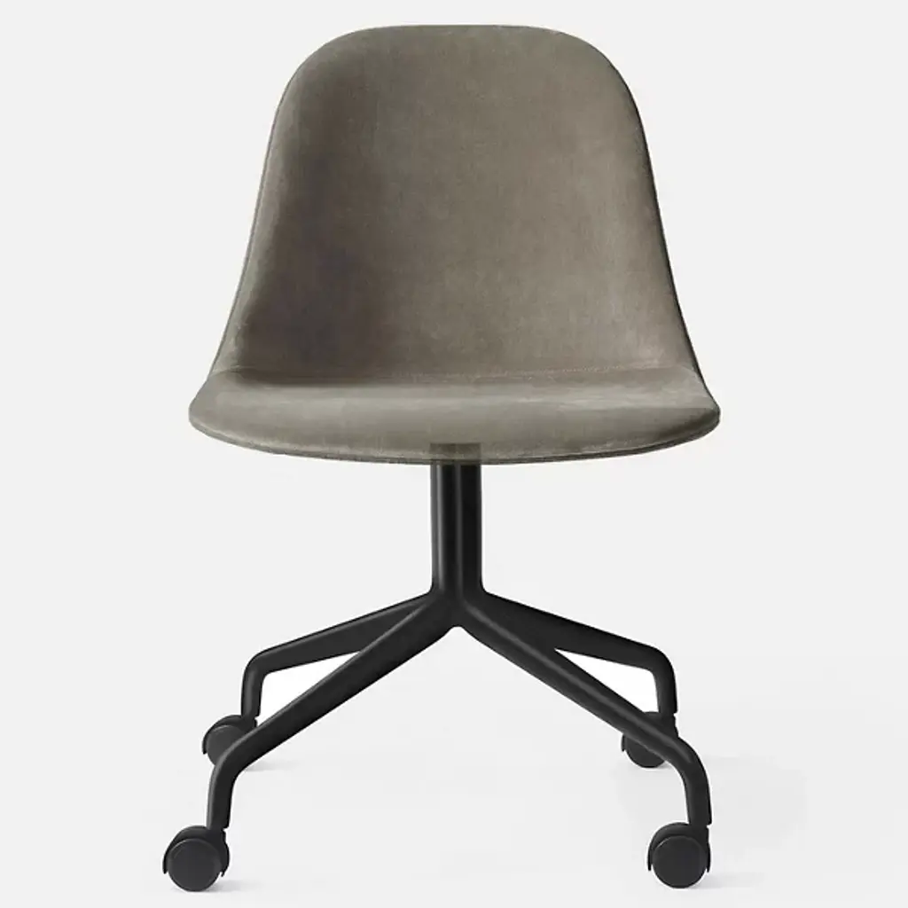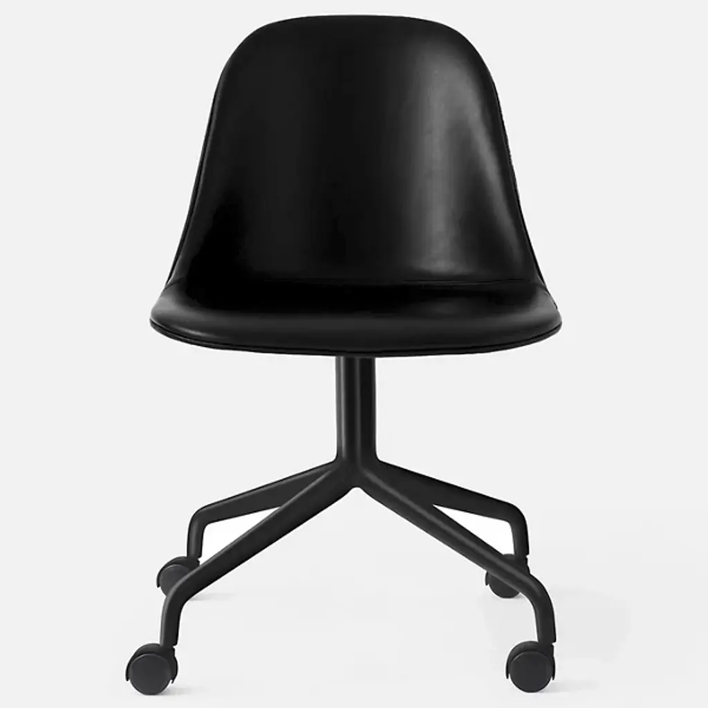 The Harbour Side Chair Swivel Base, Upholstered by Audo Copenhagen, formerly Menu, pairs minimalist style with a comfortable and versatile construction. A design from Norm Architects created for their Audo Space in the “Nordhavn,” or “Northern Harbour” zone in Copenhagen, it ascends from a sleek, clover-shaped swivel base that allows the upper seat to move and spin as needed. The seat itself is a continuous, enveloping shell with a spacious, ergonomic design, adding a modern flair that still coordinates well with a variety of décor styles. The design brings timeless simplicity to the home or office, inviting seated relaxation and stately swiveling.