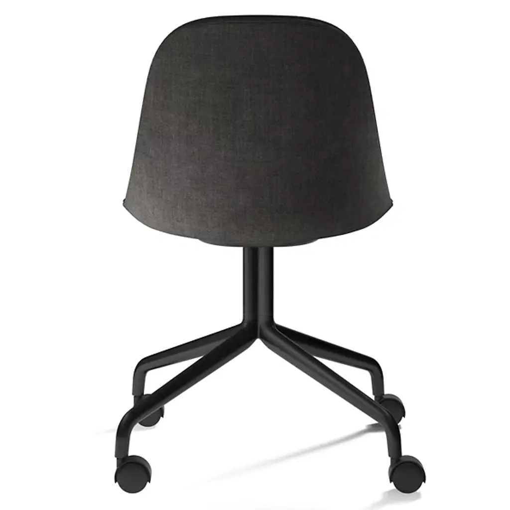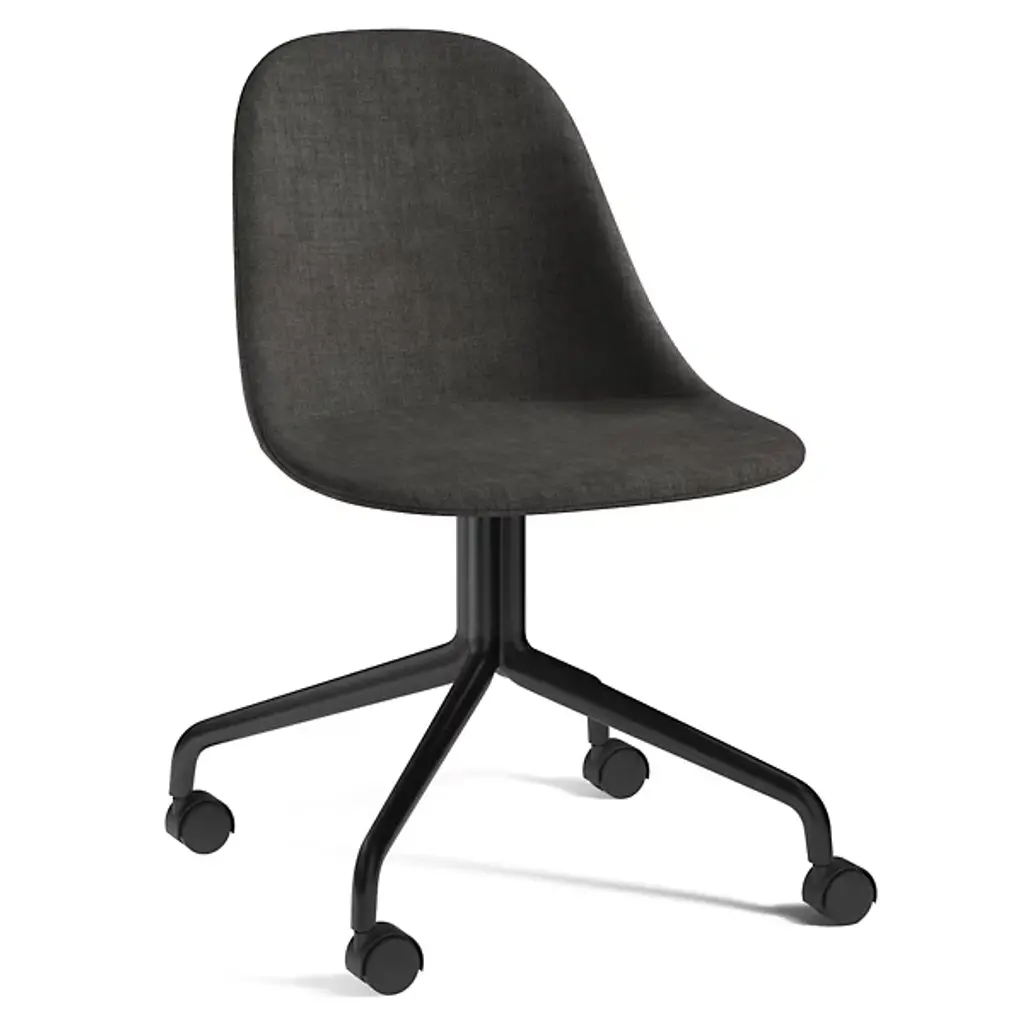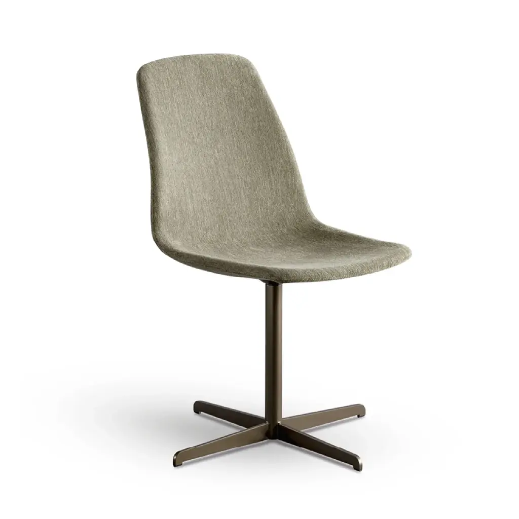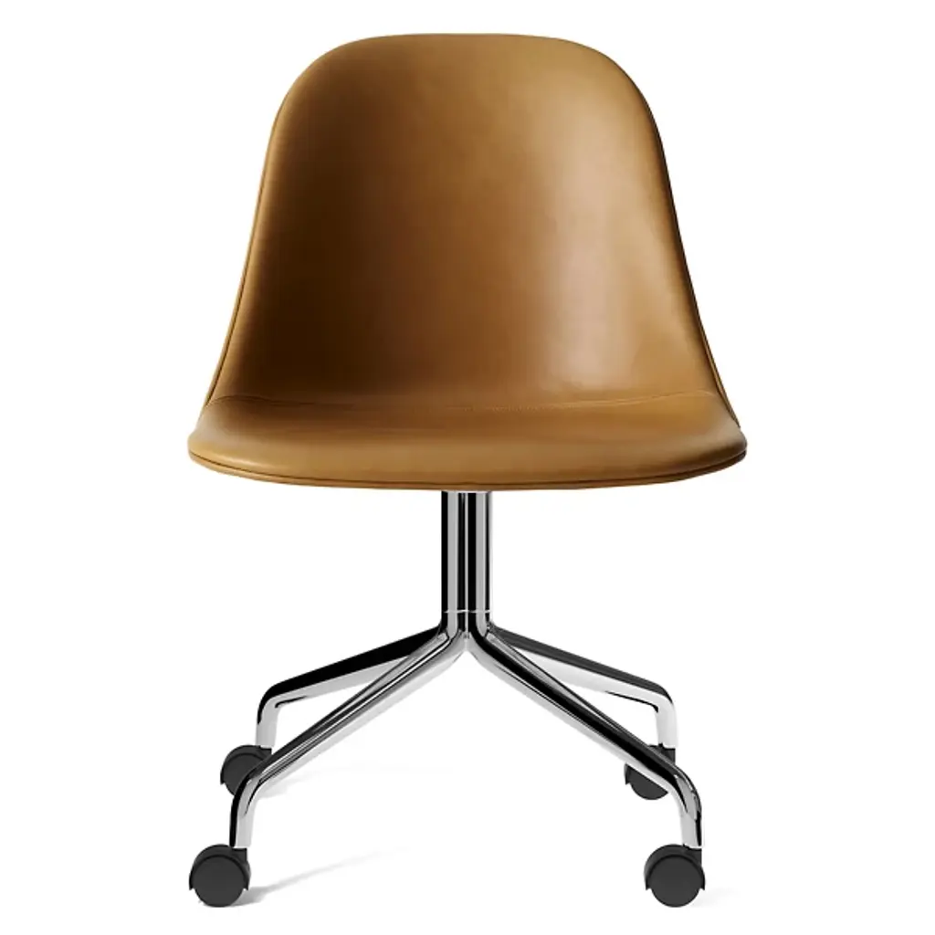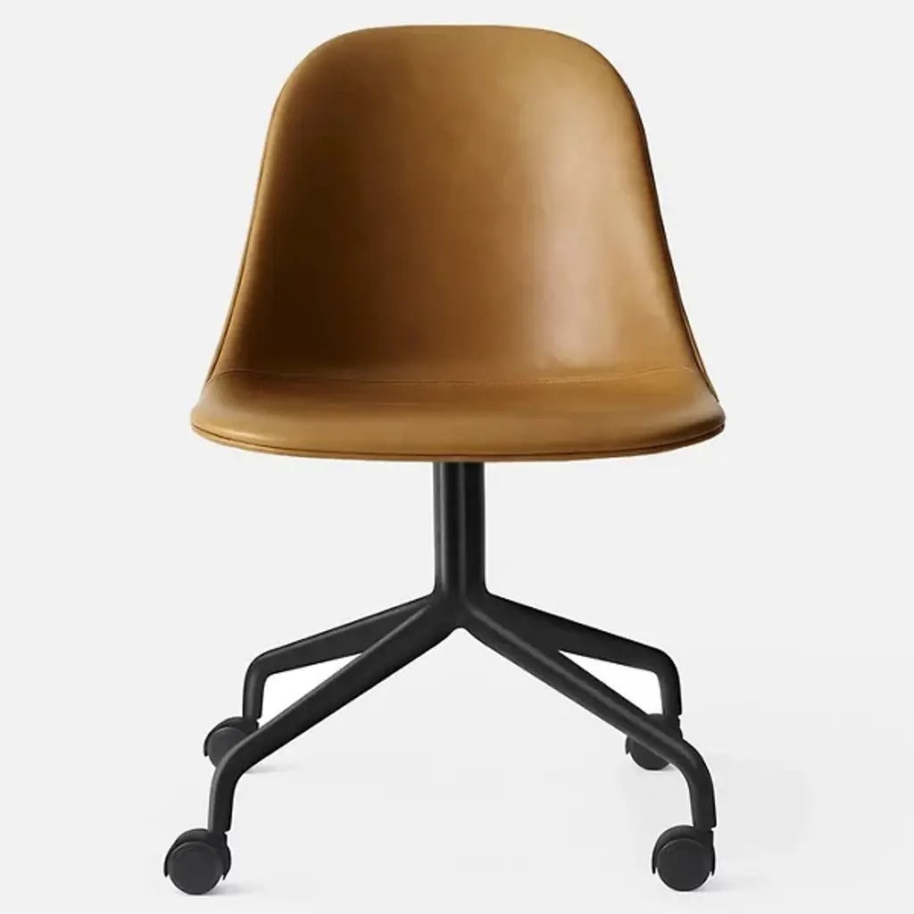 The Harbour Side Chair Swivel Base, Upholstered by Audo Copenhagen, formerly Menu, pairs minimalist style with a comfortable and versatile construction. A design from Norm Architects created for their Audo Space in the “Nordhavn,” or “Northern Harbour” zone in Copenhagen, it ascends from a sleek, clover-shaped swivel base that allows the upper seat to move and spin as needed. The seat itself is a continuous, enveloping shell with a spacious, ergonomic design, adding a modern flair that still coordinates well with a variety of décor styles. The design brings timeless simplicity to the home or office, inviting seated relaxation and stately swiveling.