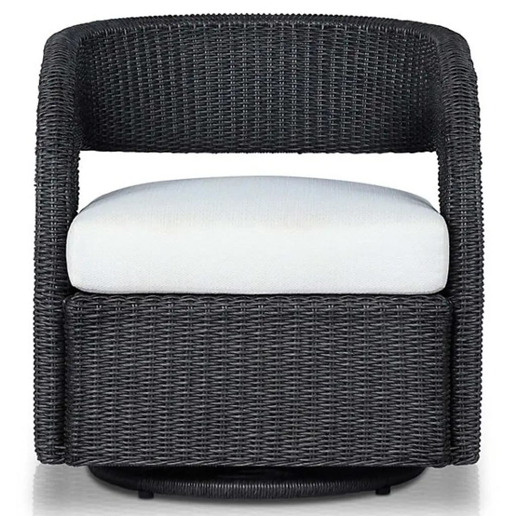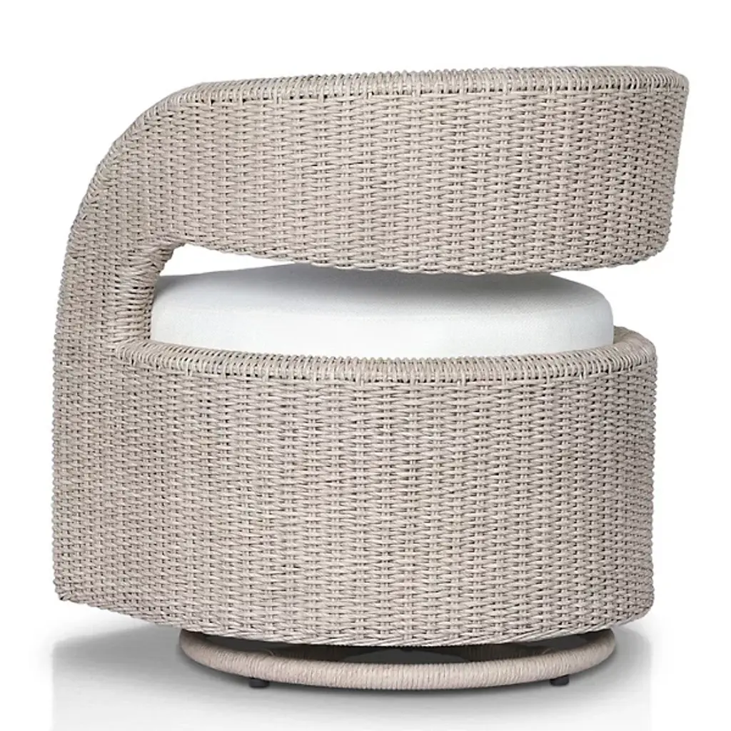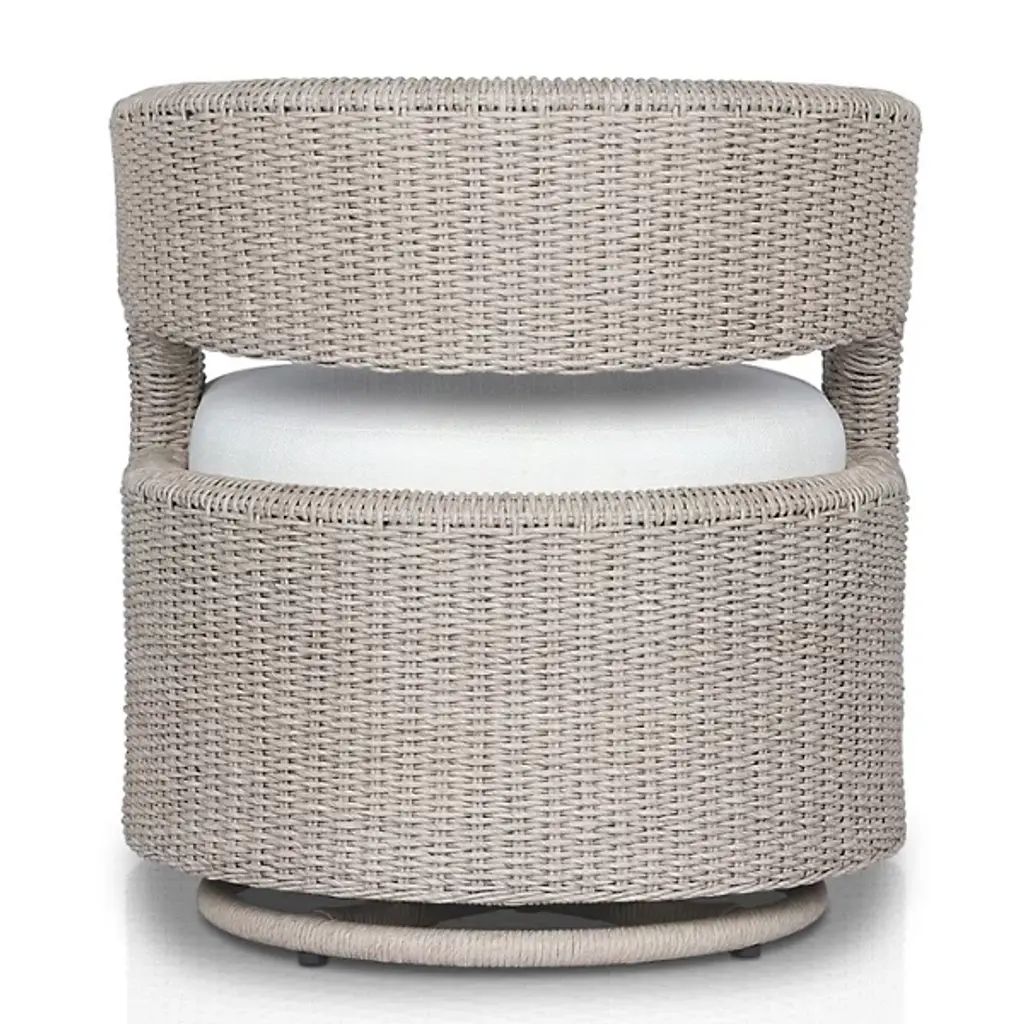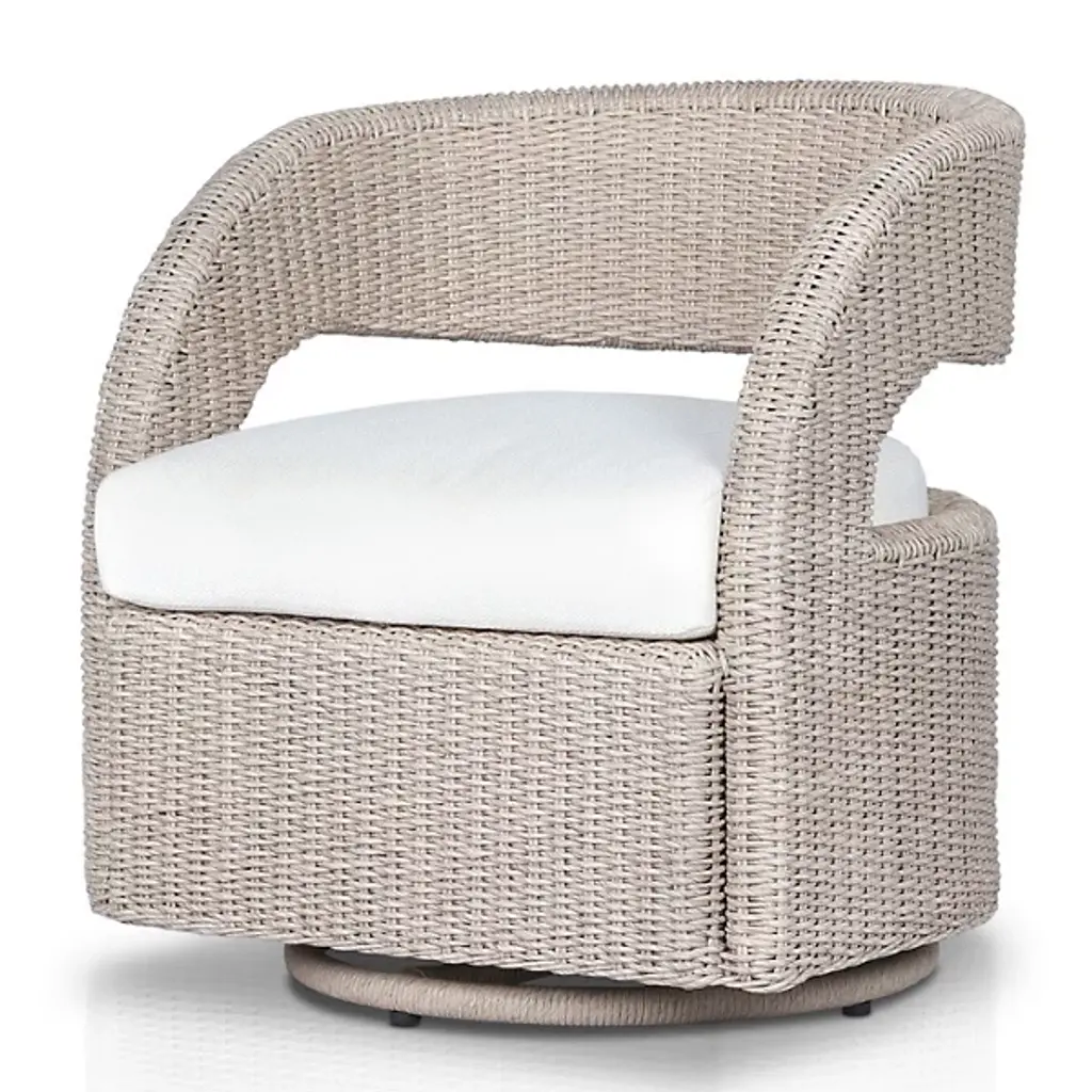 The Hawkins Outdoor Swivel Chair from Four Hands is made with the quintessential contours and open profile of the Hawkins family. It is built to withstand the elements easily and boasts swivel capability for 360 degrees of movement. It has UV-resistant, water-repellent quick-drying abilities. Hawkins comprises Olefin and an intricate polyethylene weave. Its fabric features a comfy 91% polyurethane foam pad and 9% polyester fiber. 100% polyethylene filler adds the finishing touch.