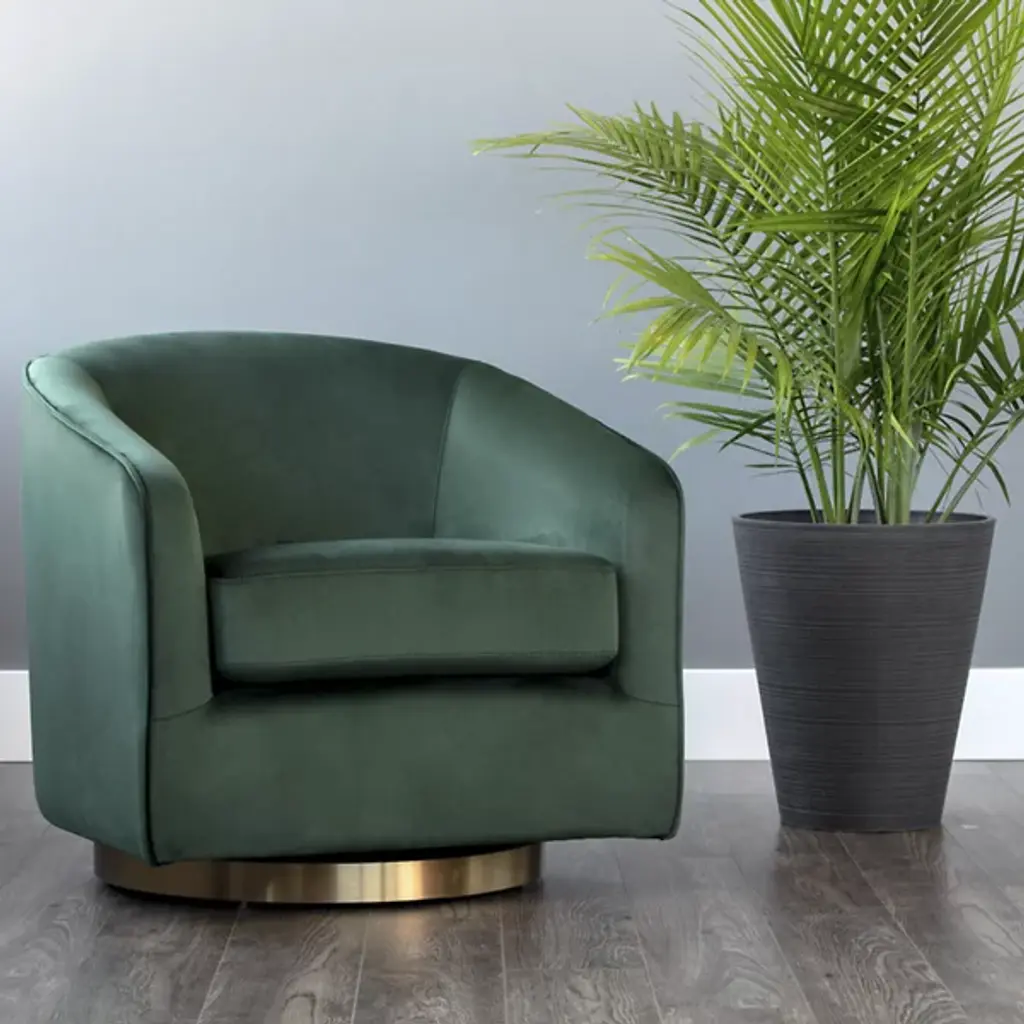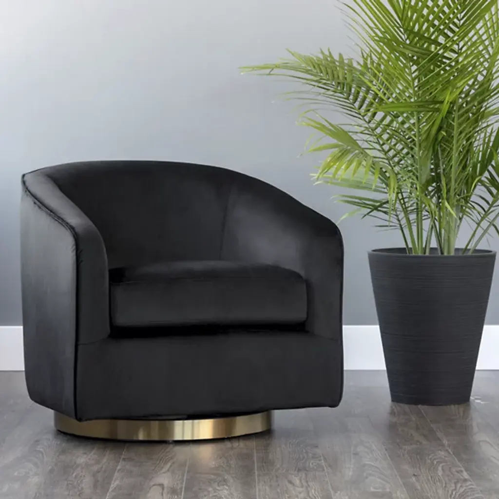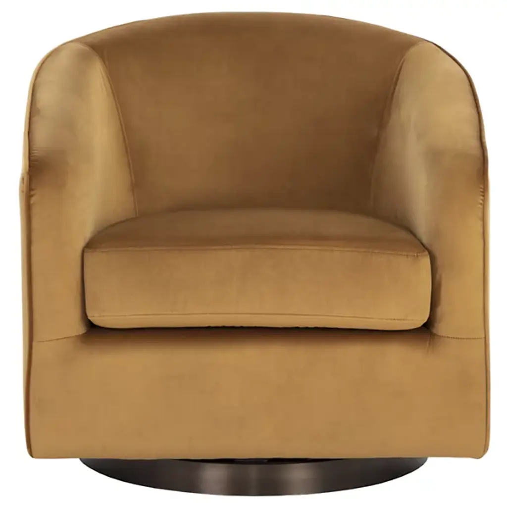 The Hazel Swivel Lounge Chair from Sunpan is a casual fusion of comfort and retro style, perfect for living rooms, lounges, or office spaces looking for a new spin on comfort. It features a graceful barrel-back silhouette upholstered in soft, strong fabric, cradling you in plush, high-resiliency foam beneath. The rich fabric contrasts with a dark bronze stainless steel round base, offering smooth 360-degree swivel functionality, combining practicality with understated elegance, and its design plays well in both mid-century modern and contemporary interiors.