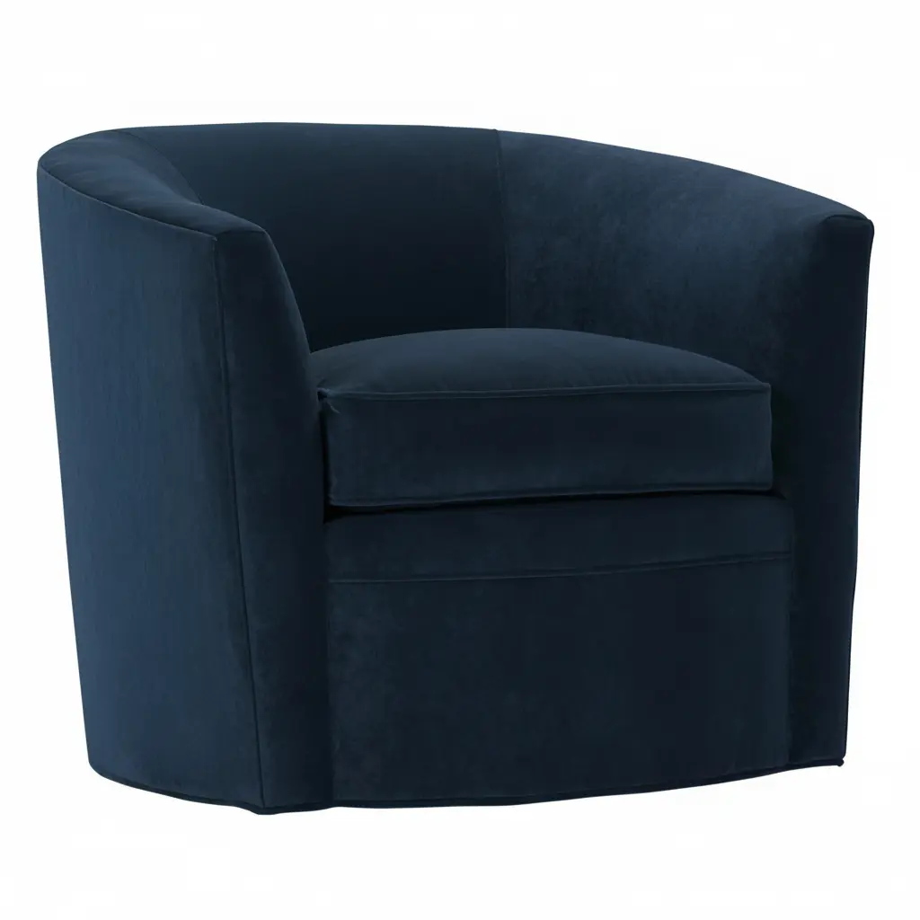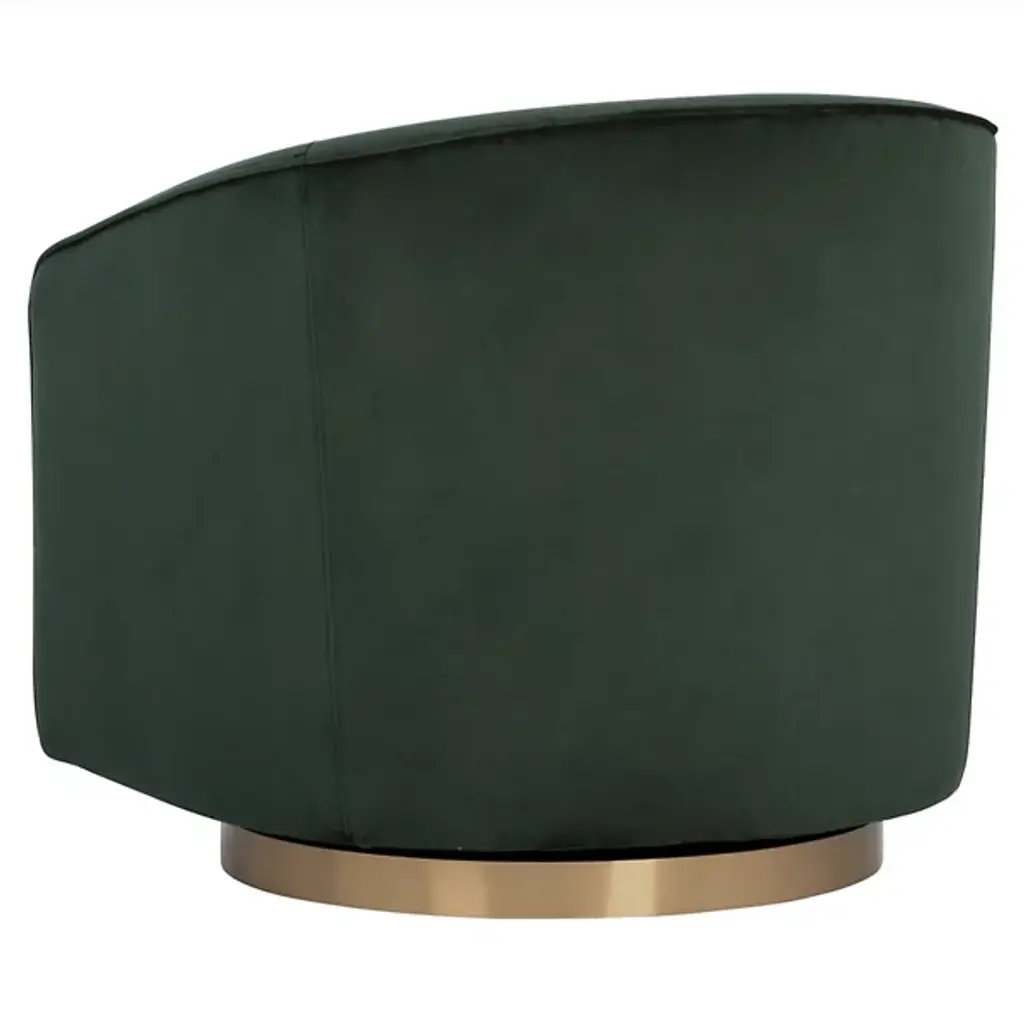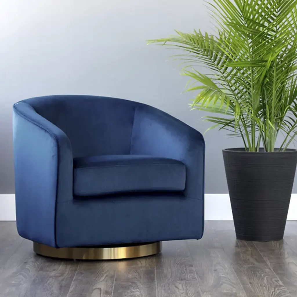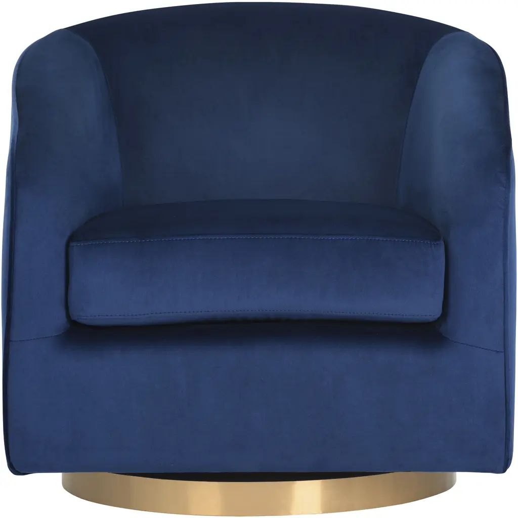 The Hazel Swivel Lounge Chair from Sunpan is a casual fusion of comfort and retro style, perfect for living rooms, lounges, or office spaces looking for a new spin on comfort. It features a graceful barrel-back silhouette upholstered in soft, strong fabric, cradling you in plush, high-resiliency foam beneath. The rich fabric contrasts with a dark bronze stainless steel round base, offering smooth 360-degree swivel functionality, combining practicality with understated elegance, and its design plays well in both mid-century modern and contemporary interiors.