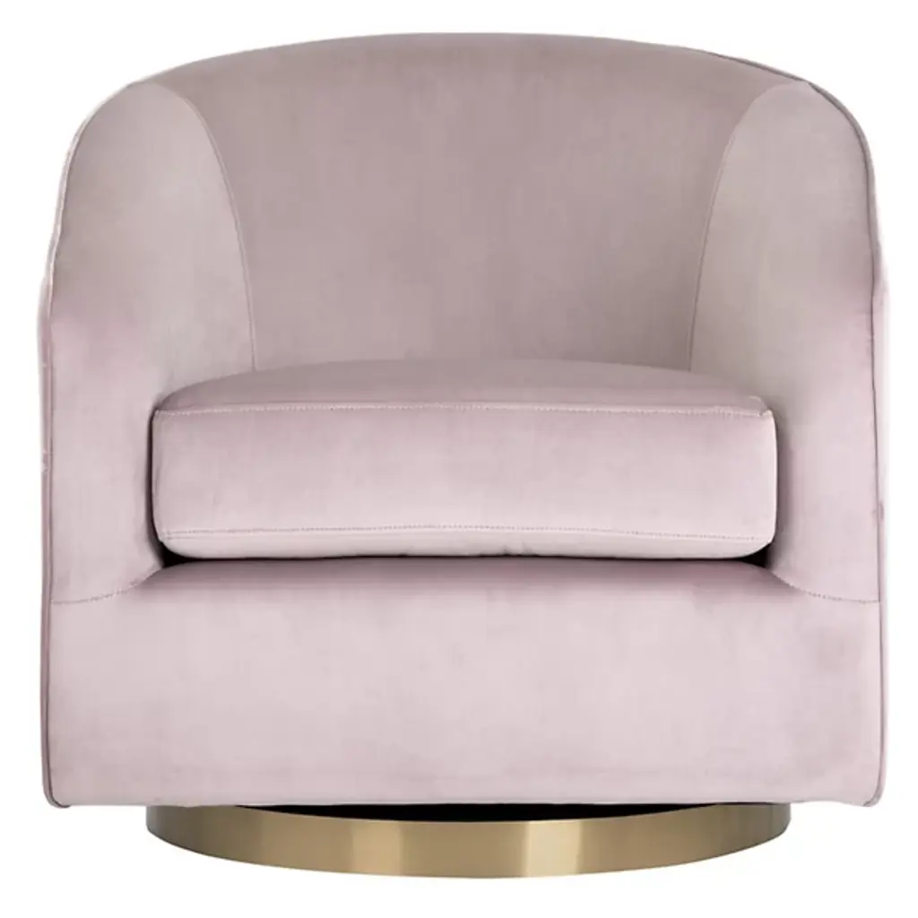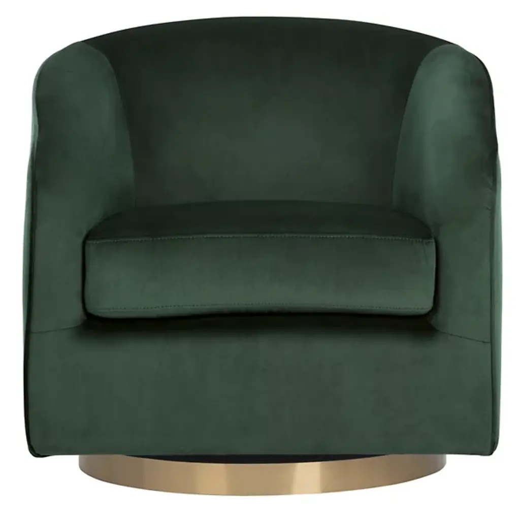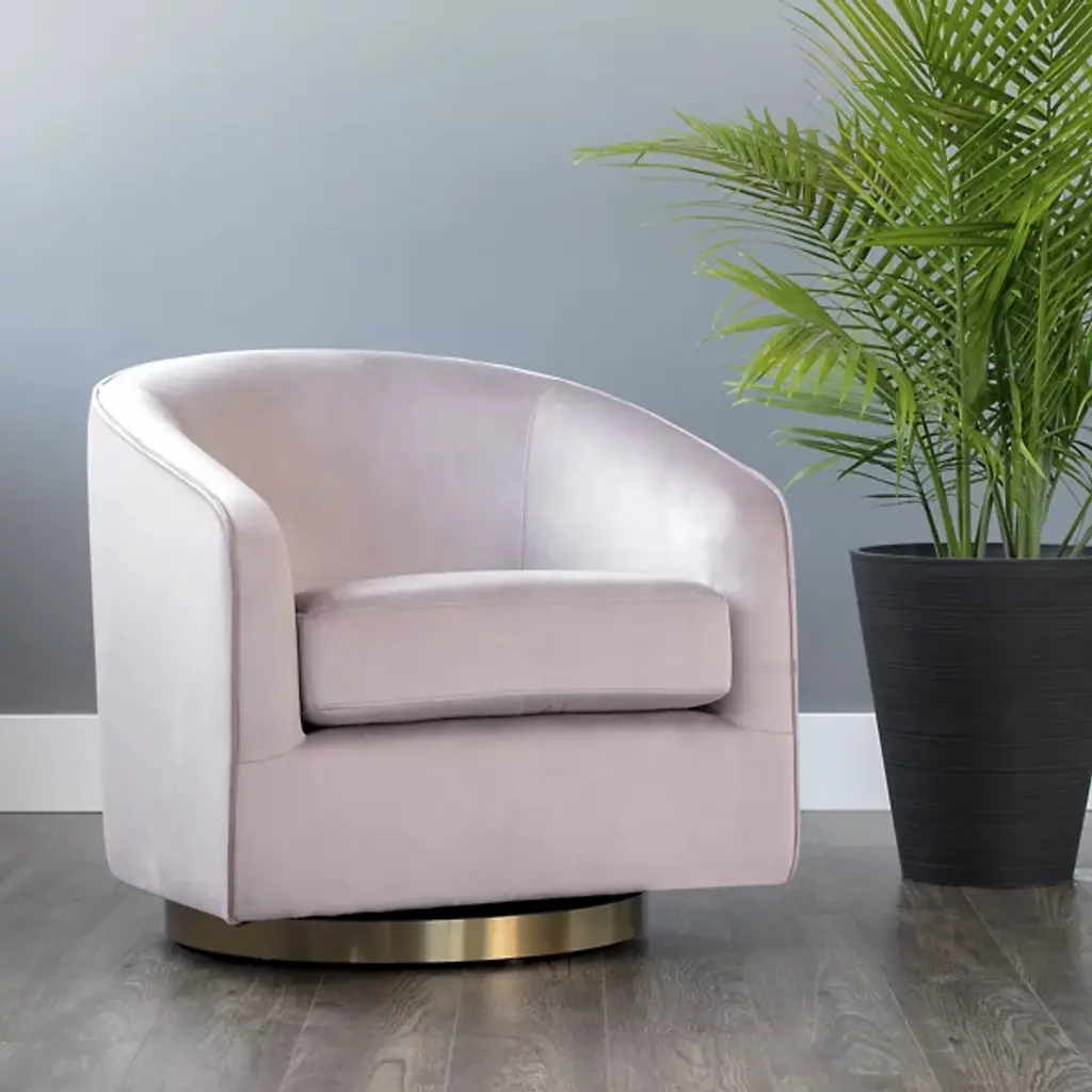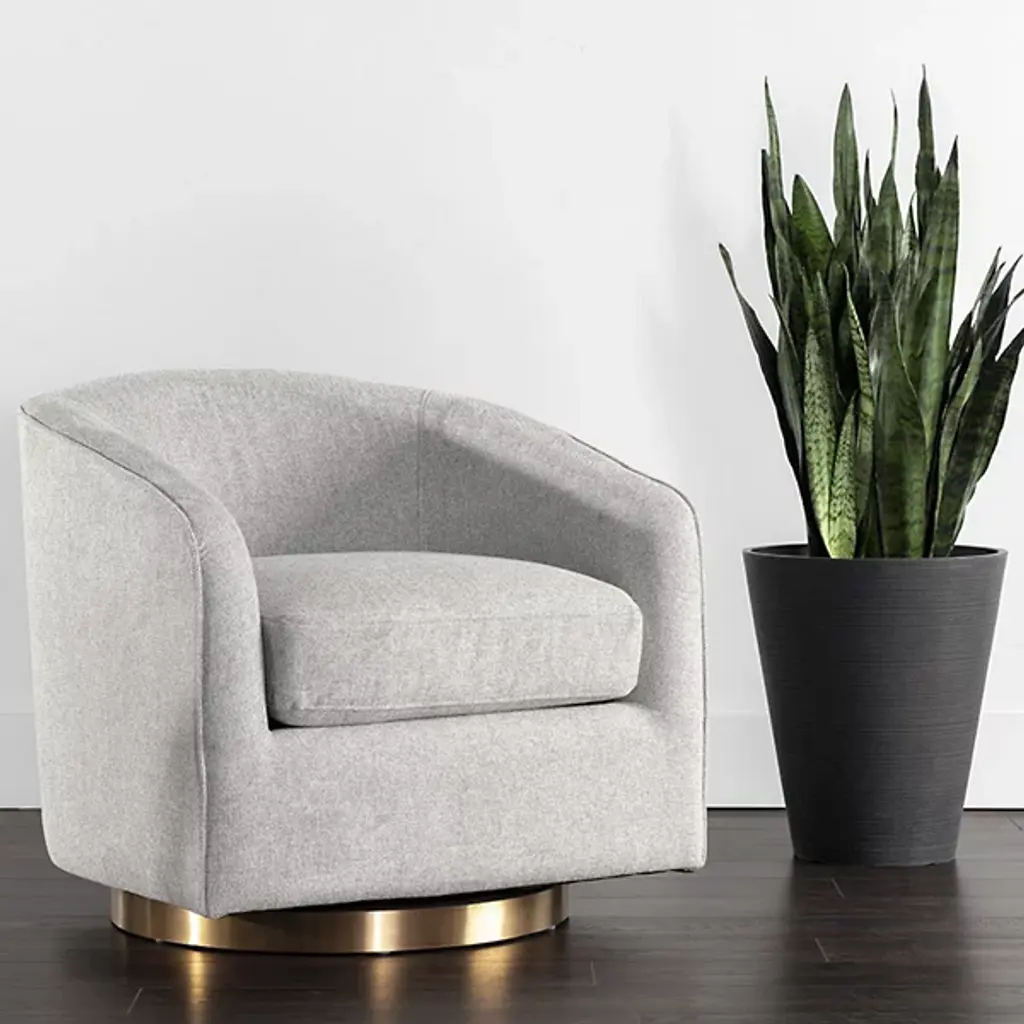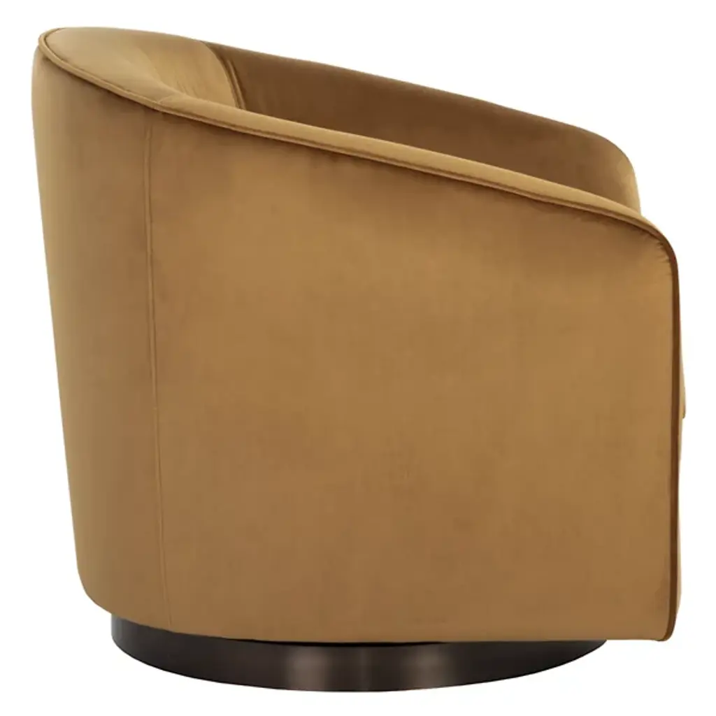 The Hazel Swivel Lounge Chair from Sunpan is a casual fusion of comfort and retro style, perfect for living rooms, lounges, or office spaces looking for a new spin on comfort. It features a graceful barrel-back silhouette upholstered in soft, strong fabric, cradling you in plush, high-resiliency foam beneath. The rich fabric contrasts with a dark bronze stainless steel round base, offering smooth 360-degree swivel functionality, combining practicality with understated elegance, and its design plays well in both mid-century modern and contemporary interiors.