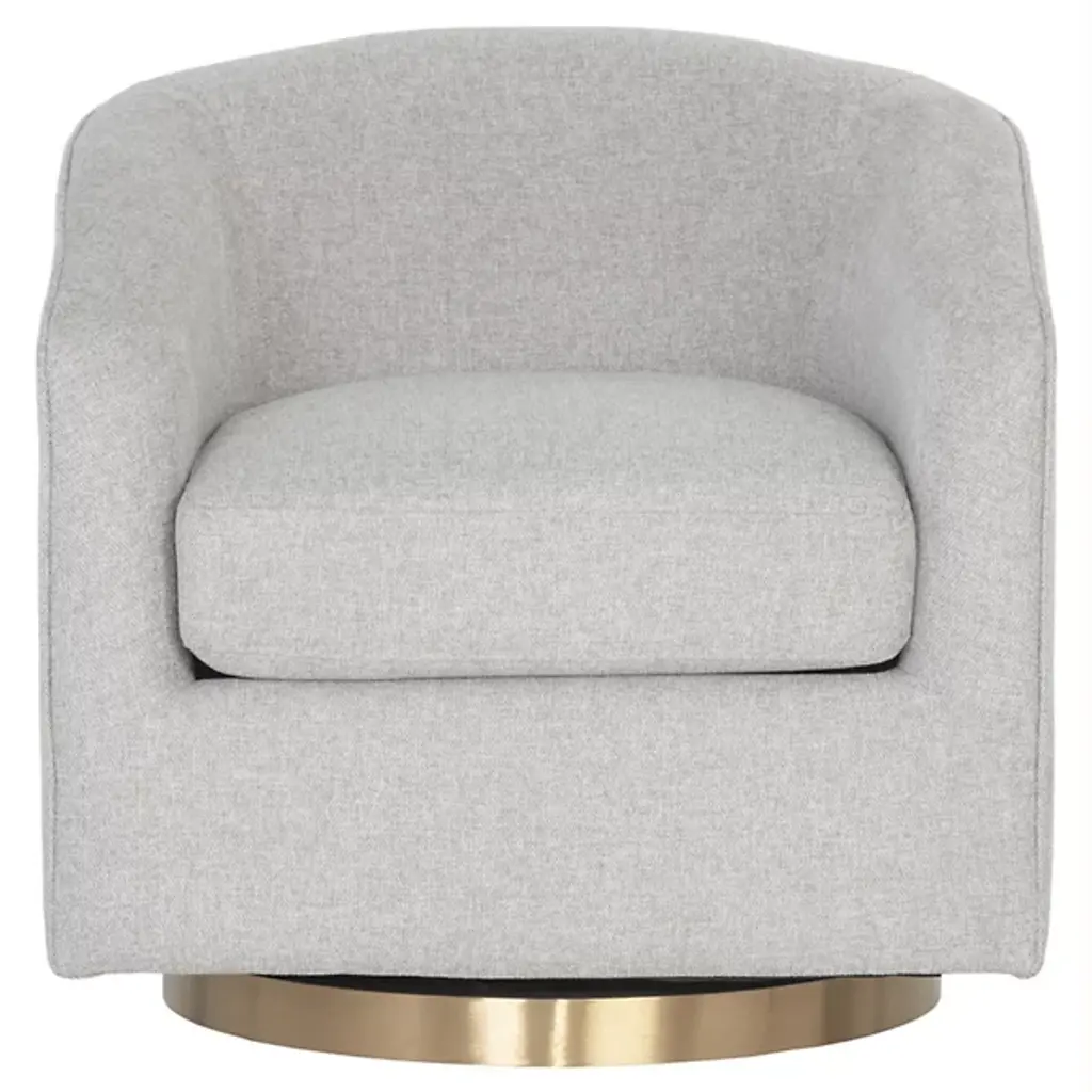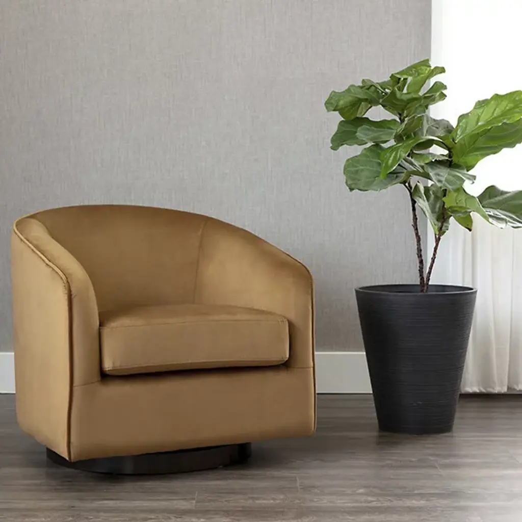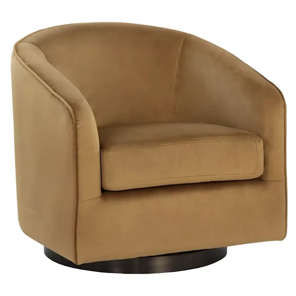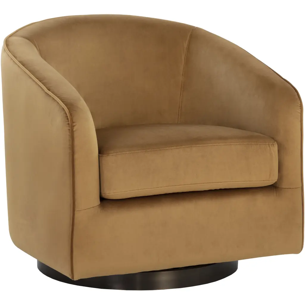 The Hazel Swivel Lounge Chair from Sunpan is a casual fusion of comfort and retro style, perfect for living rooms, lounges, or office spaces looking for a new spin on comfort. It features a graceful barrel-back silhouette upholstered in soft, strong fabric, cradling you in plush, high-resiliency foam beneath. The rich fabric contrasts with a dark bronze stainless steel round base, offering smooth 360-degree swivel functionality, combining practicality with understated elegance, and its design plays well in both mid-century modern and contemporary interiors.
