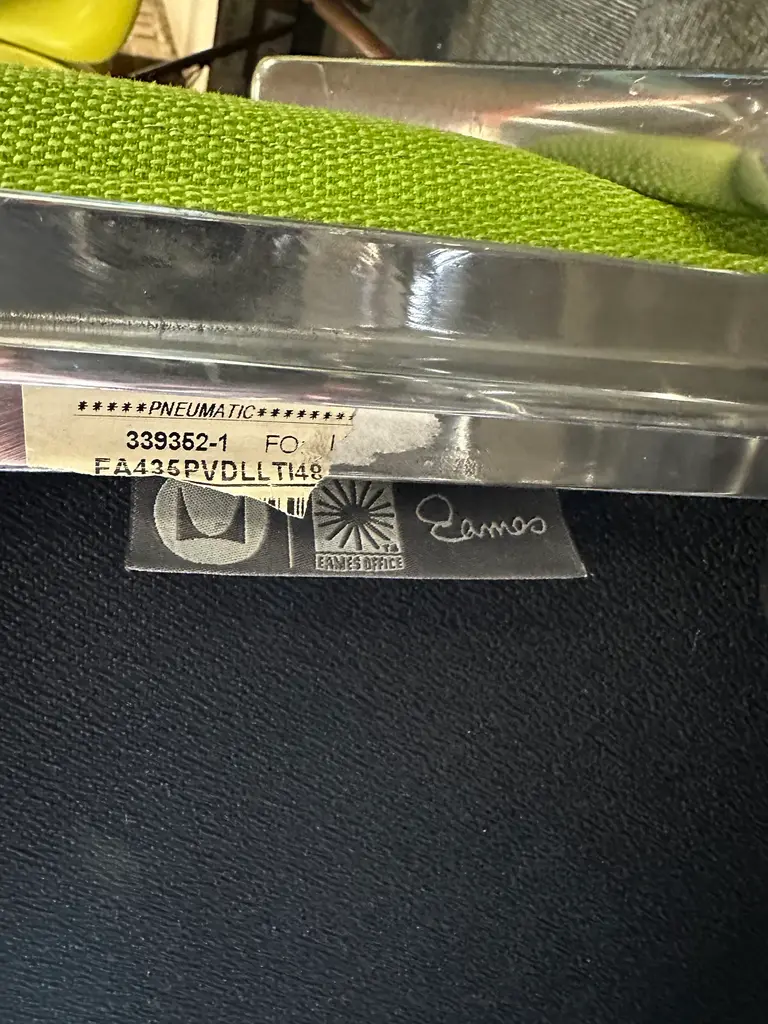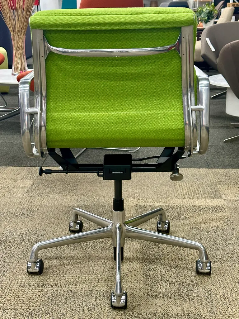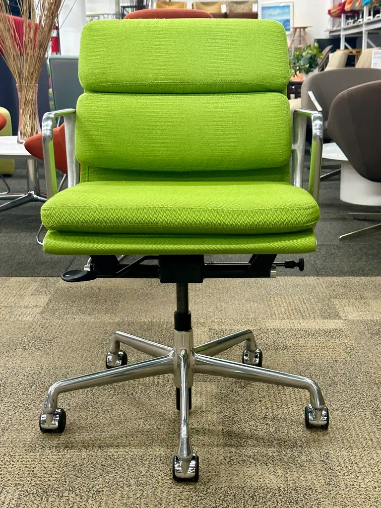 Pre-owned Herman Miller Eames Soft Pad, Management Height Chair. One look at the Eames soft pad office chair, and you'll see echoes of its predecessor, the iconic Aluminum Group Collection. A contoured aluminum frame bolsters plush, 2"-thick cushions that you'll sink right into and never want to leave. Finishes: Neon, TI48. Features: Smooth Swivel Seat / Height Adjustable Seat with Pneumatic / Five-star base with casters. Dimensions:23" W x 16 1/2" D x 19 3/4" Seat Height, 32 1/4" Height Min (in) - 36" Overall Height.
