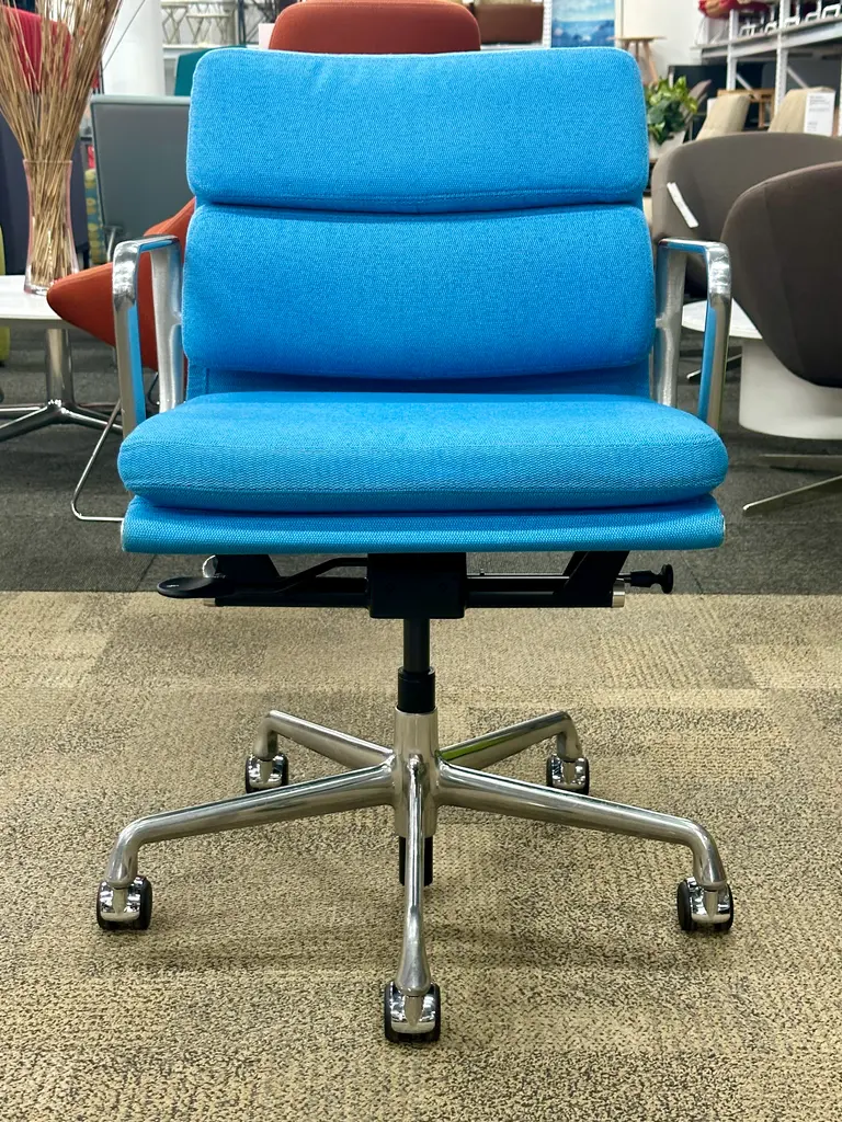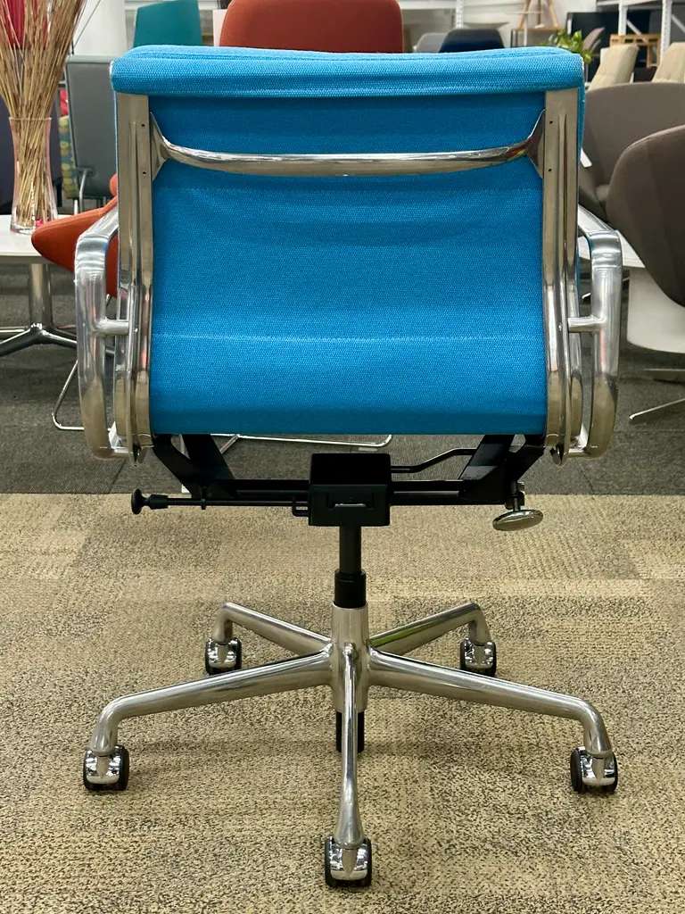 Pre-owned Herman Miller Eames Soft Pad, Management Height Chair. One look at the Eames soft pad office chair, and you'll see echoes of its predecessor, the iconic Aluminum Group Collection. A contoured aluminum frame bolsters plush, 2"-thick cushions that you'll sink right into and never want to leave. Finishes: Hydrangea, TI50. Features: Smooth Swivel Seat / Height Adjustable Seat with Pneumatic / Five-star base with casters. Dimensions:23" W x 16 1/2" D x 19 3/4" Seat Height, 32 1/4" Height Min (in) - 36" Overall Height.