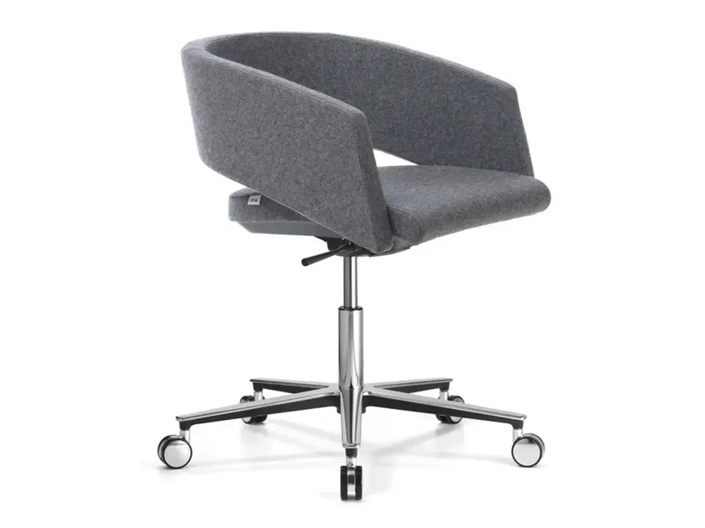 Hibiscus is a trestle chair on wheels.Technical featuresInner frameDouble radius stratified curved beech plywood, warm shaped, 14 mm thickness. Various wood essences are available. Foam moulded polyurethane, density 40 kg/m3.PaddingSeat and backrest foam made of flexible polyurethane, crushproof, density D40/RC thickness 30 mm, rear backrest D40/RC thickness 0,5 mm. CFC-free.Bearing frameUnion of two symmetrical bended shapes in beech, 14 mm thickness, foldaway combined through special glues and through 3 steel blades fixed with special screws Wurth®.BaseFour spoke swivel base made of lacquered die-cast aluminium, anti-slip glides assembled.Available FSC® certifiedThe simple and smooth lines, combined with a refined aesthetic structure, make Hibiscus a versatile chair able to change atmosphere and character according to the chosen color combinations. A refined chair which does not invade the space where it is located, suitable for public and private environments.