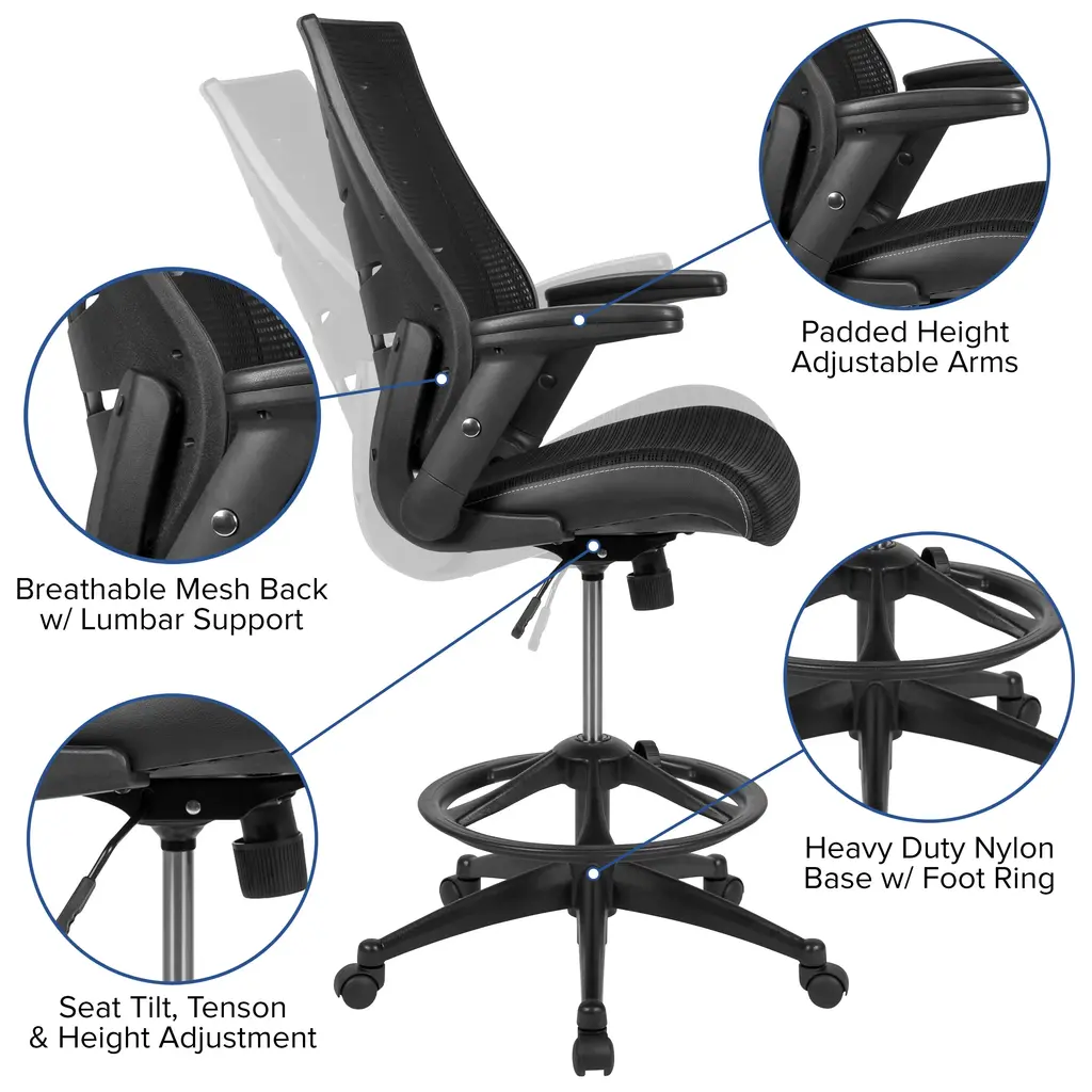 High Back Mesh Spine-Back Ergonomic Drafting Chair With Adjustable Foot Ring And Adjustable Flip-Up Arms