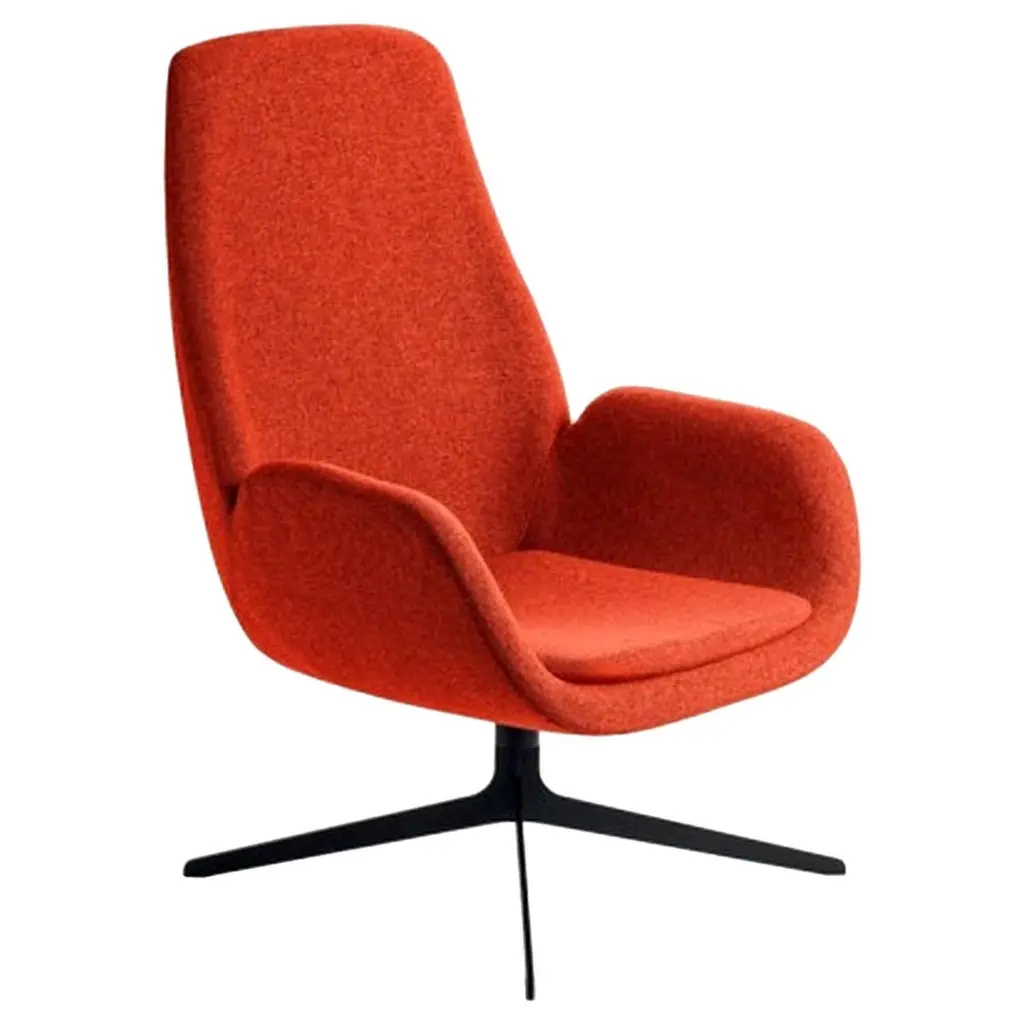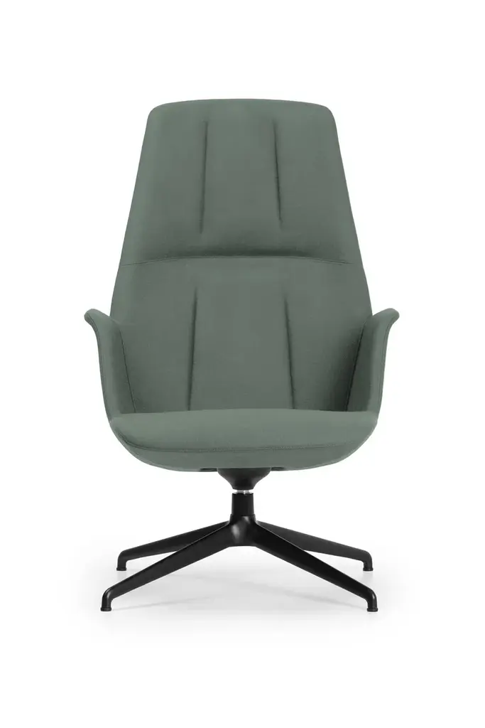 Hive is a swivel armchair upholstered and covered in fabric with high back and aluminum trestle base.10 years after its debut in the market as an executive office chair and waiting armchair, Hive has been revisited and redesigned to adapt to the new needs of the lounge, waiting and hospitality segment.The new polyurethane shell is available in chair and armchair version with double backrest height. The design is characterized by the pronounced lines of the compact armrest and the stitching that shapes the backrest in a vertical direction. It is available with a solid wood 4 legs base or with a 4-spoke steel swivel base.