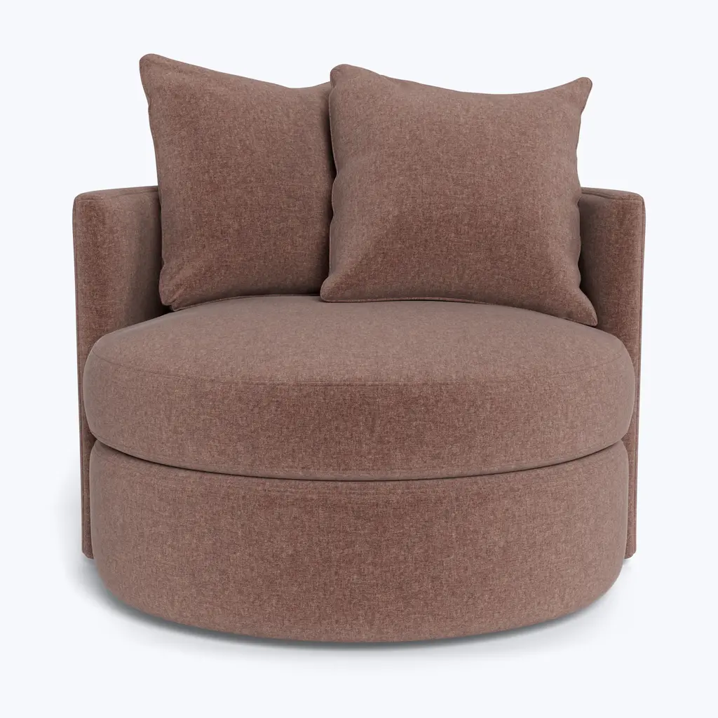 The Hollywood Swivel Chair, exclusively from ABC Carpet & Home, is the ultimate blend of playful elegance and cozy comfort. With its signature curved, round design and plush seating, this chair is perfect for any room where comfort and style meet. Whether you're looking to add a stylish accent to your living room, create a cozy nook in your bedroom, or make a reading corner that’s both functional and inviting, the Hollywood Swivel Chair delivers on all fronts. One of the standout features of this chair is its ability to spin—round, round, round—giving it a playful and dynamic quality that sets it apart from traditional seating options. The Hollywood Swivel Chair is not just designed to sit still; it’s meant to move with you, offering a fun and interactive experience while still maintaining the sophisticated elegance you expect from an exclusive piece at ABC Carpet & Home. The chair comes with two generously filled back pillows, packed with feather and down for that soft, sink-into-me feeling. These pillows provide exceptional support, making the chair a truly snuggle-worthy option for moments of relaxation. Whether you’re curled up with a good book, chatting with friends, or just enjoying a quiet moment, the Hollywood Swivel Chair offers the kind of loungy, cozy seating that makes you want to stay awhile. Crafted with a sustainably sourced Goodwood frame, the chair combines eco-conscious materials with exceptional craftsmanship, ensuring that it not only looks good but is made to last. The soft curves and rounded profile of the chair provide a modern silhouette, blending seamlessly into contemporary or eclectic interiors alike. It’s the kind of chair that commands attention in any room, but its plush seating ensures that it’s not just about looks—it’s designed for pure comfort. Customizing your Hollywood Swivel Chair is easy, with over 80 fabric options available, ranging from luxurious velvets and soft linens to durable blends. You can tailor the chair to suit your unique style and space, making it the perfect fit for your home. Whether you’re looking to create a cozy reading nook, a chic bedroom accent, or a functional piece that adds flair to your living room, the Hollywood Swivel Chair is the perfect choice. Handcrafted and made to order, this chair will be delivered to your home within 8-10 weeks, offering both luxury and comfort in every spin. So whether you're sinking into its soft embrace after a long day or adding a stylish touch to your home decor, the Hollywood Swivel Chair offers a delightful blend of fun and sophistication. It’s not just a chair—it’s a statement piece, a conversation starter, and, above all, a place to get cozy and relax.