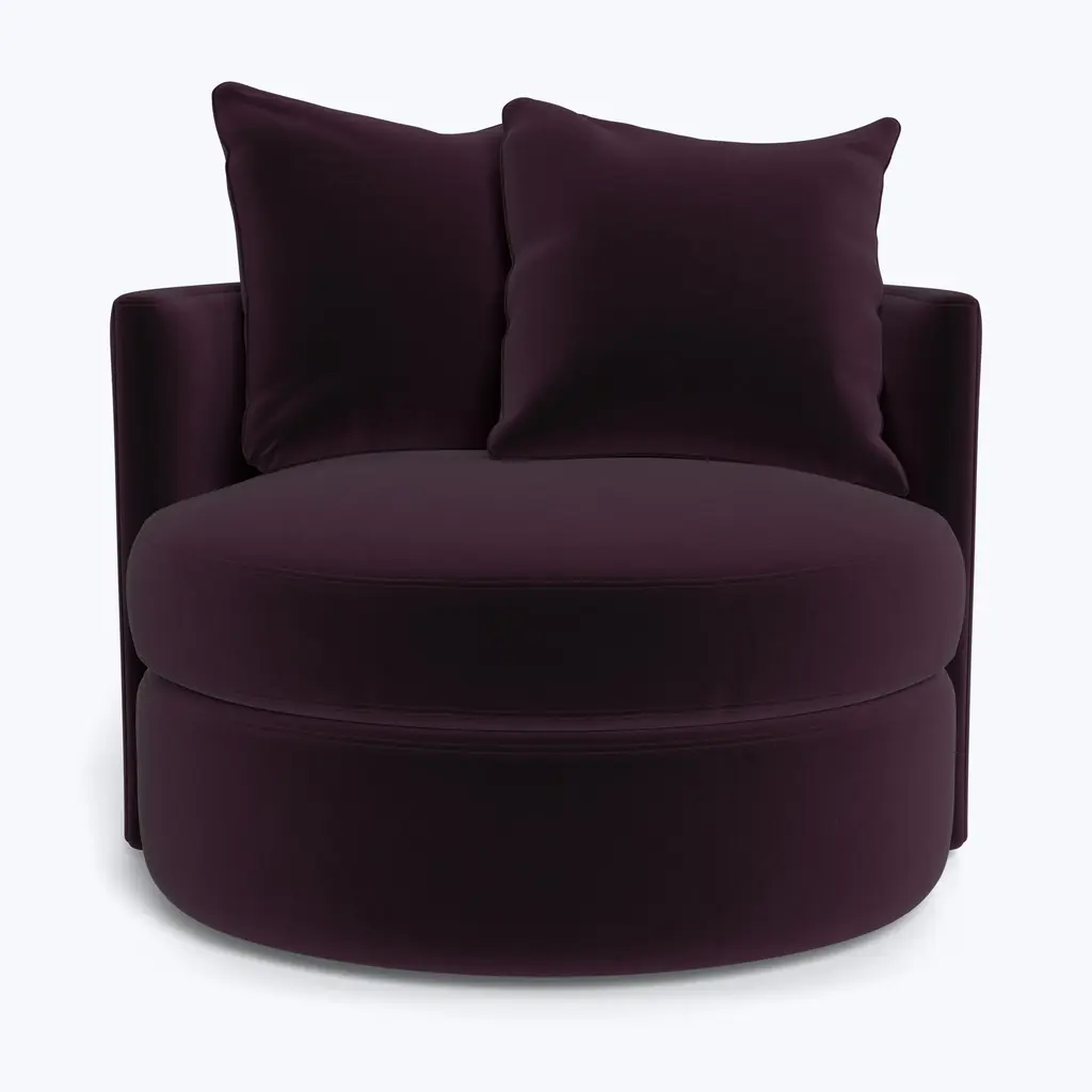 The Hollywood Swivel Chair, exclusively from ABC Carpet & Home, is the ultimate blend of playful elegance and cozy comfort. With its signature curved, round design and plush seating, this chair is perfect for any room where comfort and style meet. Whether you're looking to add a stylish accent to your living room, create a cozy nook in your bedroom, or make a reading corner that’s both functional and inviting, the Hollywood Swivel Chair delivers on all fronts. One of the standout features of this chair is its ability to spin—round, round, round—giving it a playful and dynamic quality that sets it apart from traditional seating options. The Hollywood Swivel Chair is not just designed to sit still; it’s meant to move with you, offering a fun and interactive experience while still maintaining the sophisticated elegance you expect from an exclusive piece at ABC Carpet & Home. The chair comes with two generously filled back pillows, packed with feather and down for that soft, sink-into-me feeling. These pillows provide exceptional support, making the chair a truly snuggle-worthy option for moments of relaxation. Whether you’re curled up with a good book, chatting with friends, or just enjoying a quiet moment, the Hollywood Swivel Chair offers the kind of loungy, cozy seating that makes you want to stay awhile. Crafted with a sustainably sourced Goodwood frame, the chair combines eco-conscious materials with exceptional craftsmanship, ensuring that it not only looks good but is made to last. The soft curves and rounded profile of the chair provide a modern silhouette, blending seamlessly into contemporary or eclectic interiors alike. It’s the kind of chair that commands attention in any room, but its plush seating ensures that it’s not just about looks—it’s designed for pure comfort. Customizing your Hollywood Swivel Chair is easy, with over 80 fabric options available, ranging from luxurious velvets and soft linens to durable blends. You can tailor the chair to suit your unique style and space, making it the perfect fit for your home. Whether you’re looking to create a cozy reading nook, a chic bedroom accent, or a functional piece that adds flair to your living room, the Hollywood Swivel Chair is the perfect choice. Handcrafted and made to order, this chair will be delivered to your home within 8-10 weeks, offering both luxury and comfort in every spin. So whether you're sinking into its soft embrace after a long day or adding a stylish touch to your home decor, the Hollywood Swivel Chair offers a delightful blend of fun and sophistication. It’s not just a chair—it’s a statement piece, a conversation starter, and, above all, a place to get cozy and relax.